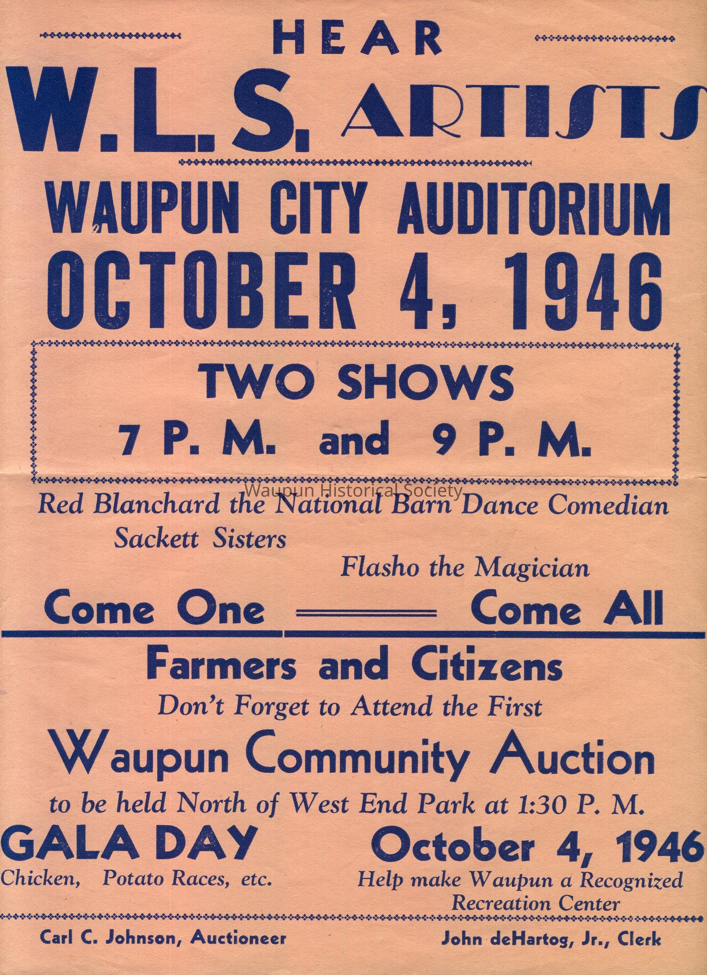 Hear W. L. S. Artists, Waupun City Auditorium, October 4, 1946. Two Shows 7 PM and 9 PM. Red Blanchard the National Barn Dance Comedian, Sackett Sisters, Flasho the Magician. Farmers and Citizens don't forget to attend the first Waupun Community Auction to be held North of West End Park at 1:30 PM. Gala Day: October 4, 1946. Chicken, Potato Races, etc. Help make Waupun a Recognized Recreation Center. Carl C. Johnson, Auctioneer; John deHartog, Jr., Clerk.Acquisition