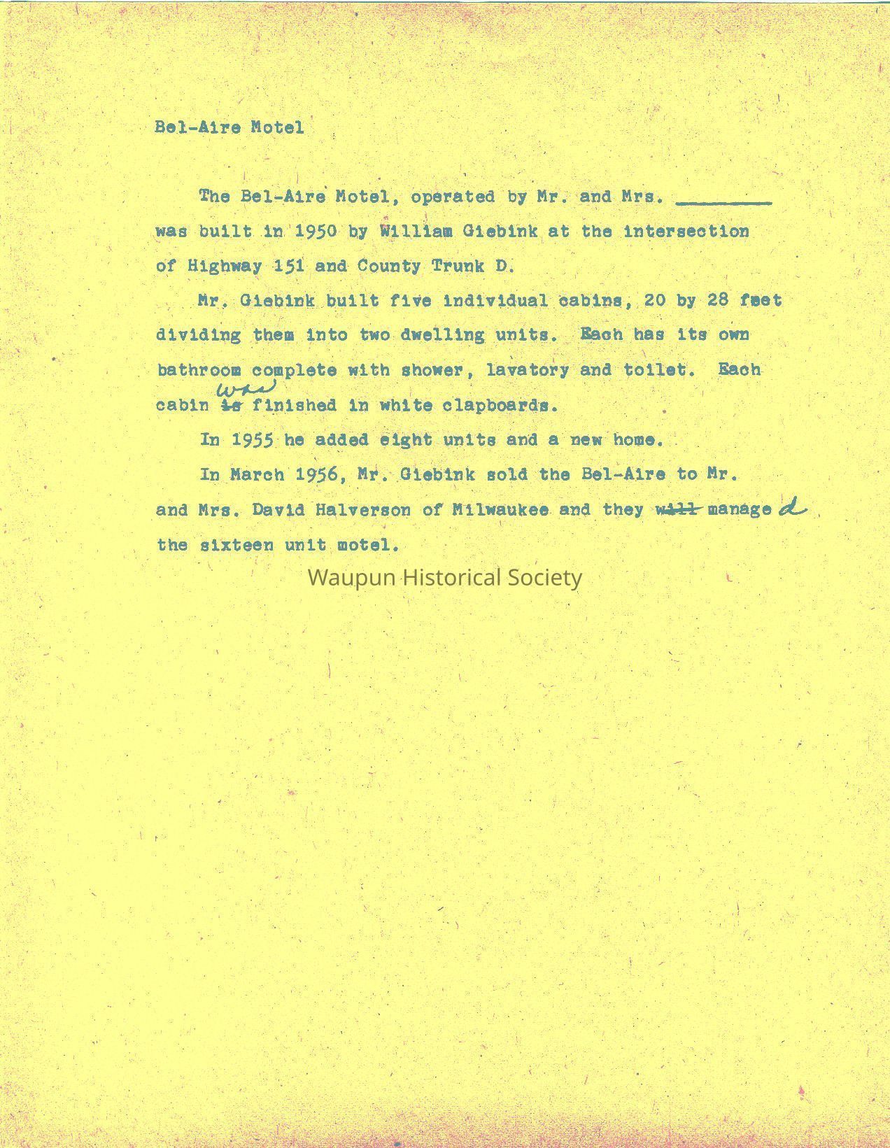 In March 1956, Mr. Giebink sold the Bel-Aire to Mr. and Mrs. David Halverson of Milwaukee and they managed the sixteen unit motel.Acquisition