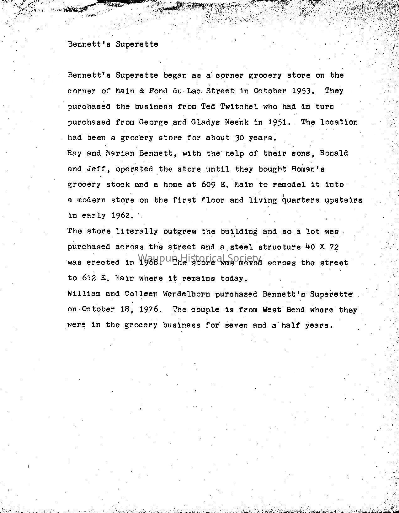 William and Colleen Wendelborn purchased Bennett's Superette on October 18, 1976. The couple is from West Bend where they were in the grocery business for seven and a half years.Acquisition