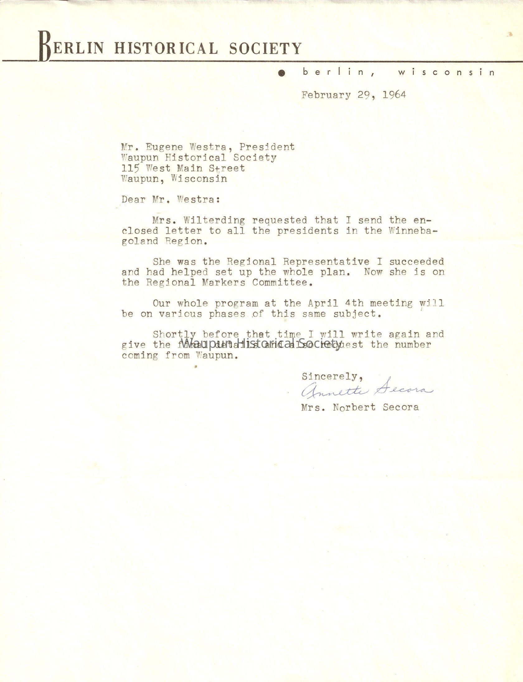 Waupun Historical Society, Berling historical Society, 1964Entry/Object ID