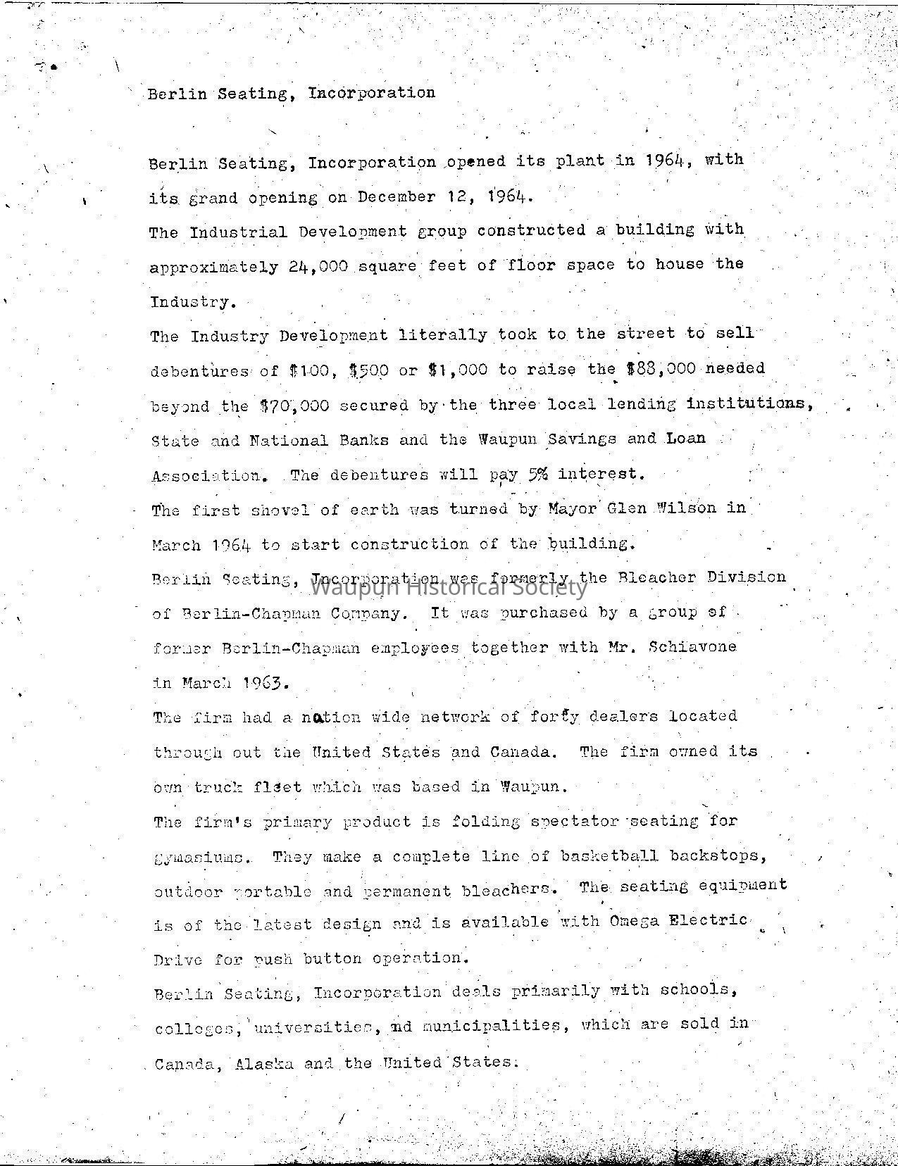 Berlin Seating, Incorporation, opened its plant in 1964, with its grand opening on December 12, 1964.