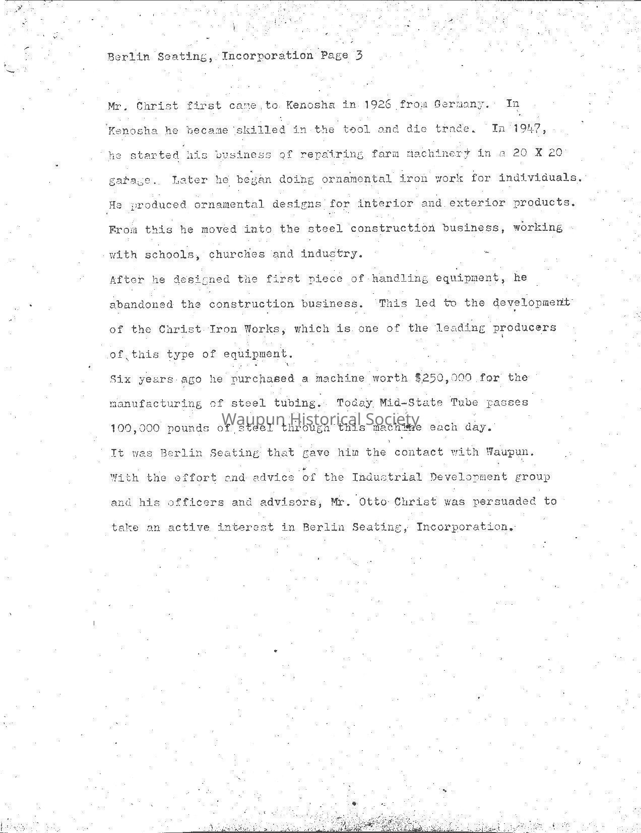 On September 6, 1973, Otto Christ, of Christ of Iron Works and Mid-State Tube of Kenosha obtained controlling interest of Berlin Seating. At that tine Jim Olson was president and Mr. Christ took the position of vise president and treasurer.