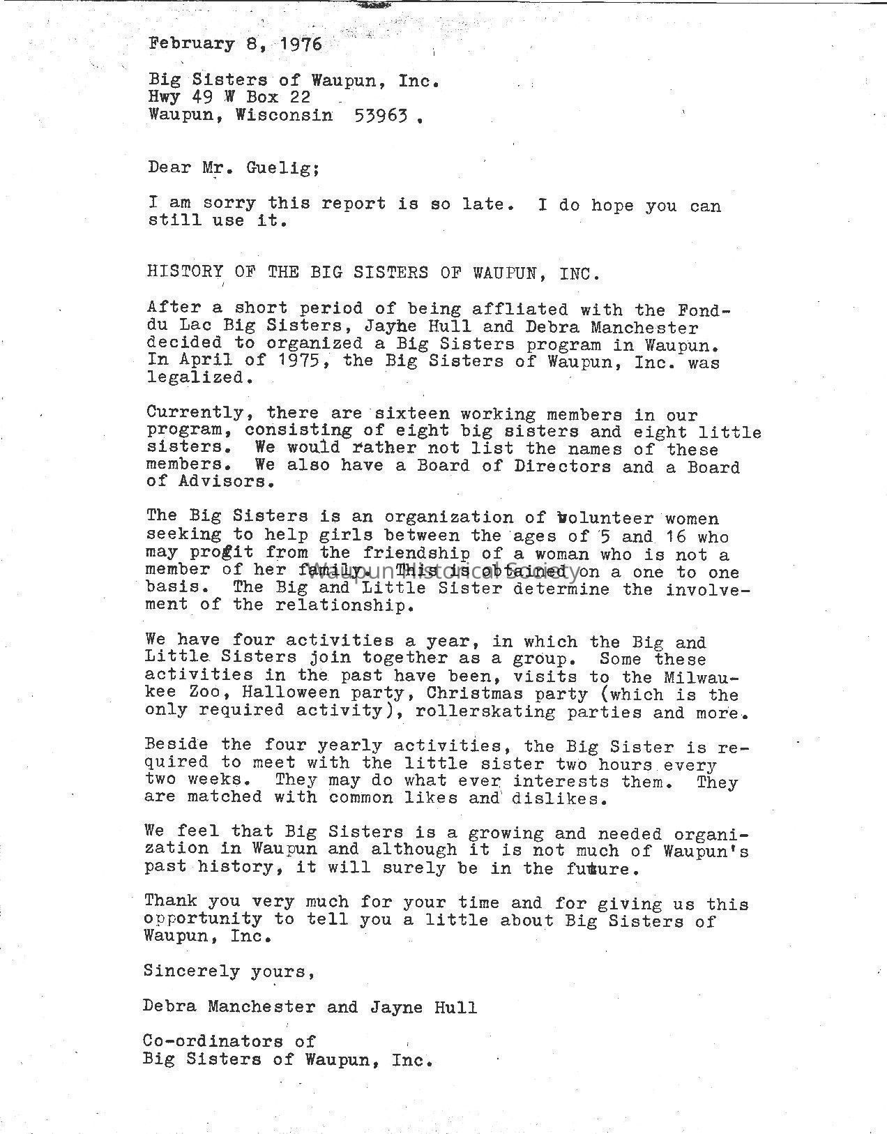 After a short period of being afflicted with the Fond du Lac Big Sisters, Jayne Hull and Debra Manchester decided to organized a Big Sisters program in Waupun. In April of 1975, the Big Sisters of Waupun, Inc. was legalized.