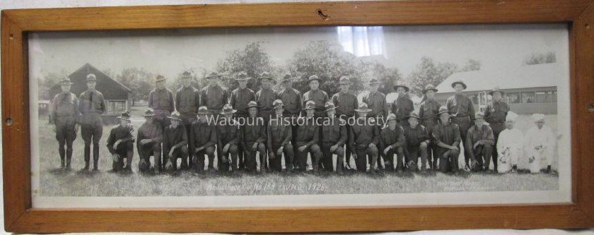23" x 8" black and white photo of the national guard 135 Medical Reg, Ambulance Co. Photo Art House of Madison/Milwaukee took the photo. Photo is framed in brown wooden frame with glass.Acquisition