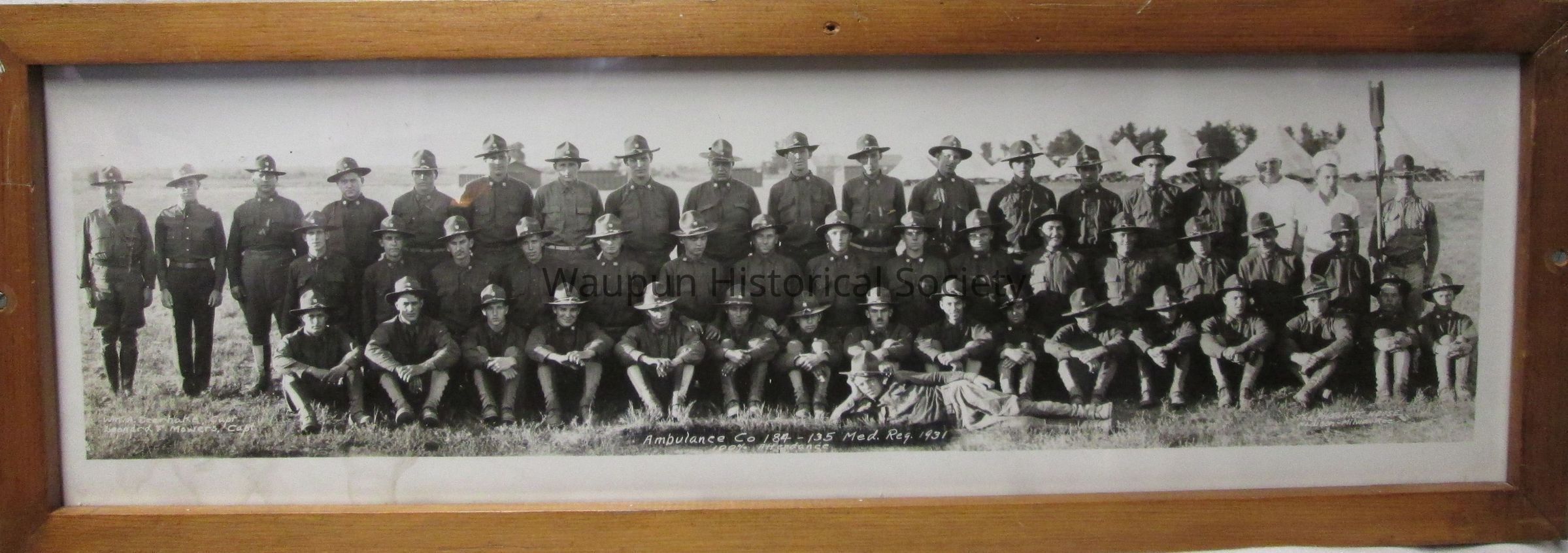 25.5" x 8" Black and white photo of National Guard 135th Medical Reg. Ambulance Co. 184. Photo was taken in 1931 by Phot Art House Madison-Milwaukee, WI. Noted on the picture are the names of two Captains; WM.A. Deerhake and Leonard F. Mowers. Photo is framed in brown wooden frame with glass.Acquisition