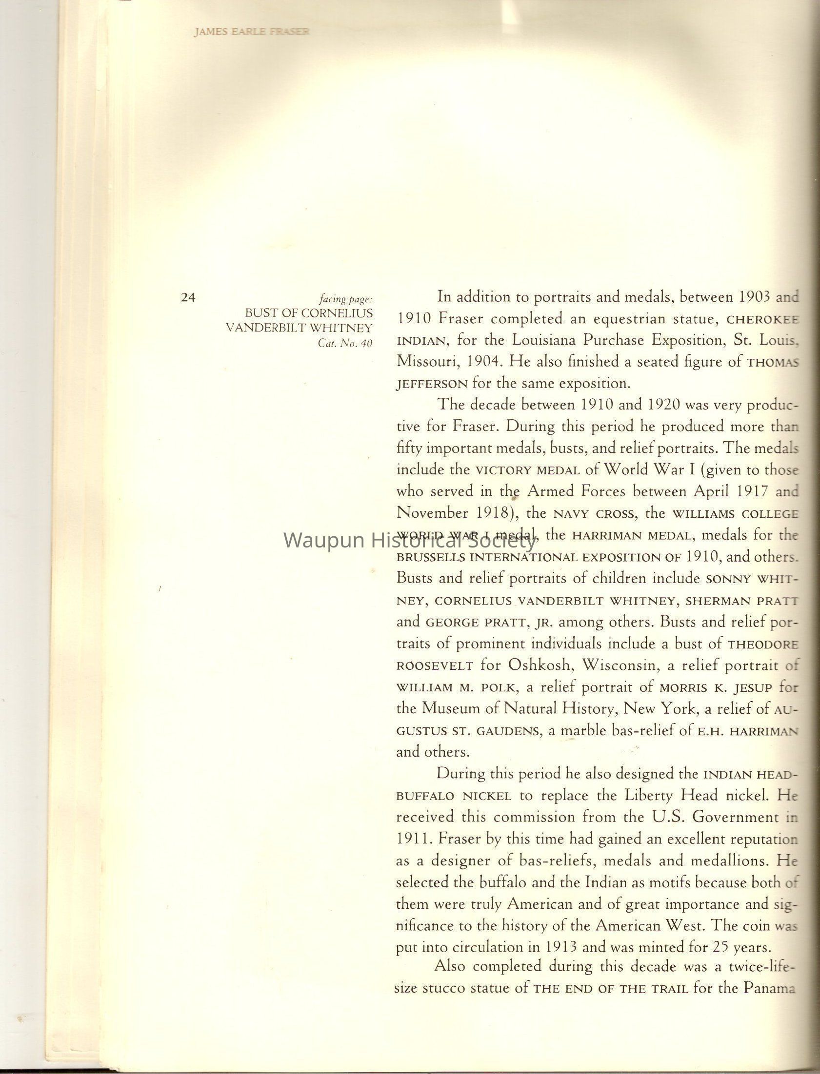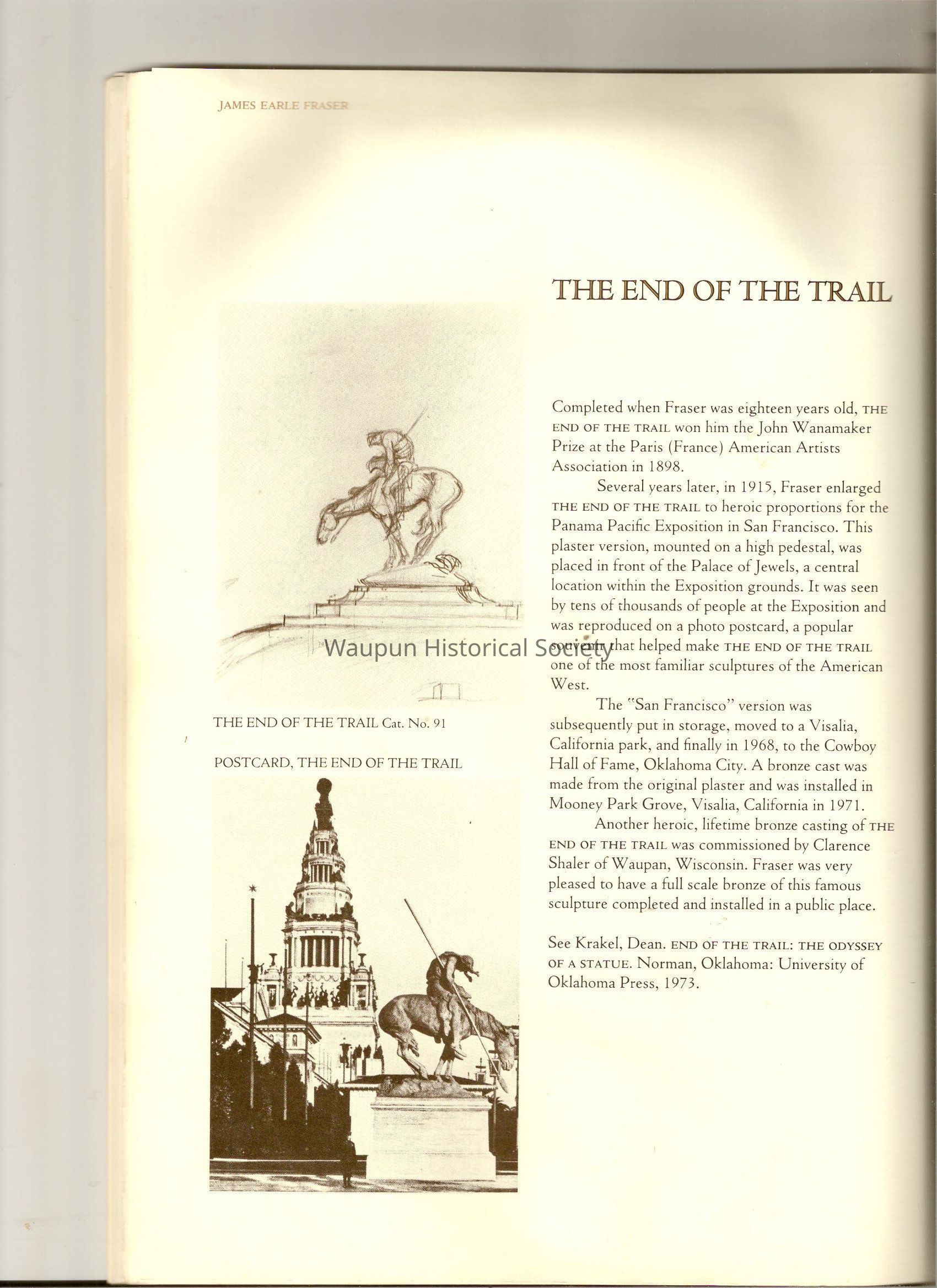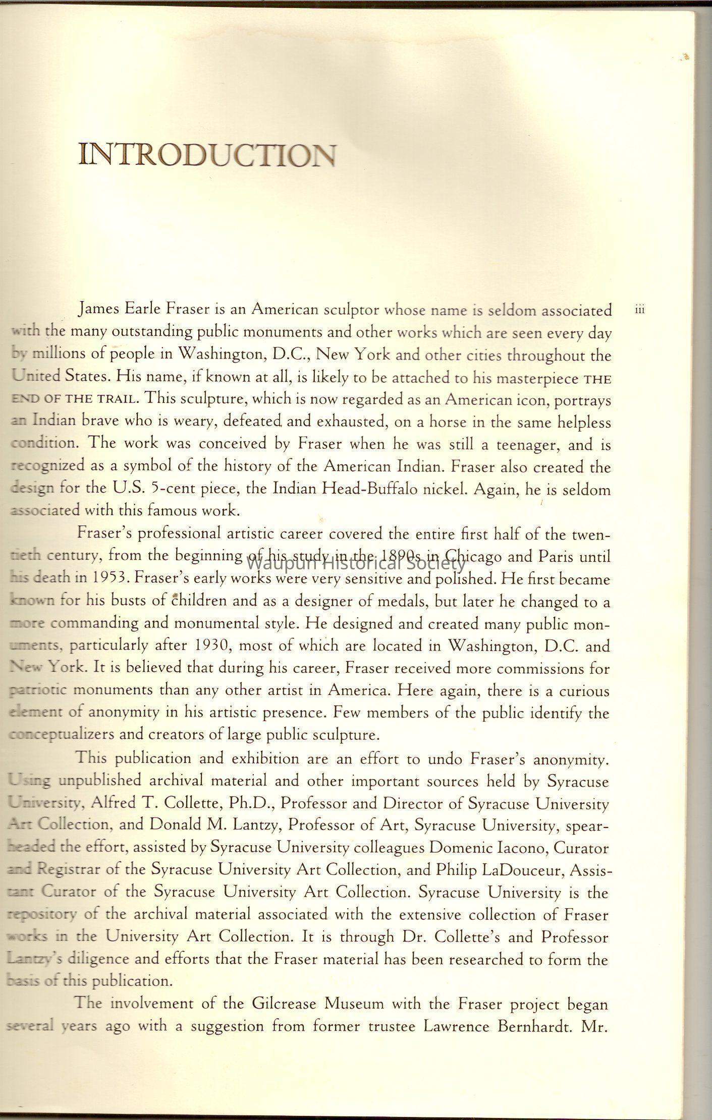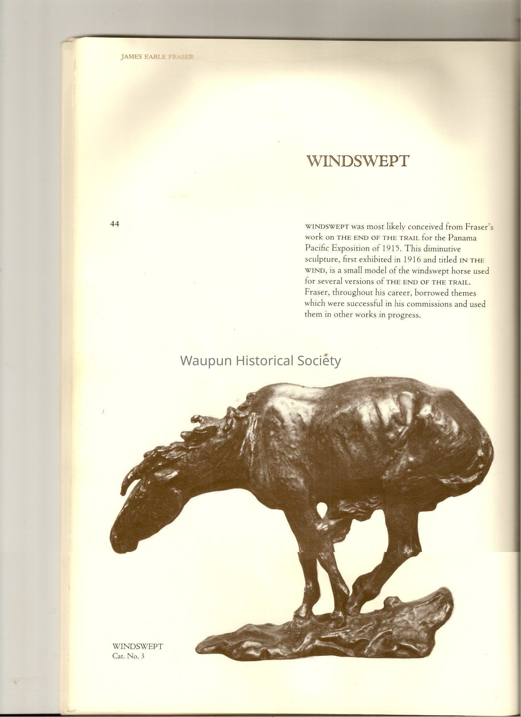 A Book of James, Earle Fraser is a American sculptor whose name was seldom associated with the many outstandinding public monuments and other work which are seen every day by millions of people in Washington D.C., New York and other city thought out the united states.Acquisition