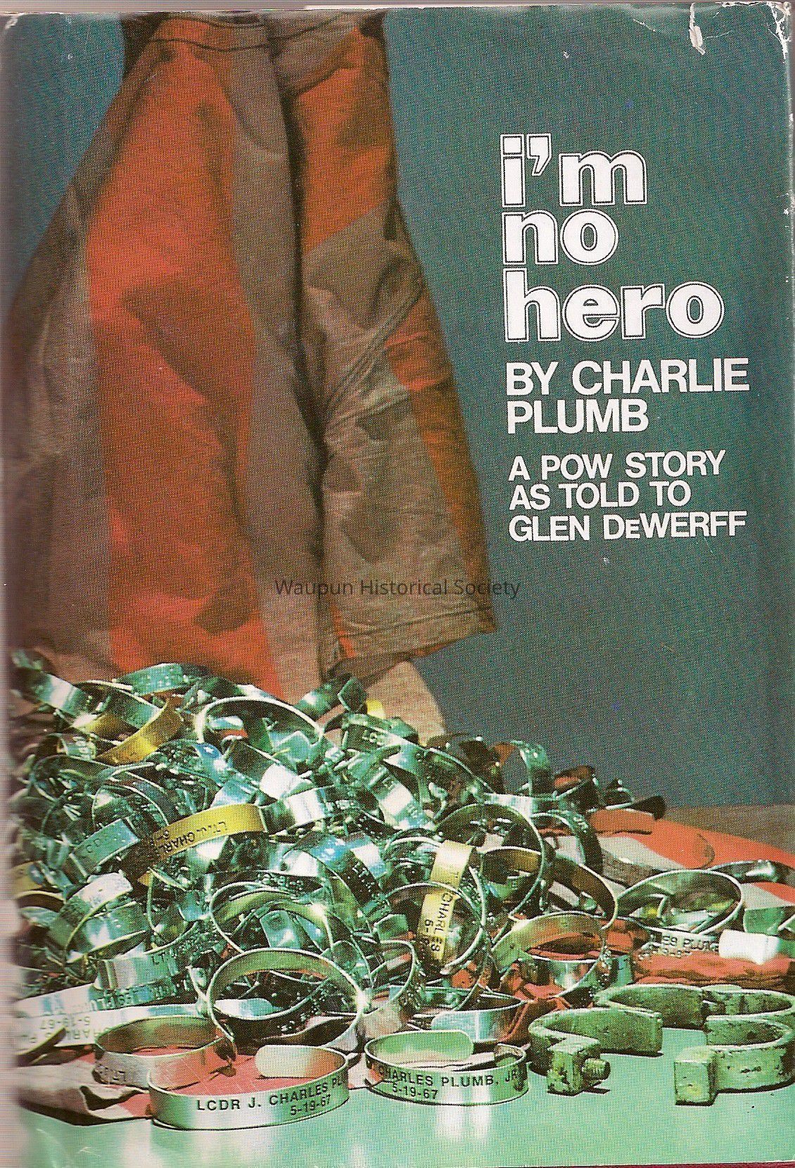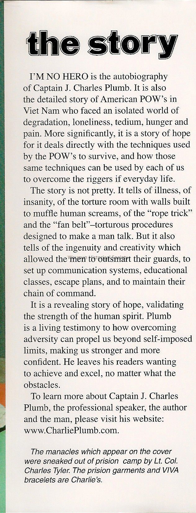Written on the inside cover: "the story, I'M NO HERO is the autobiography of Captain J. Charles Plumb. It is also the detailed story of American POW's in Viet Nam who faced an isolated world of degradation, loneliness, tedium, hunger and pain. More significantly, it is a story of hope for it deals directly with the techniques used by the POW's to survive, and how those same techniques can be used by each of us to overcome the riggers if everyday life.