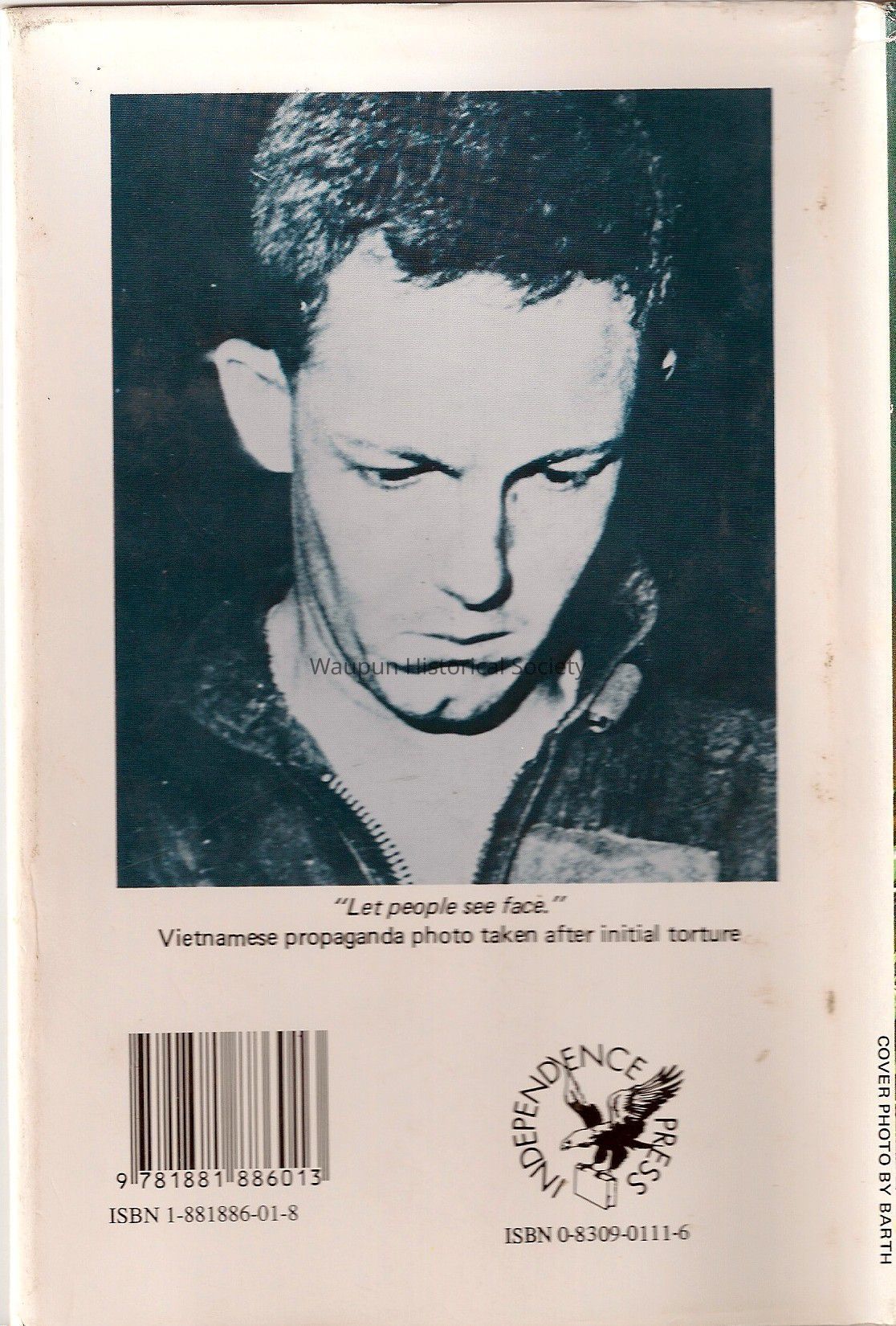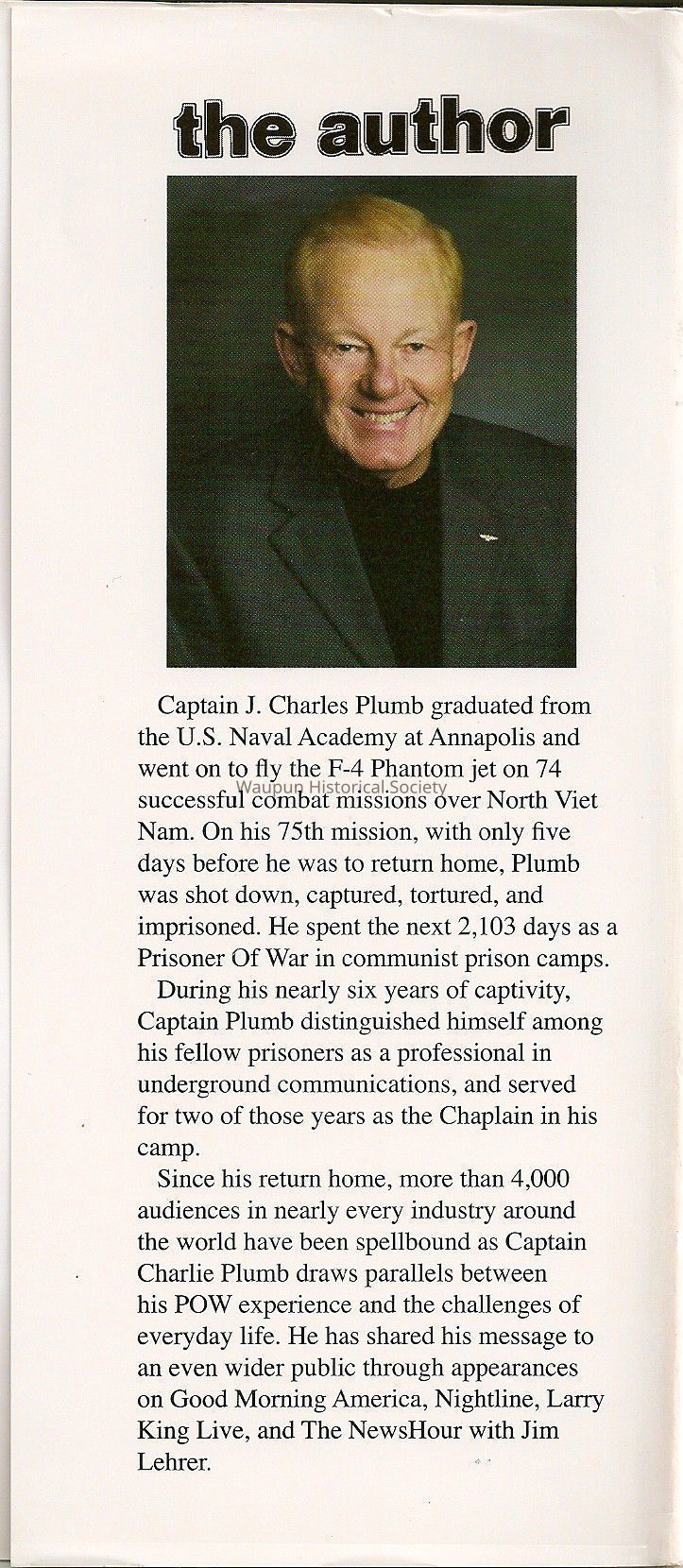 Written on the inside back cover: "the author, Captain J. Charles Plumb graduated from the U.S. Naval Academy at Annapolis and went on to fly the F-4 Phantom jet on 74 successful combat missions over North Viet Nam. On his 75th mission, with only five days before he was to return home, Plumb was shot down, captured, tortured, and imprisoned. He spent the next 2,103 days as a Prisoner Of War in communist prison camps.
