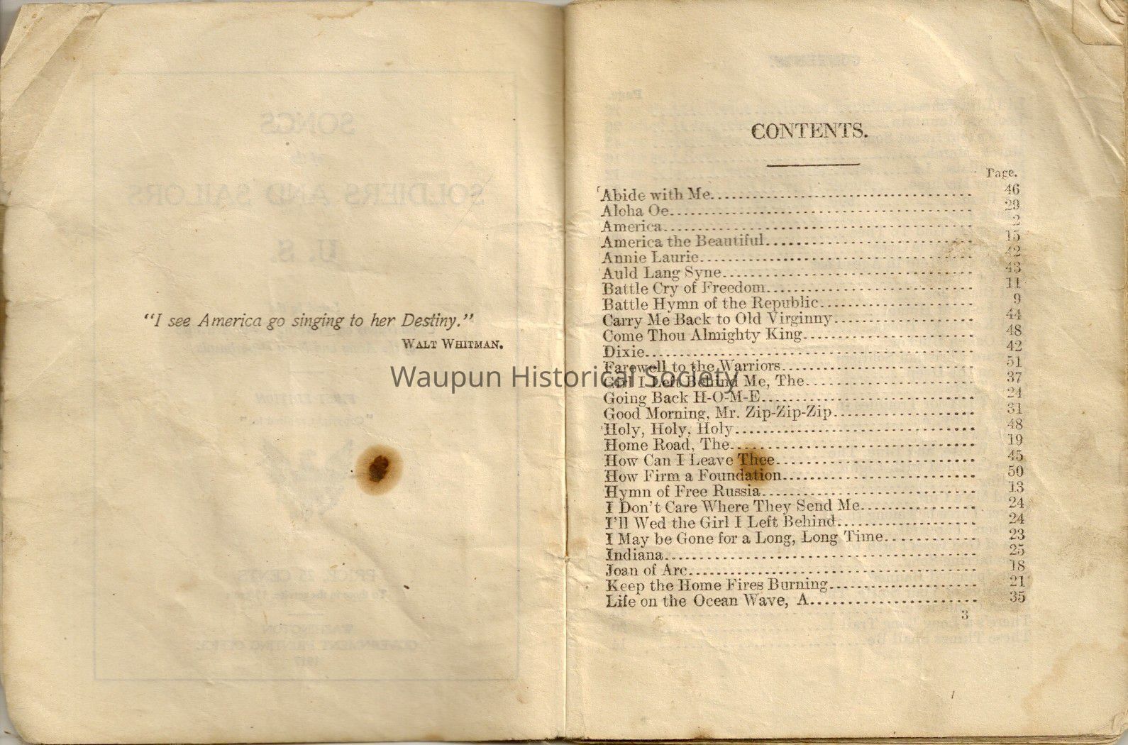 Containing a table of contents and a quote by Walt Whitman, this compilation of songs doesn't have a particular author/writer, but indicates the government printing office in Washington, was responsible for this publication dated 1917.