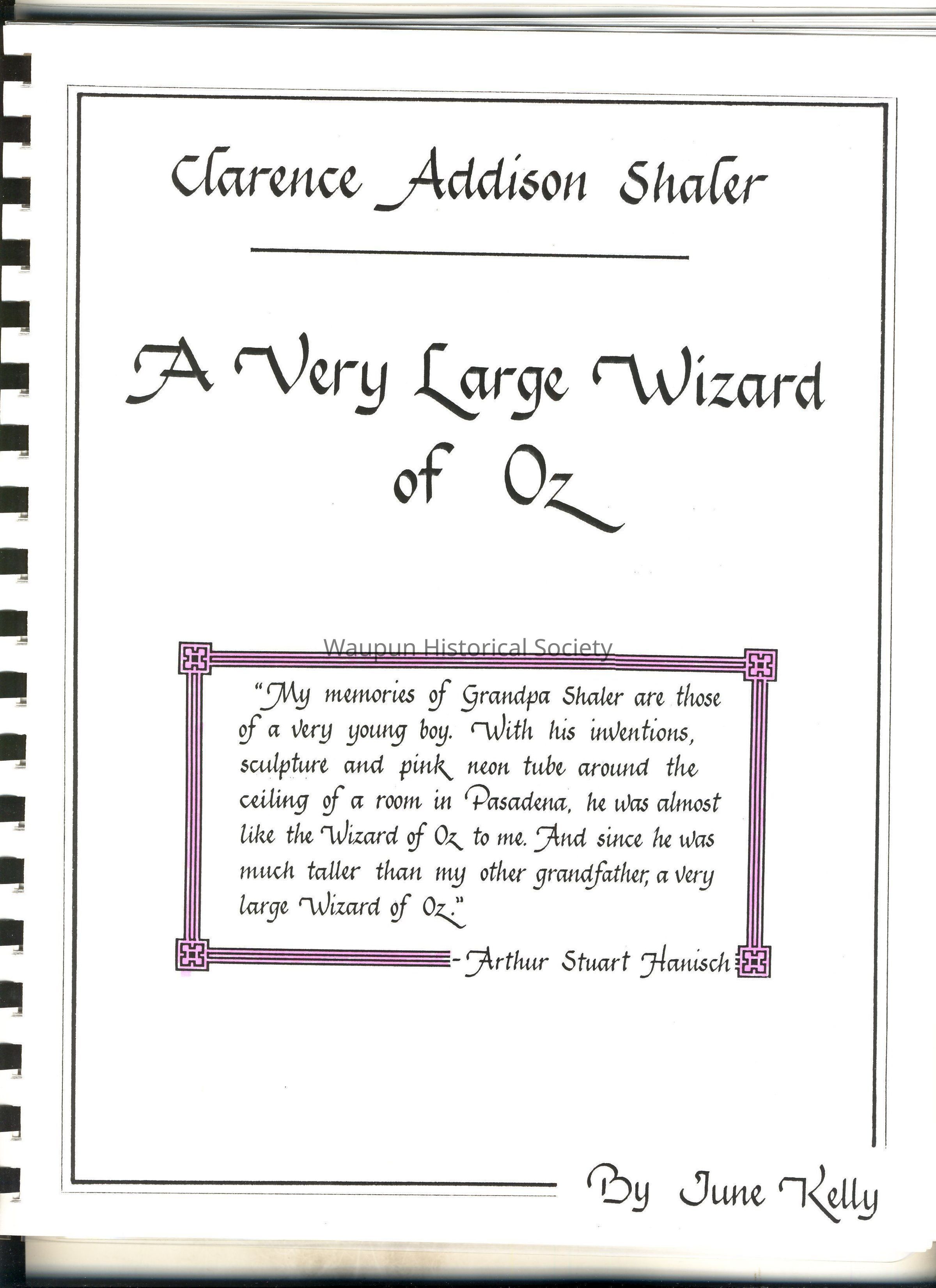 Paperbound booklet entitled, "A Very Large Wizard of Oz" by Clarence Addison Shaler by June Kelly. It has a clear plastic cover and bound with a black plastic spiral clamp. Donated by June Kelly.