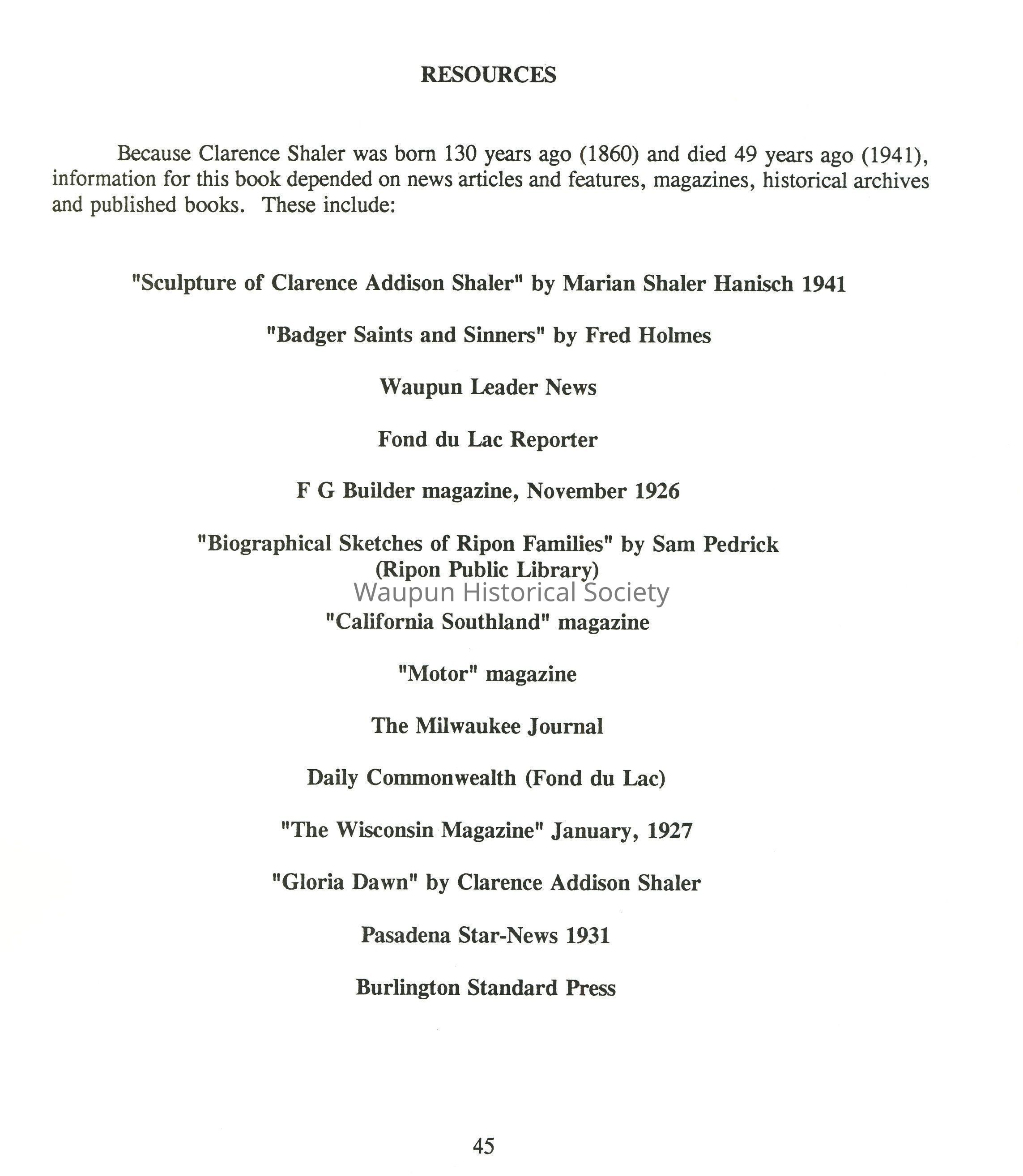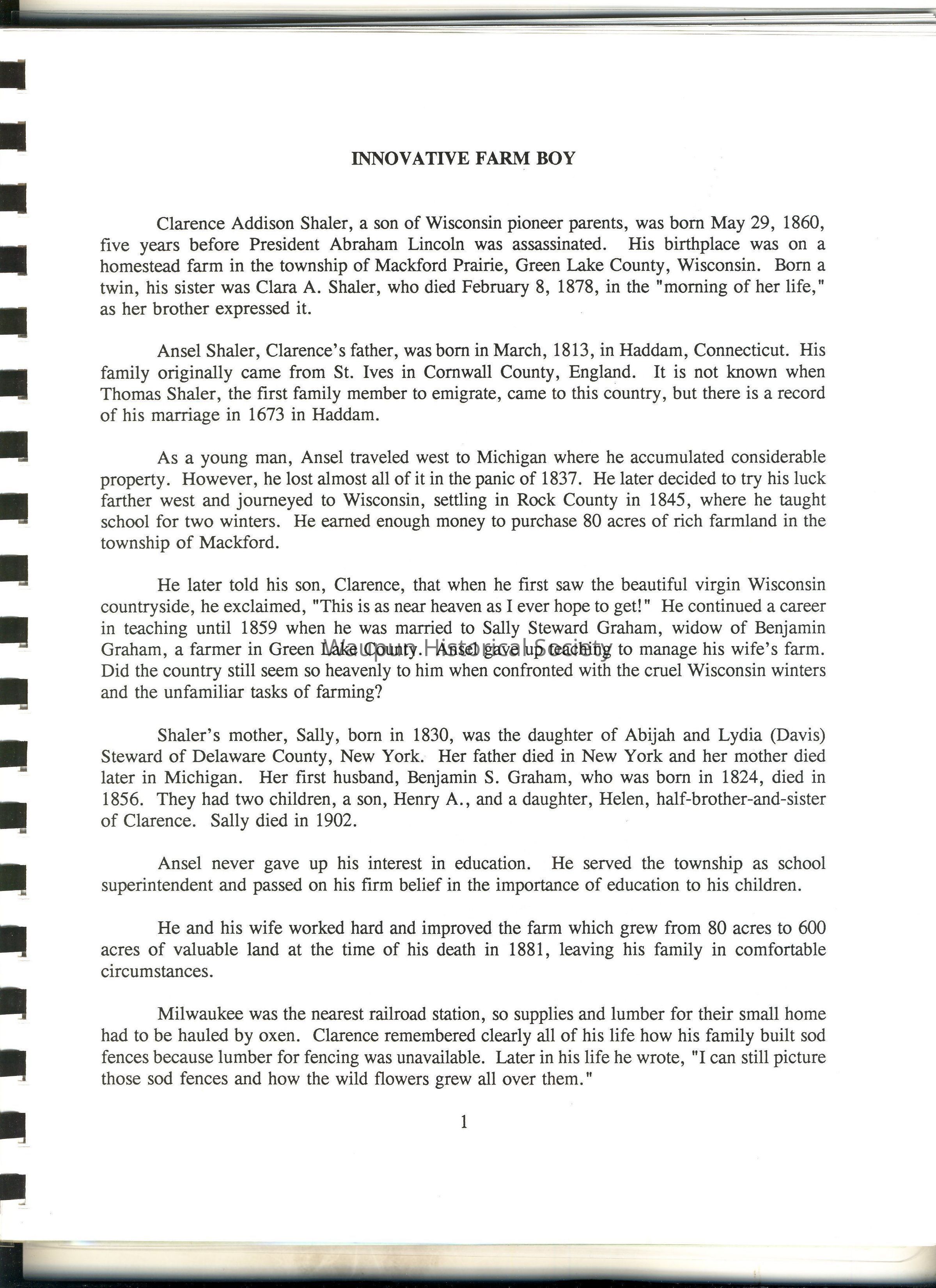 Clarence Addison Shaler, a son of Wisconsin pioneer parents, was born May 29, 1860, five years before President Abraham Lincoln was assassinated. His birthplace was on a homestead farm in the township of Mackford Prairie, Green Lake County, Wisconsin. Born a twin, his sister was Clara A. Shaler, who dies February 8., 1878, in the "morning of her life," as her brother expressed it.c