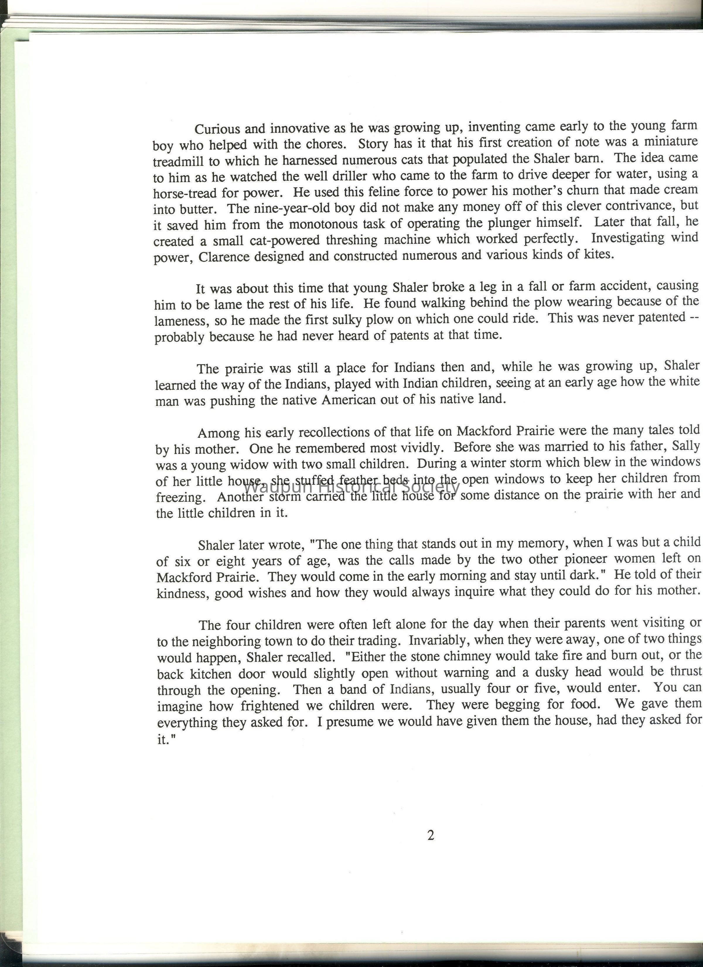 Shaler later wrote, "The one thing that stands out in my memor, when I was but a child of six or eight years of age, was the calls made by the two other pioneer women left on Macford Prairie. They would come in he early morning and stay until dark." He told of their kindness, good wishes and how they would always inquire what they could do for his mother.