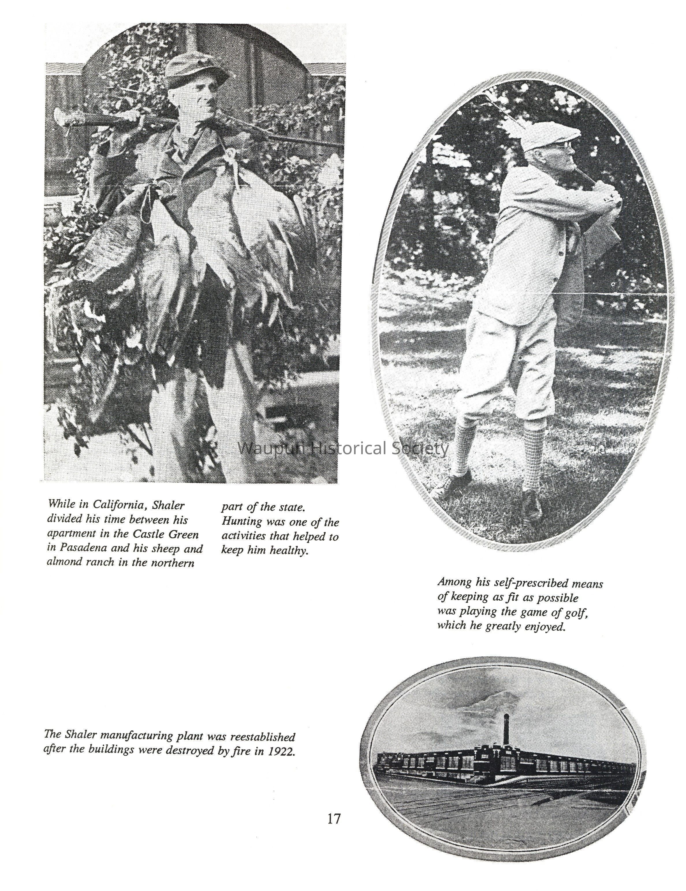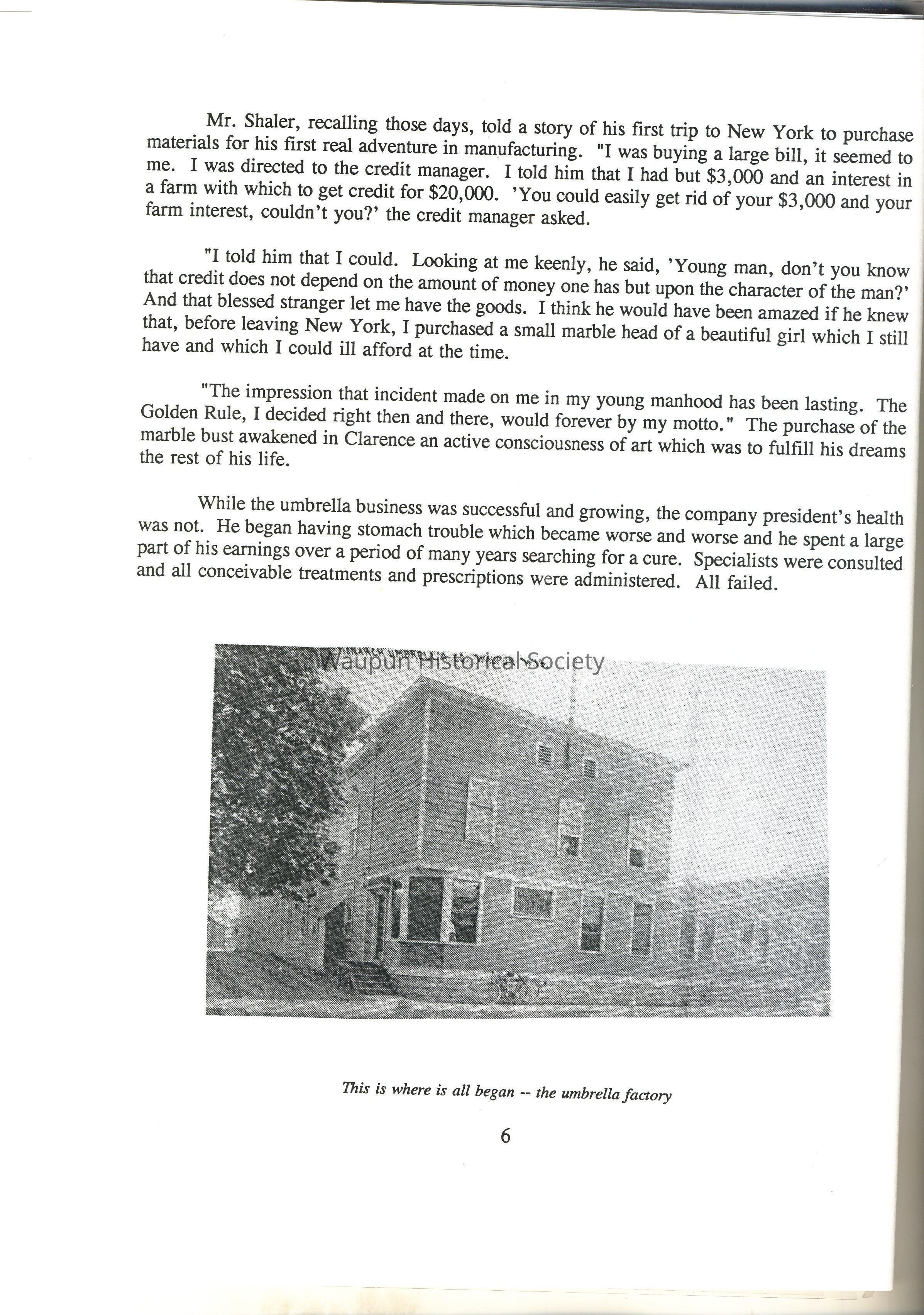 The Shaler Umbrella Company leased a building from Breyer Bros. Whiting Company and was located there temporarily, following the fire. At the time of the fire, Mr. Shaler, still president of the company, was in California, where he had been spending his winters for a number of years. He did not return immediately, but wired company officials to proceed at once in using their best judgement toward reestablishing the plant in Waupun.