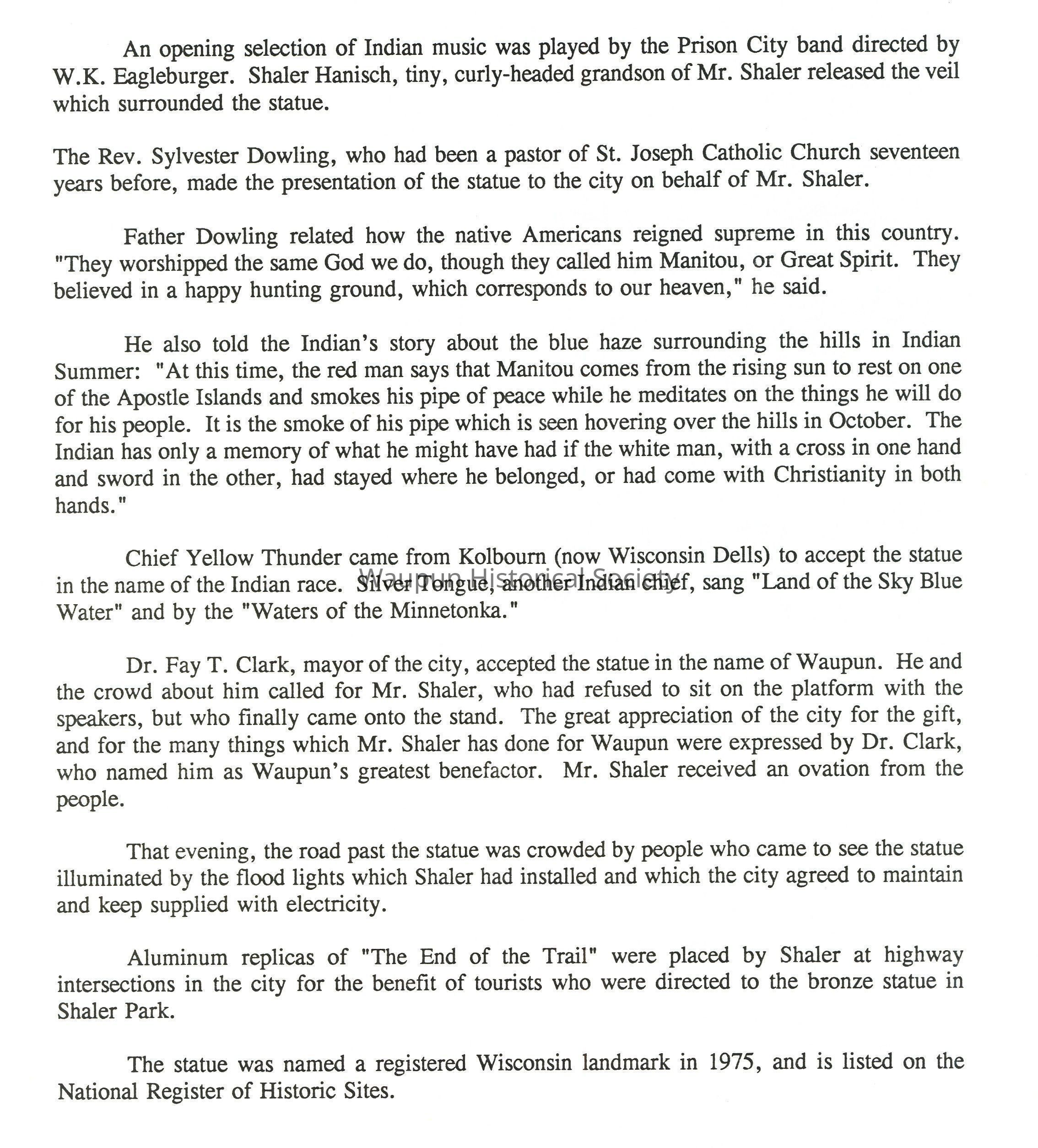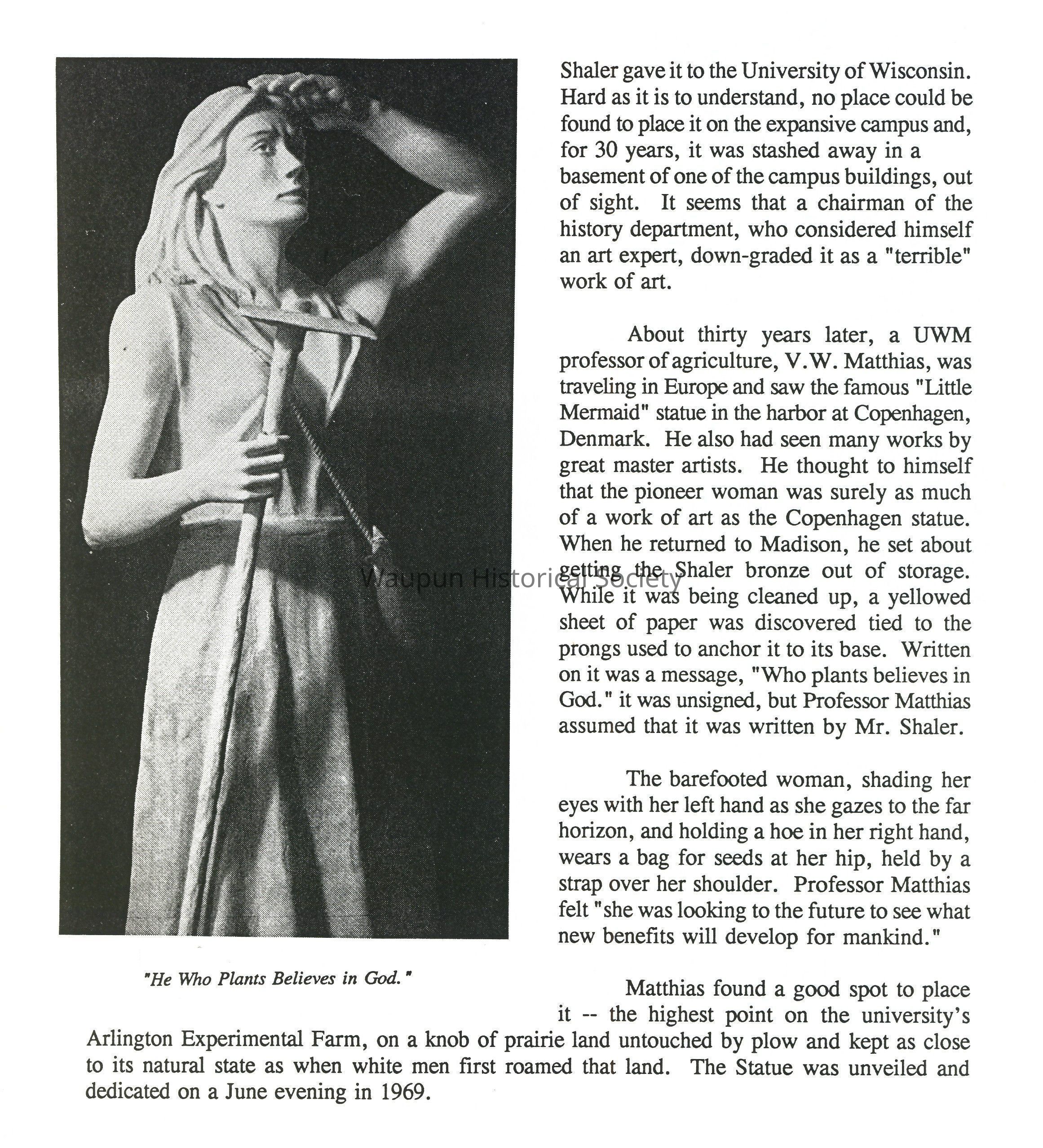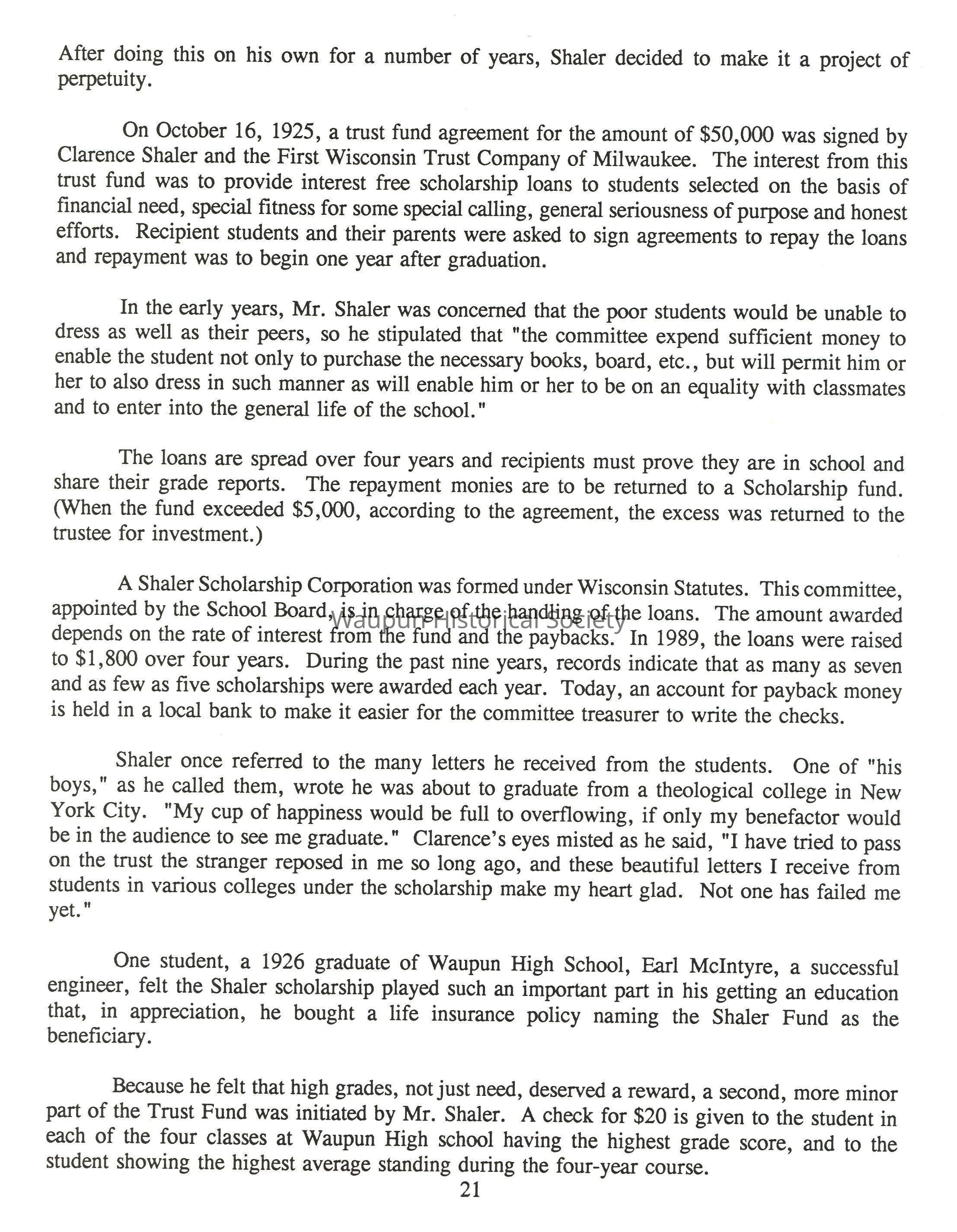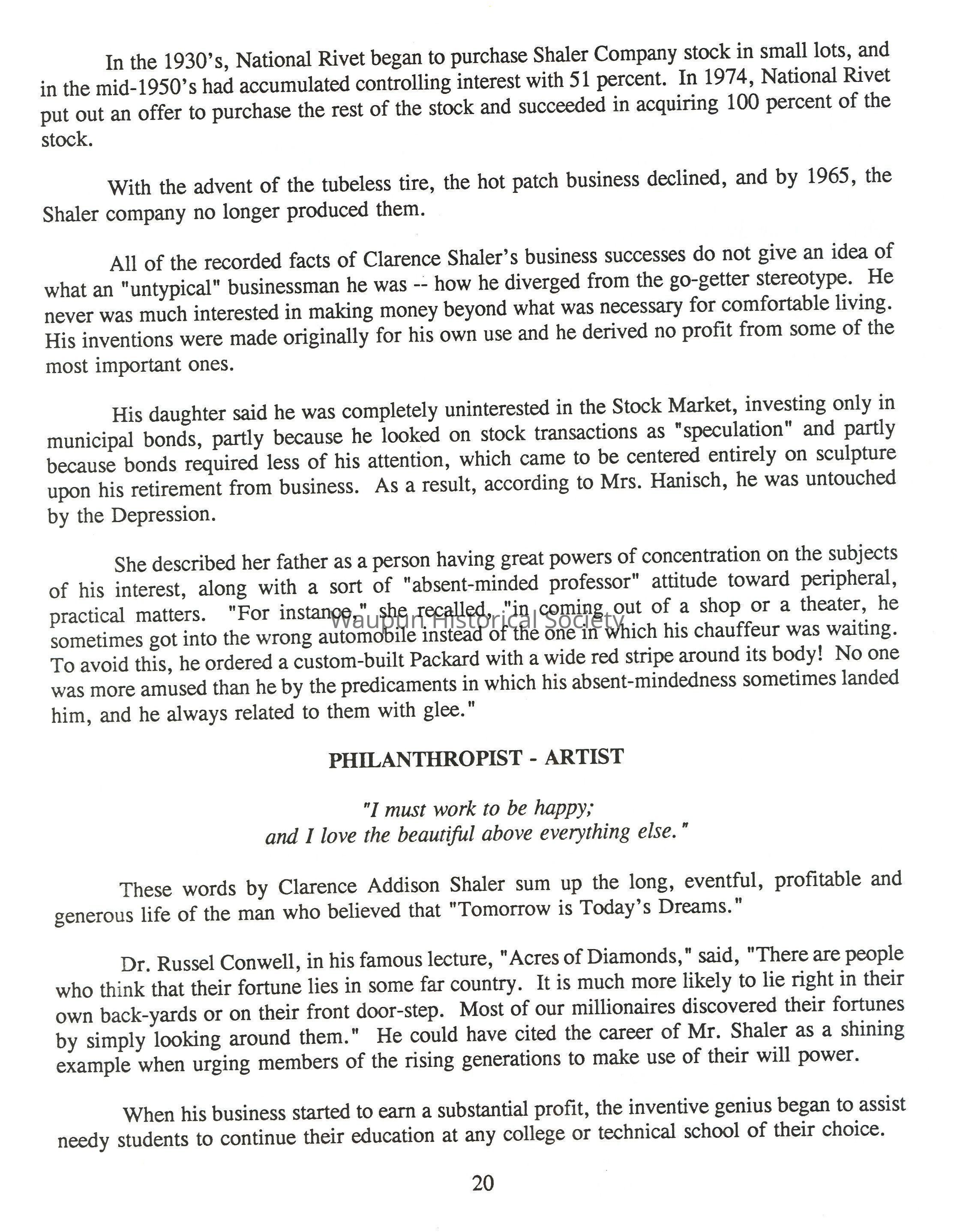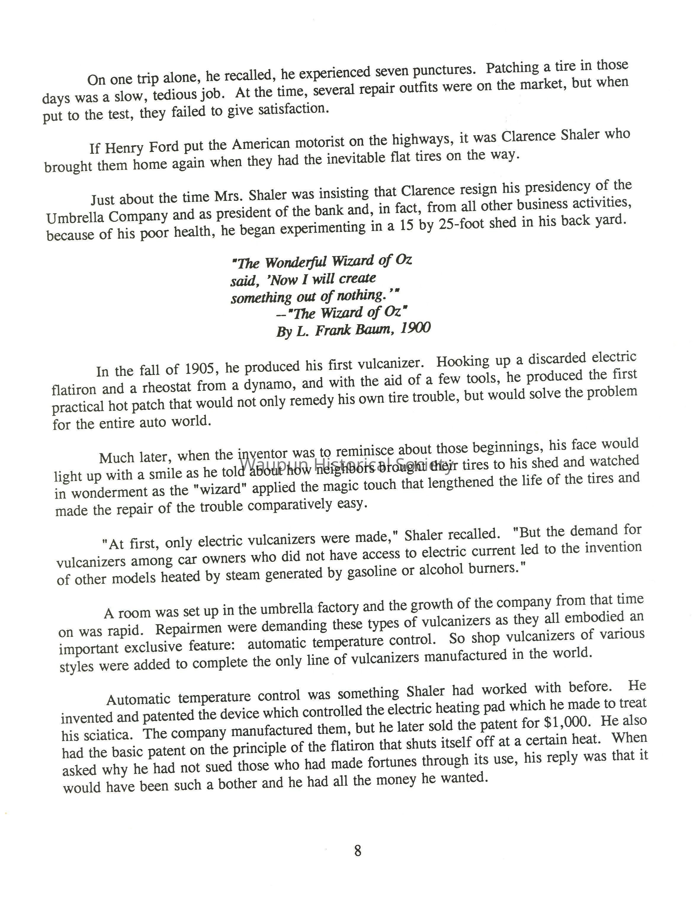 Prior to Shaler's move to Waupun, that city had been making some industrial effort, according to a writer for the Wisconsin Magazine. "But like every other city with a Main Street, the name Waupun, for the most part, was confined to a railway station and a post office marker. With the coming of Clarence A. Shaler, came new life. His indomitable courage and keen foresight, coupled with the talents of an inventive mind, gave him a rare combination of qualifications for leadership," he wrote. Henry Ford once said, "The inventor is a prince of progress." Shaler the inventor was destined to put the name of Waupun before the commercial world, and brought economic progress to the city.