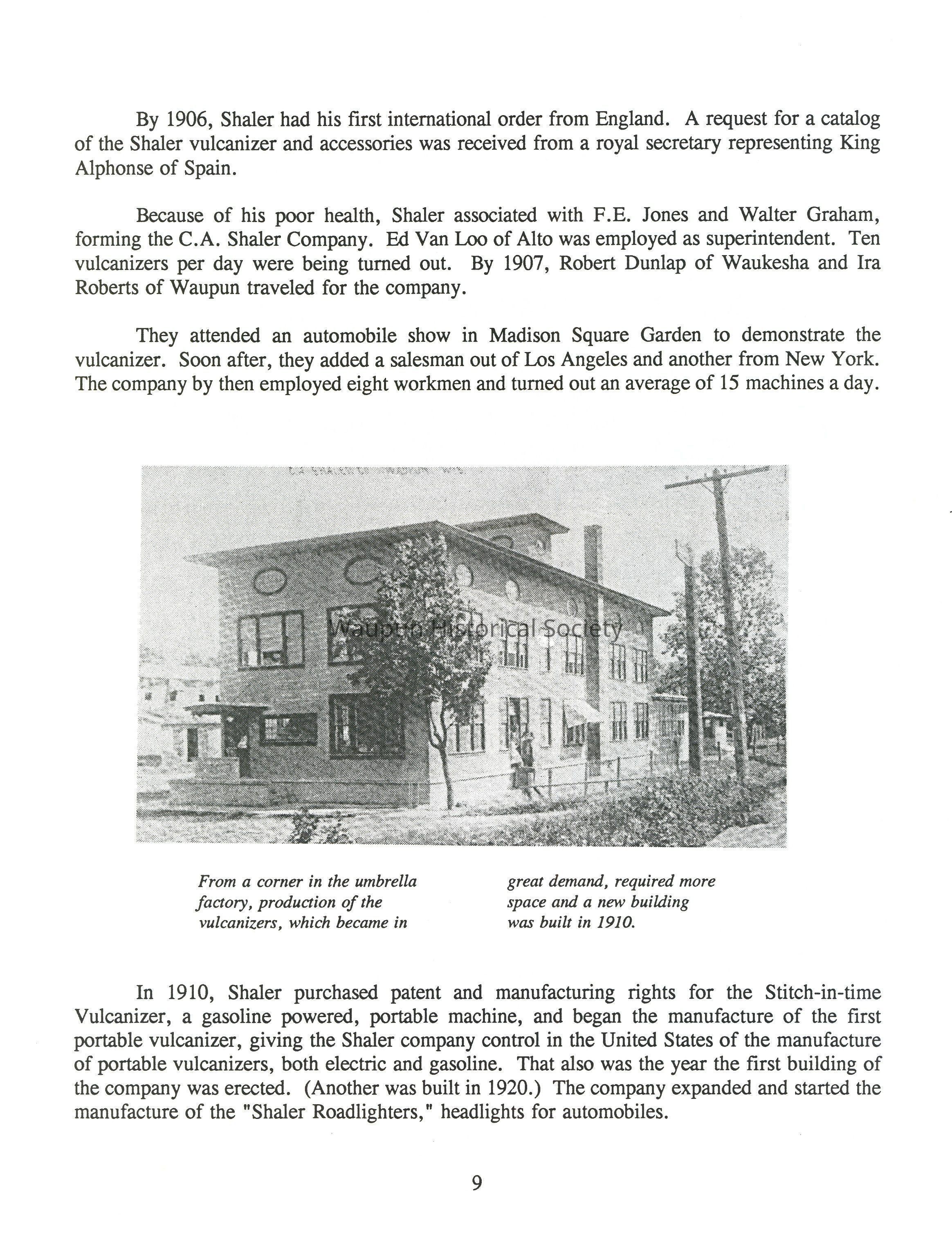 Because of his poor health, Shaler associated with F.E. Jones and Walter Graham, forming the C.A. Shaler Company. Ed Van Loo of Alto was employed as superintendent. Ten vulcanizers per day were being turned out. By 1907, Robert Dunlap of Waukesha and Ira Roberts of Waupun traveled for the company.
