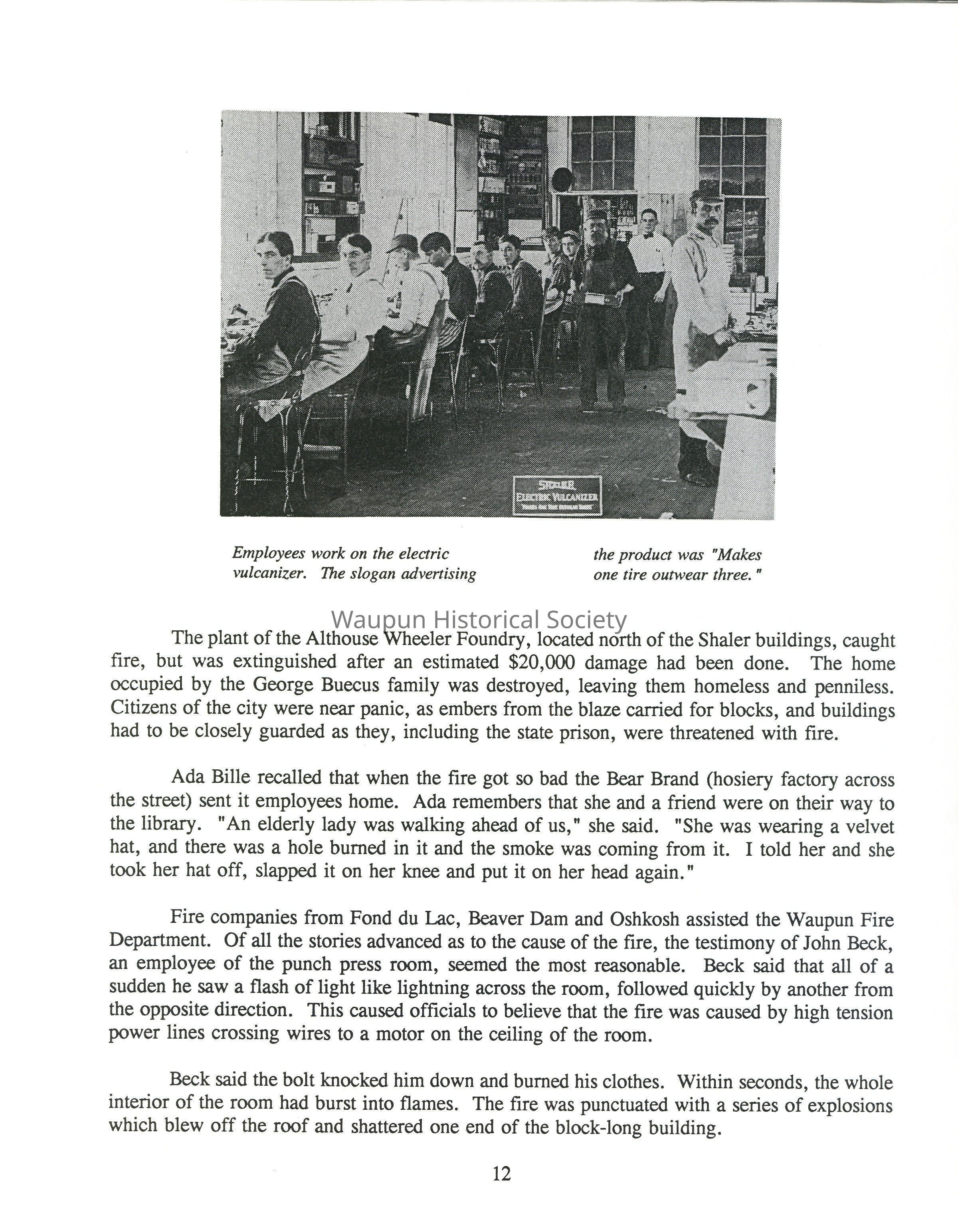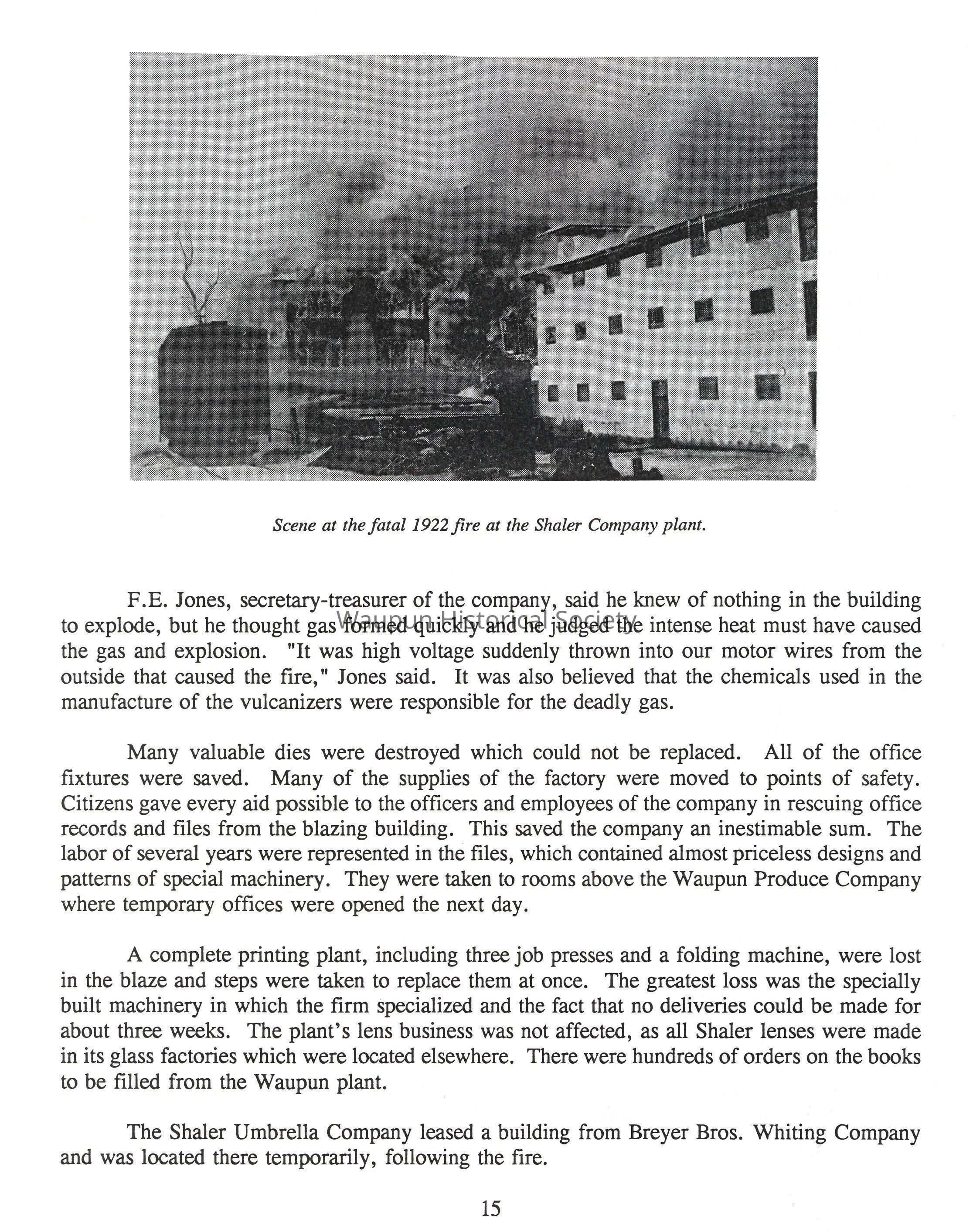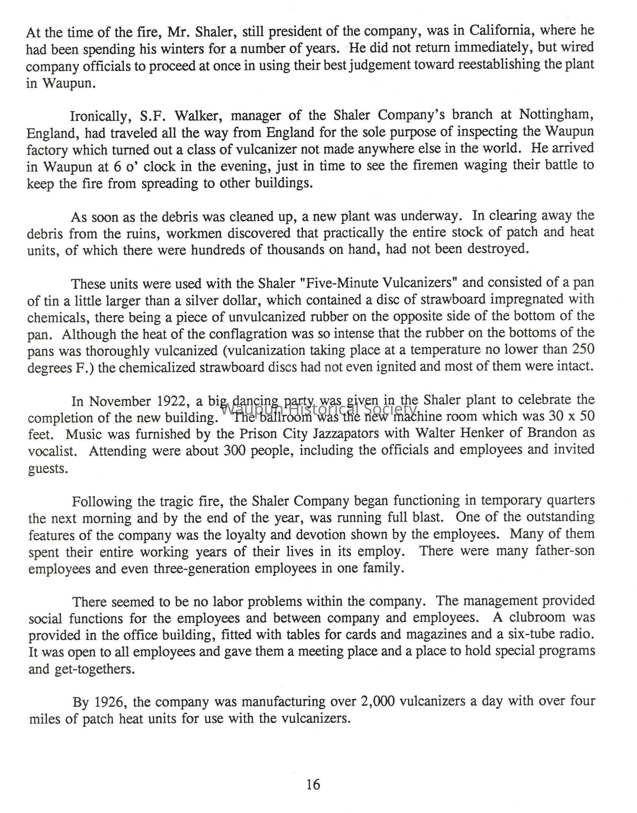 Ironically, S.F. Walker, manager of the Shaler Company's branch at Nottingham, England, had traveled all the way from England for the sole purpose of inspecting the Waupun factory which turned out a class of vulcanizer not made anywhere else in the world. He arrived in Waupun at 6 o' clock in the evening, just in time to see the firemen waging their battle to keep the fire from spreading to other buildings.