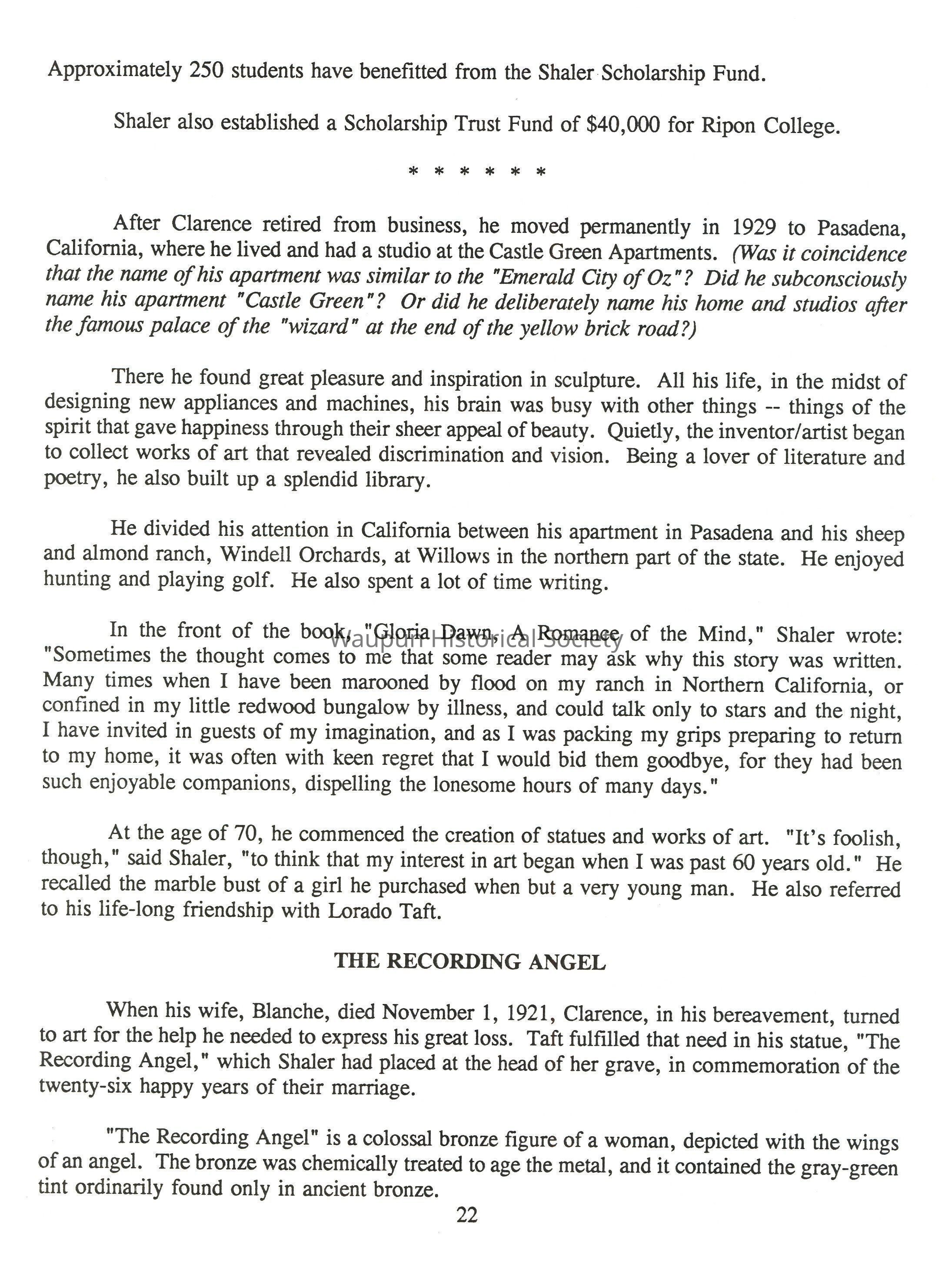When the Shaler children were 14 years of age, the family moved to Ripon, Wisconsin, so they could attend the Prep School at Ripon College, which they did from 1874 to 1877. Although Ansel continued to operate the family farm, they resided on Ransom Street between Watertown and Howard streets.