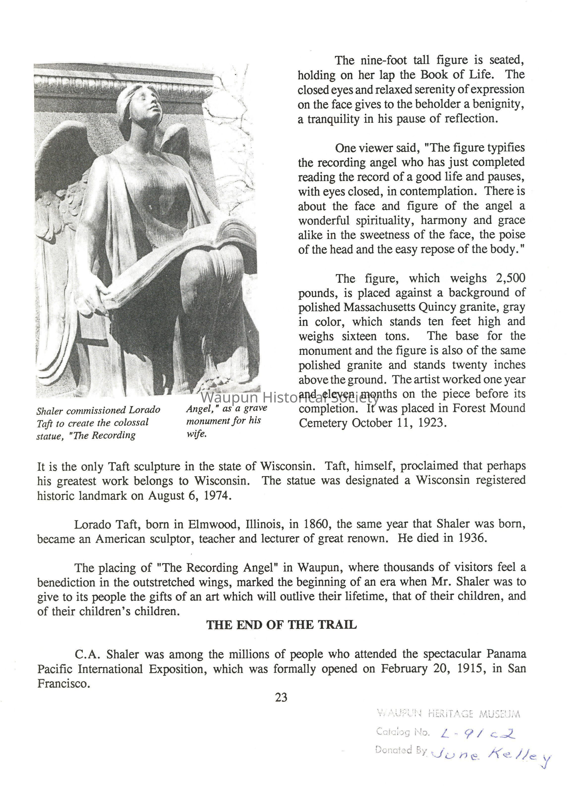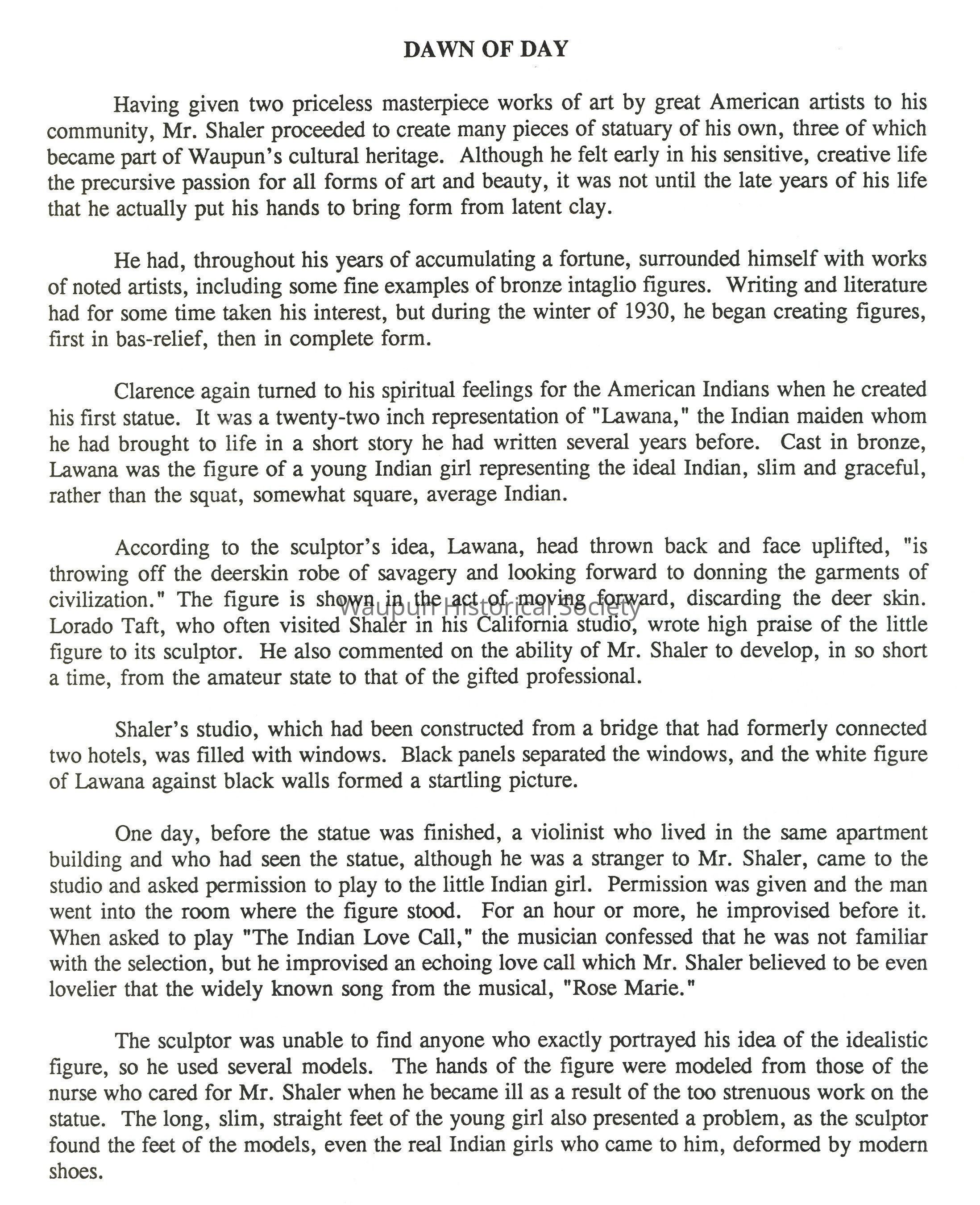 It was during a period of illness that Shaler, in Chicago for medical treatment, accidentally wandered into the studios (which happened to be in the same building) of the sculptor, Lorado Taft, and was held spellbound by the messages of love and beauty which his works had to offer. The two men struck up a life-long friendship, having the love of sculpture in common.