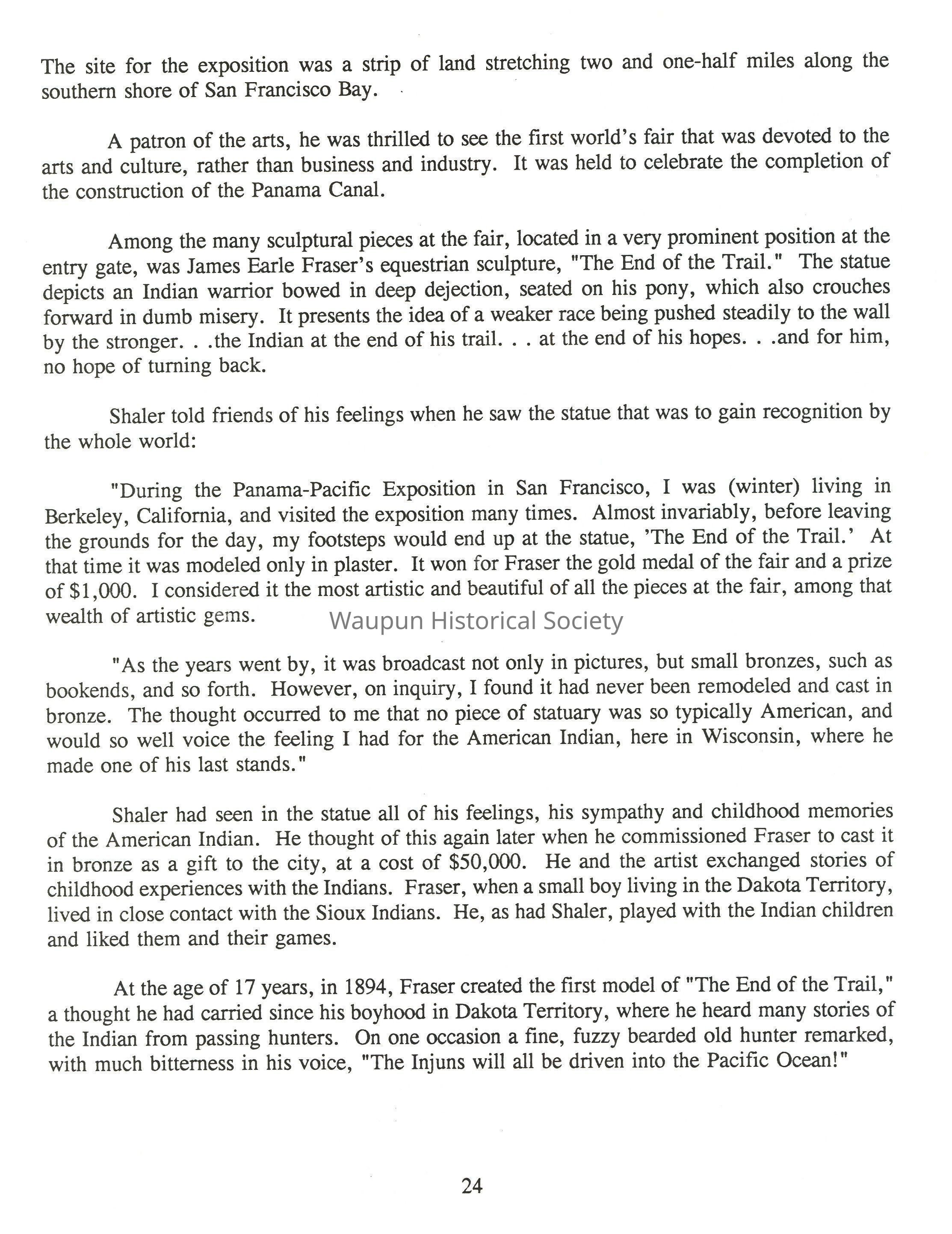 The prairie was still a place for Indians then and, while he was growing up, Shaler learned the way of the Indians, played with Indian children, seeing at an early age how the white man was pushing the native American out of his native land.