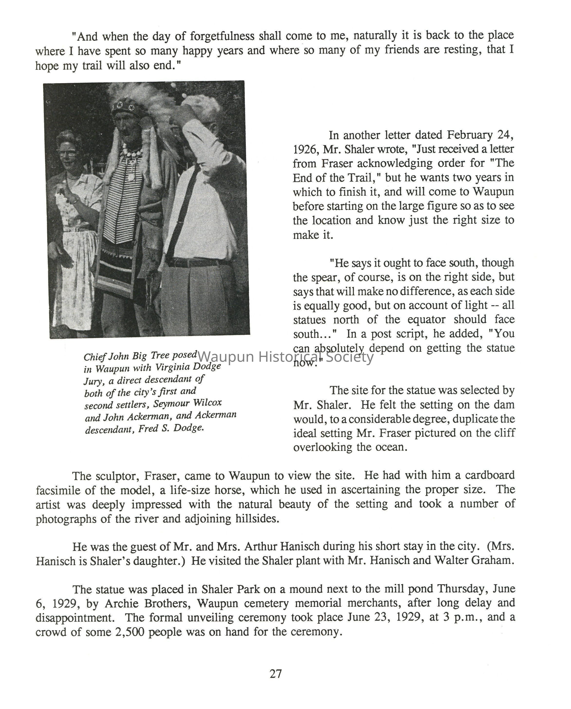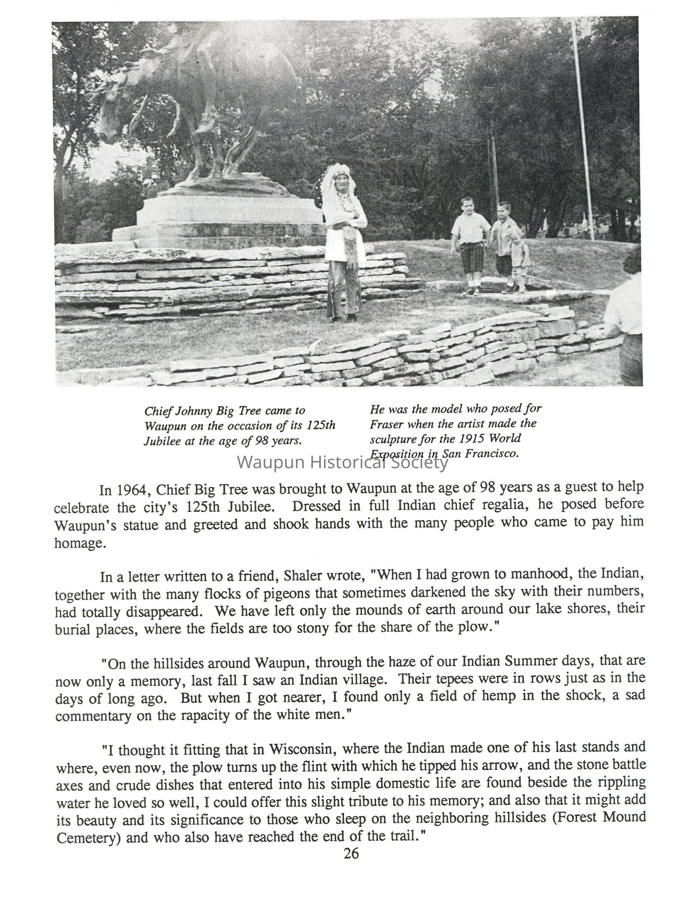 In later years, Shaler wrote, "I well remember, as a child, seeing the tepees of the Indians lining the shore of the nearby lake (Lake Emily), and it was not unusual to see their dark faces appear at our door with their figures dressed in brightly colored blankets. As I look back on those frequent visits of the Indians, I know now they were only asking for what was their just right."