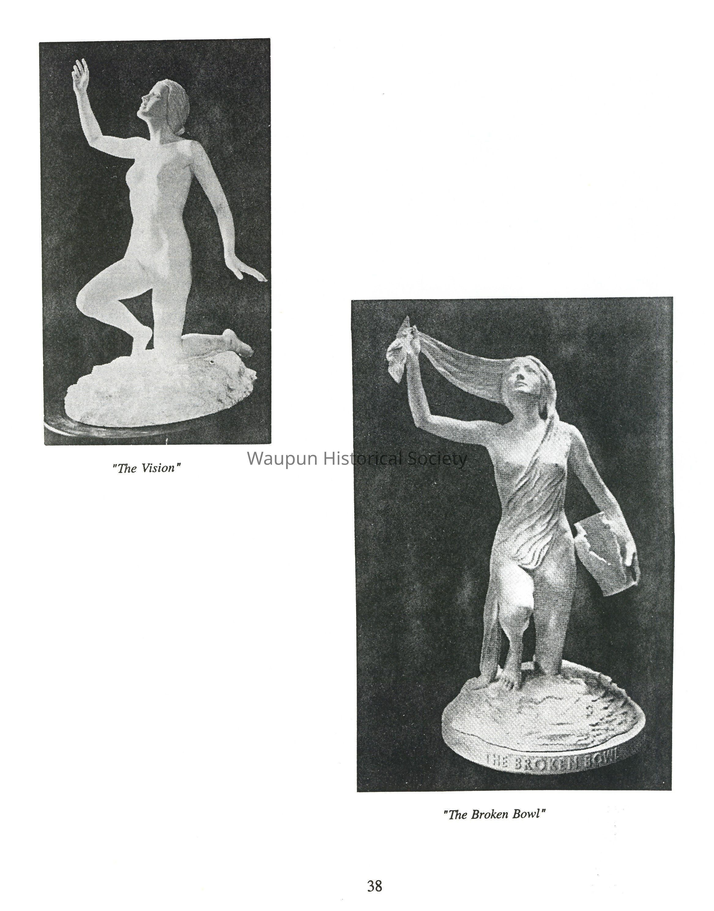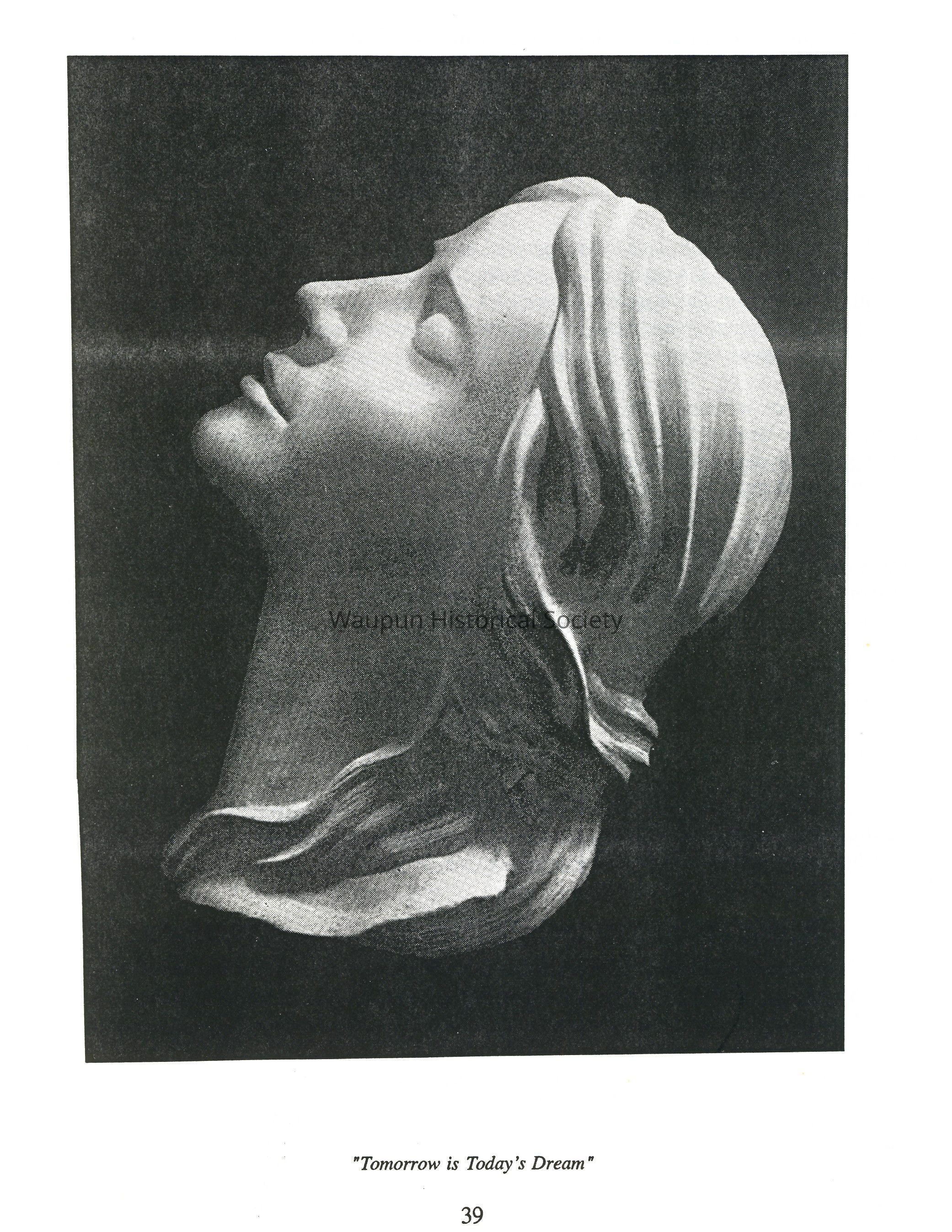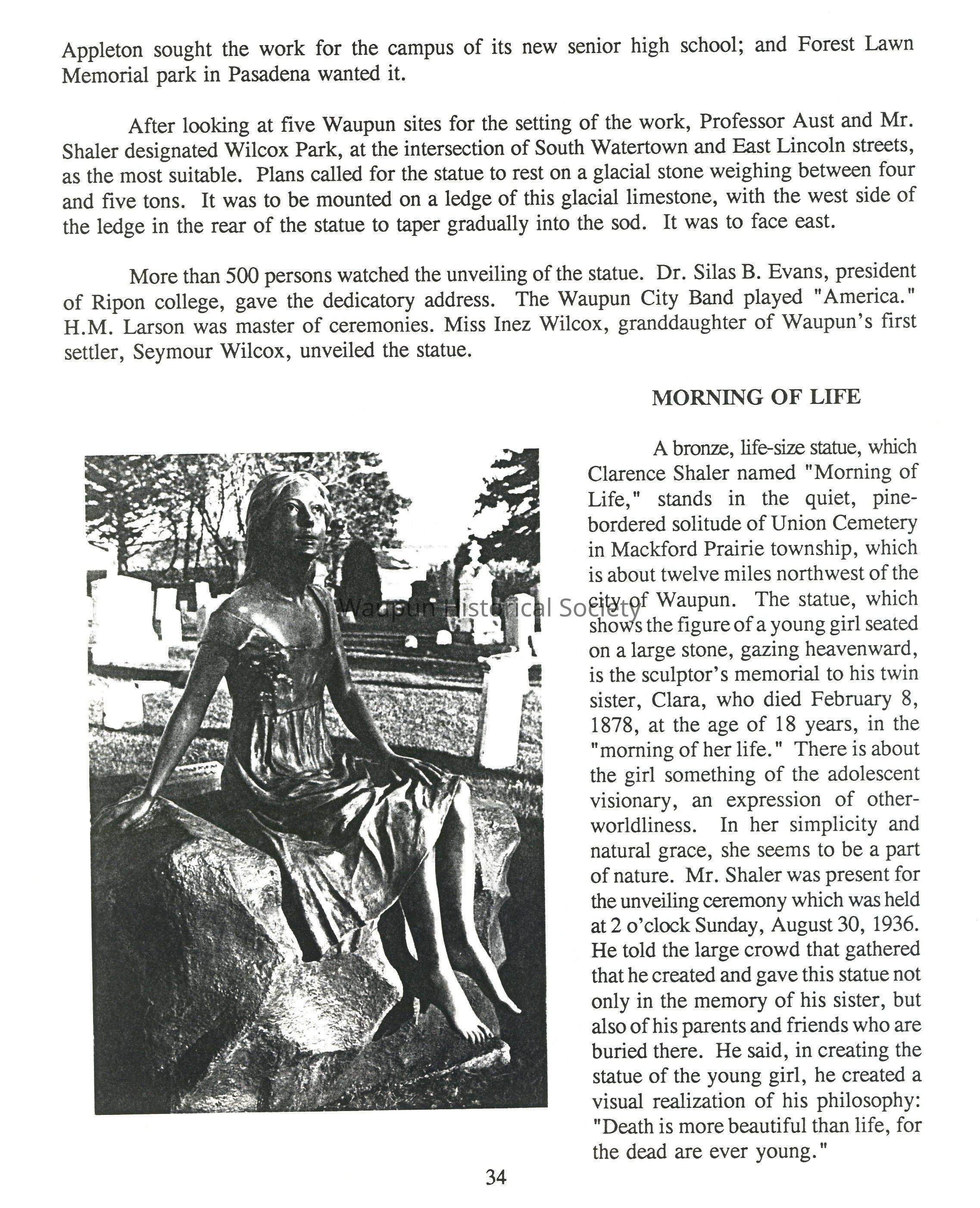 Clara died at this home in Ripon Feb. 8, 1878, a tragic memory Clarence carried the rest of his life, and which was to later become the inspiration of one of his finest pieces of sculpture, "Morning of Life." It was as if part of him died with her. She was buried in Mackford Union Cemetery.
