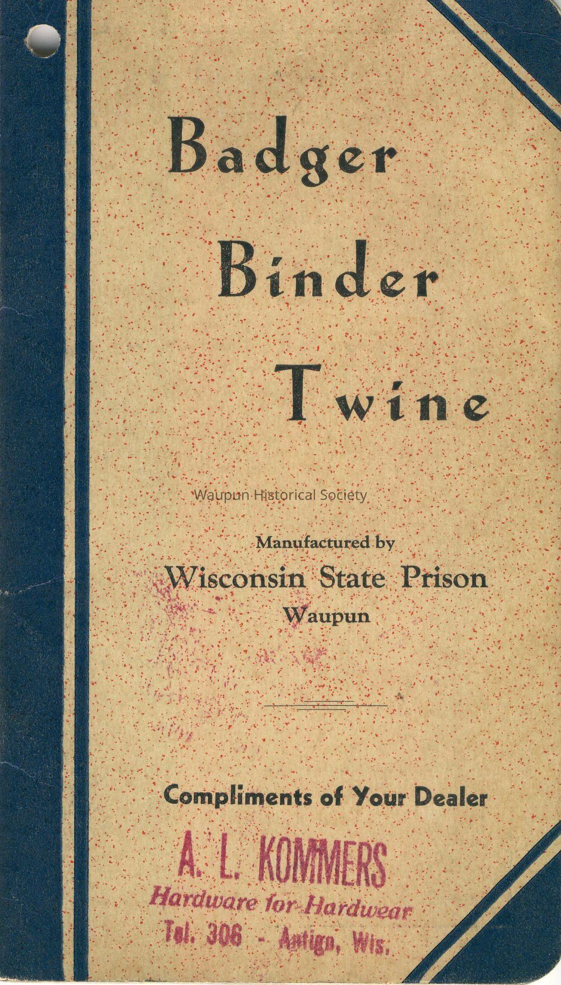 Booklet, Corrections, Wisconsin. State Prison, Badger Binder Twine. Badger Binder Twine. This picture is taken from a 1941 or '42 notes pad from the Badger Twine Co. This notebook contains photos of the Badger Binder Twine Co. which operated out of the Waupun State Prison and the story of the Twining process. For the complete story, please see below.