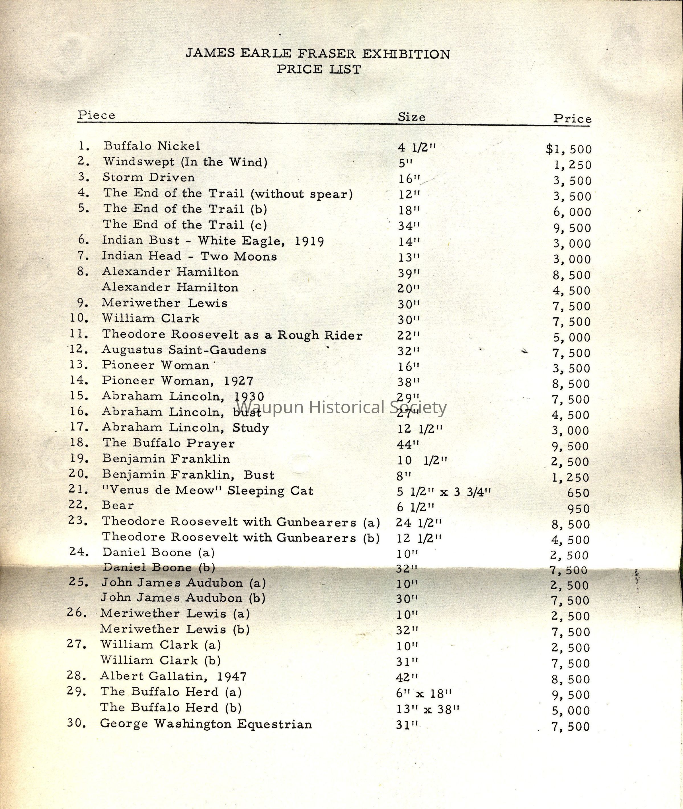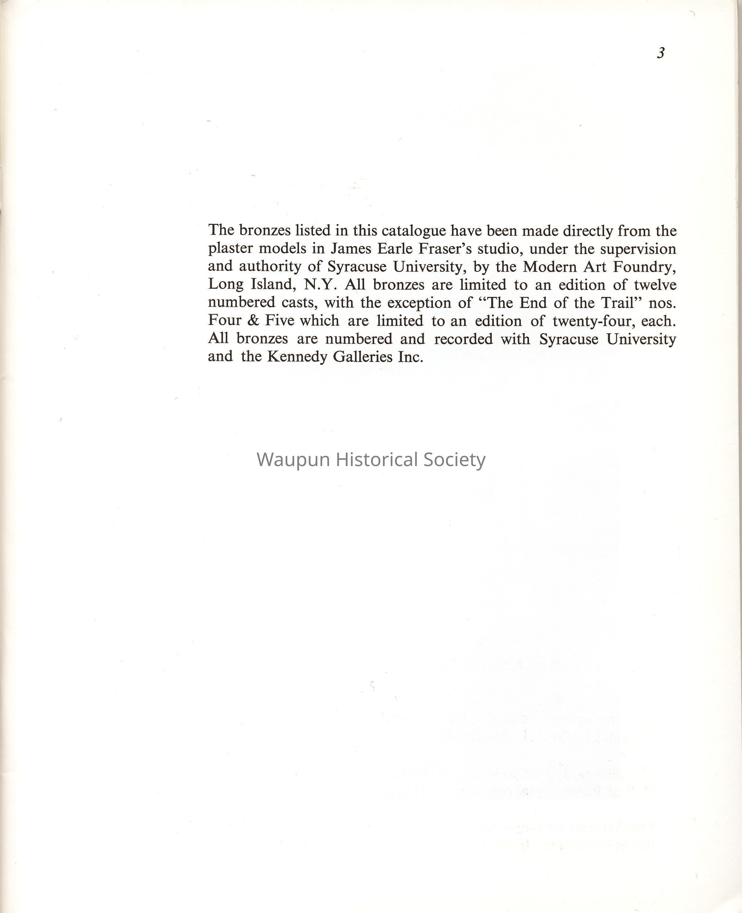 The bronzes listed in this catalogue have been made directly from the plaster models in James Earle Fraser's studio, under the supervision and authority of Syracuse University, by the Modern Art Foundry, Long Island, N.Y. All bronzes are limited to an edition of twelve numbered casts, with the exception of "The End of the Trail" nos. Four & Five which are limited to an edition of twenty-four, each. All bronzes are numbered and recorded with Syracuse University and the Kennedy Galleries Inc.