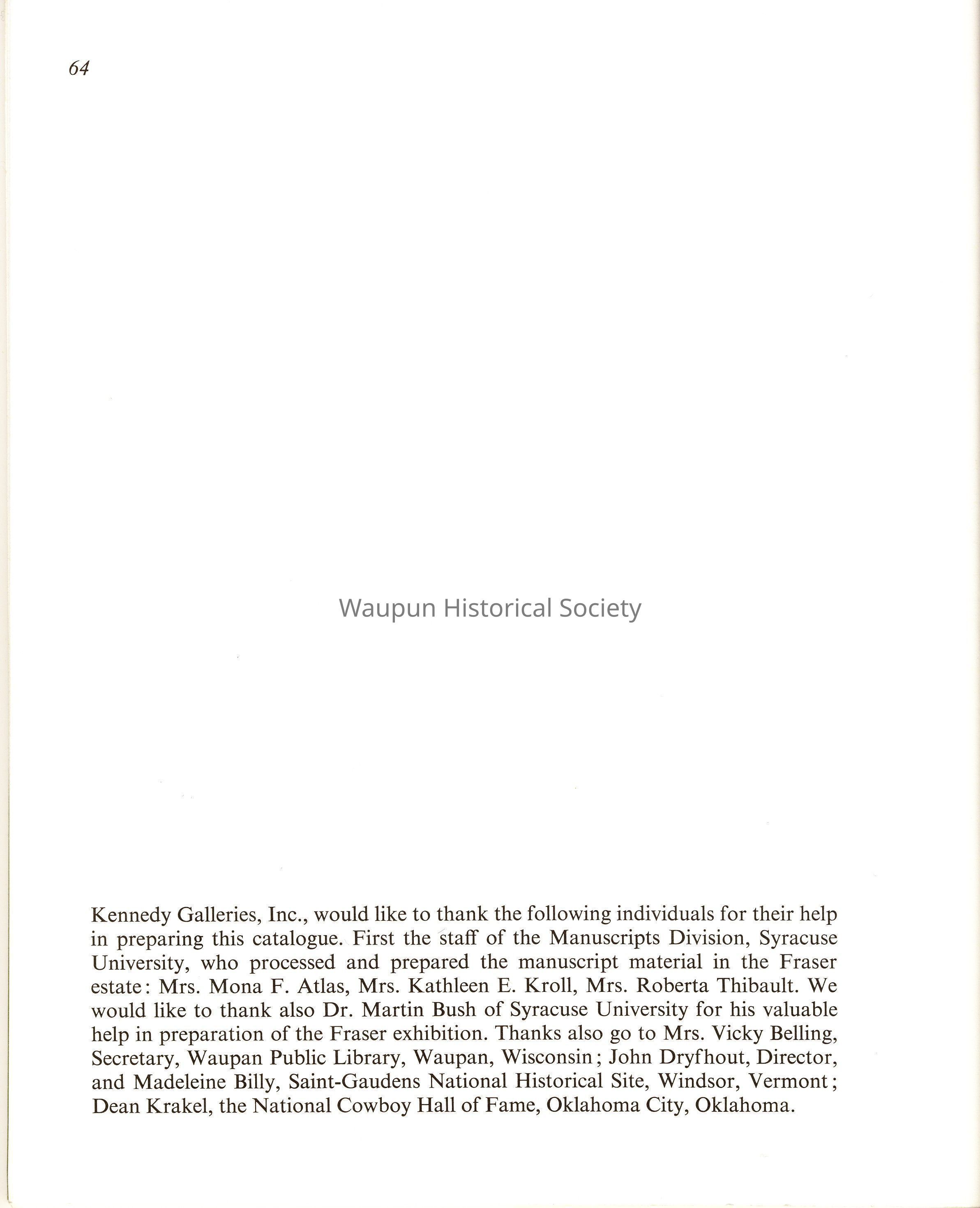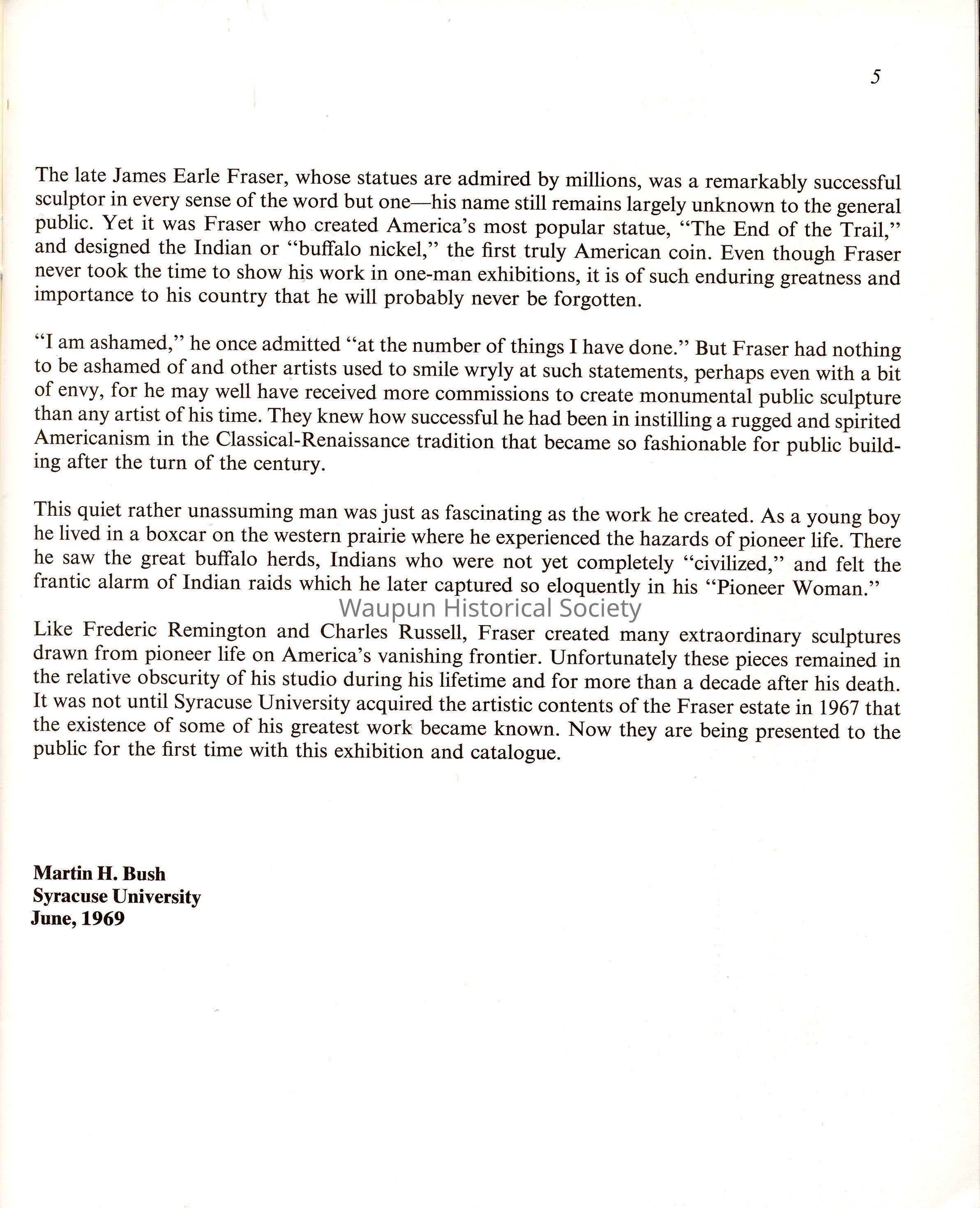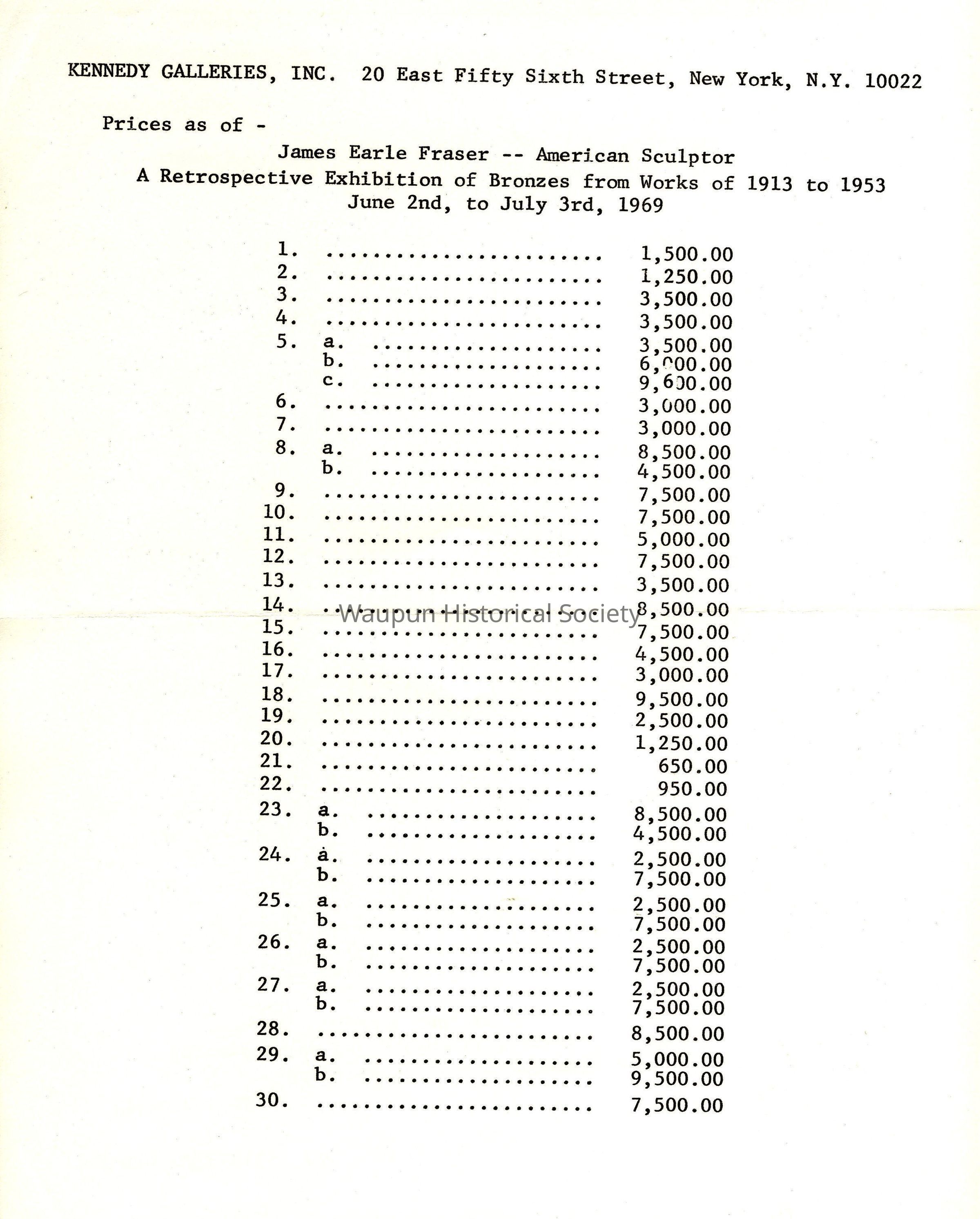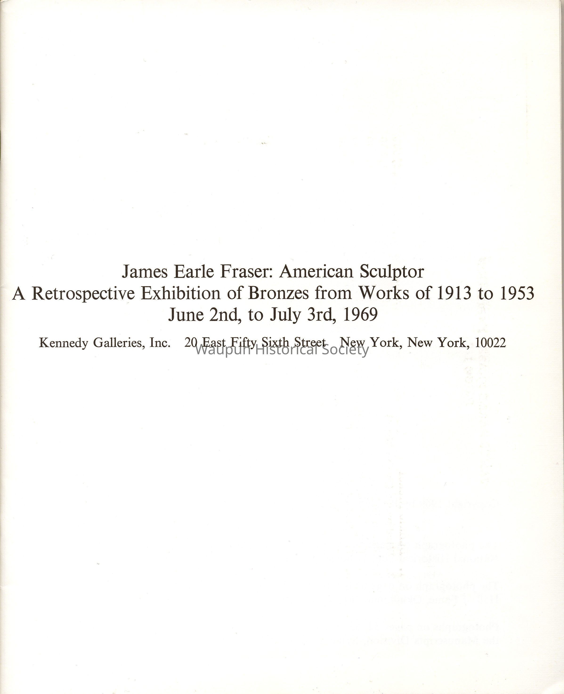 Gallery book for James Earle Fraser exhibition. This exhibition was held June 2 to July 3 1969 at the Kennedy Galleries, Inc., 20 East Sixth Street, New York, New York, 10022. We have two copies of this booklet.