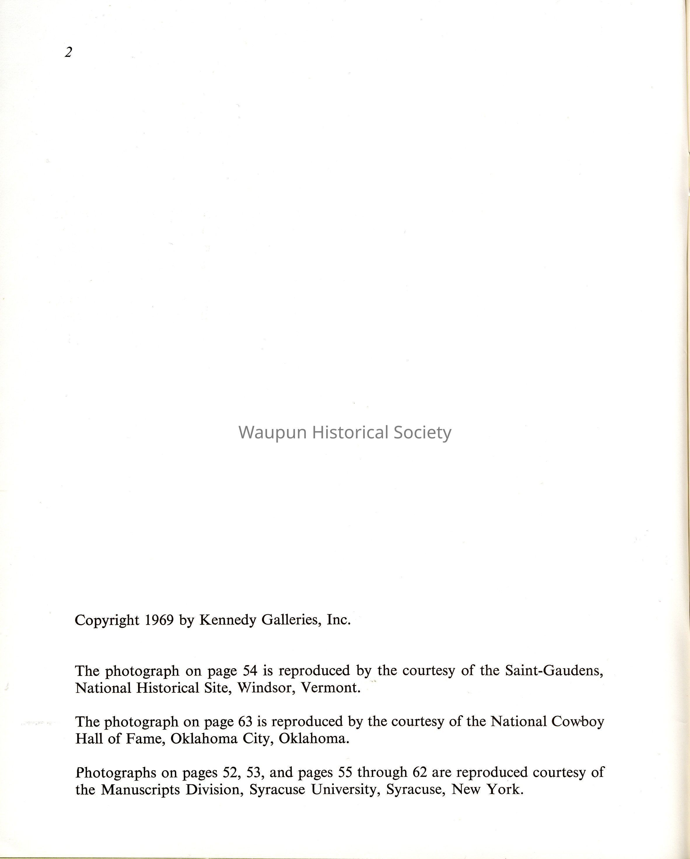 Extended Description: Gallery book for James Earle Fraser exhibition. This exhibition was held June 2 to July 3 1969 at the Kennedy Galleries, Inc., 20 East Sixth Street, New York, New York, 10022. We have two copies of this booklet.