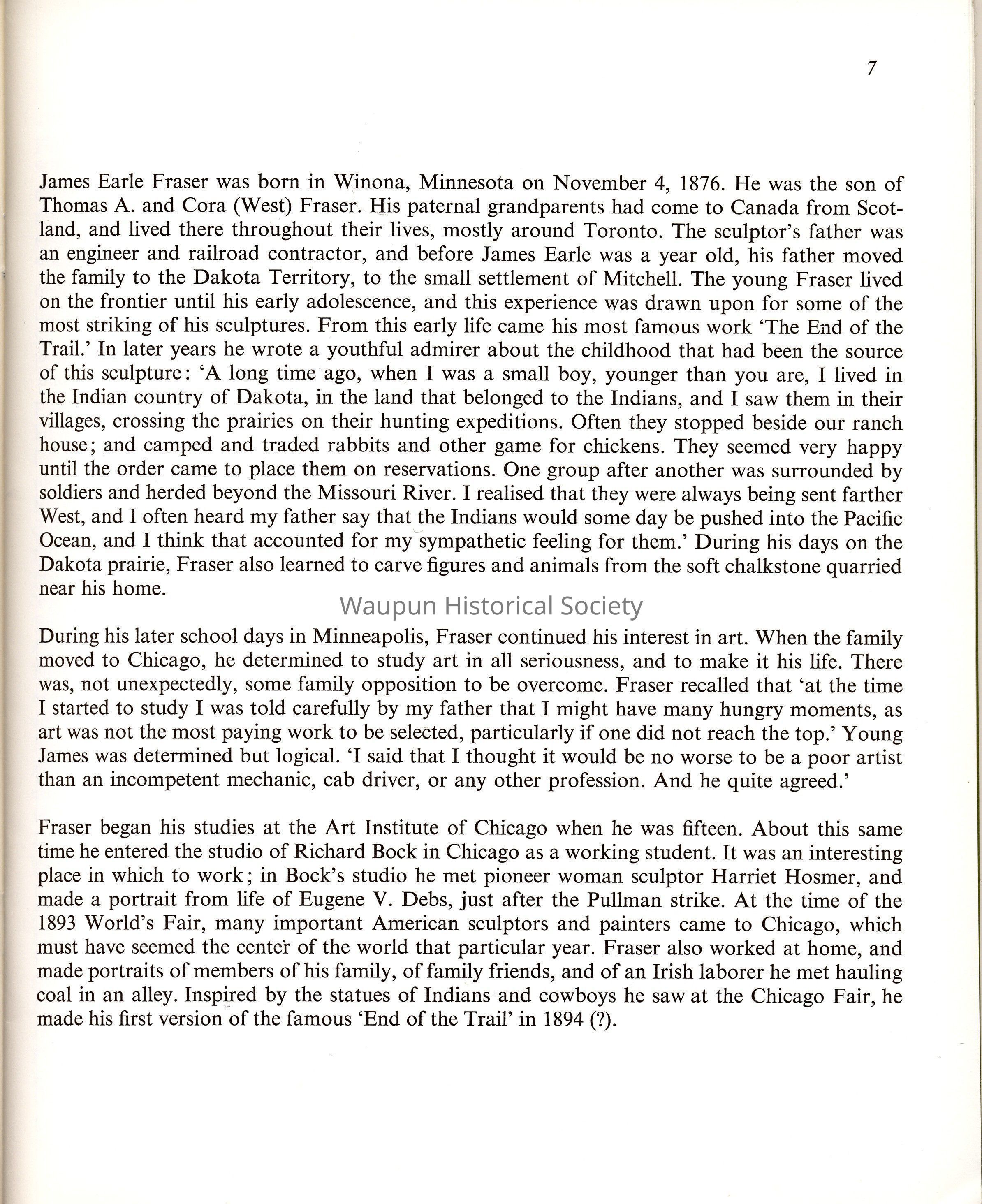 Fraser began his studies at the Art Institute of Chicago when he was fifteen. About this same time he entered the studio of Richard Bock in Chicago as a working student. It was an interesting place in which to work; in Bock's studio he met pioneer woman sculptor Harriet Hosmer, and made a portrait from life of Eugene V. Debs, just after the Pullman strike. At the time of the 1893 World's Fair, many important American sculptors and painters came to Chicago, which must have seemed the center of the world that particular year. Fraser also worked at home, and made portraits of members of his family, of family friends, and of an Irish laborer he met hauling coal in an alley. Inspired by the statues of Indians and cowboys he saw at the Chicago Fair, he made his first version of the famous 'End of the Trail' in 1894 (?).