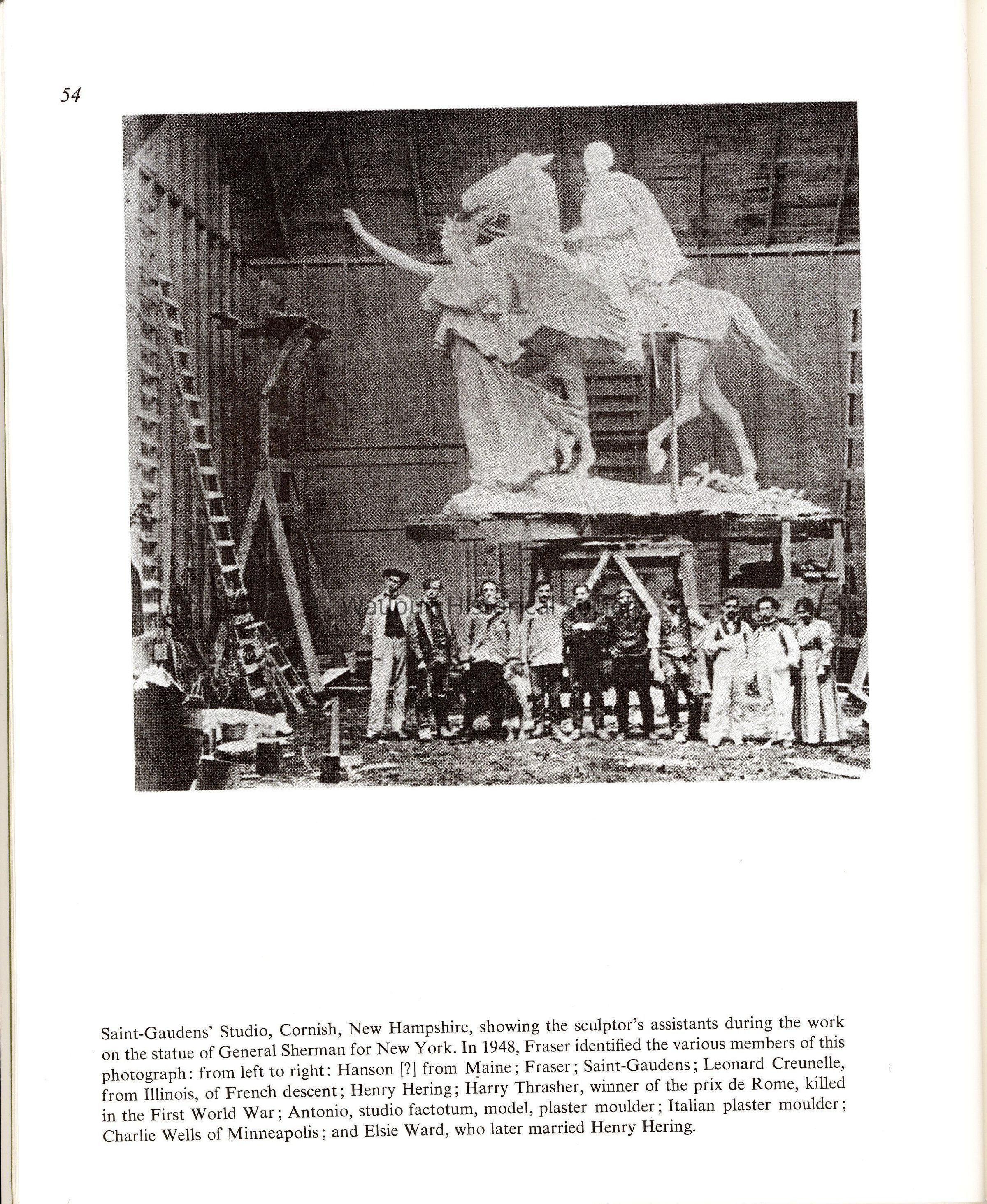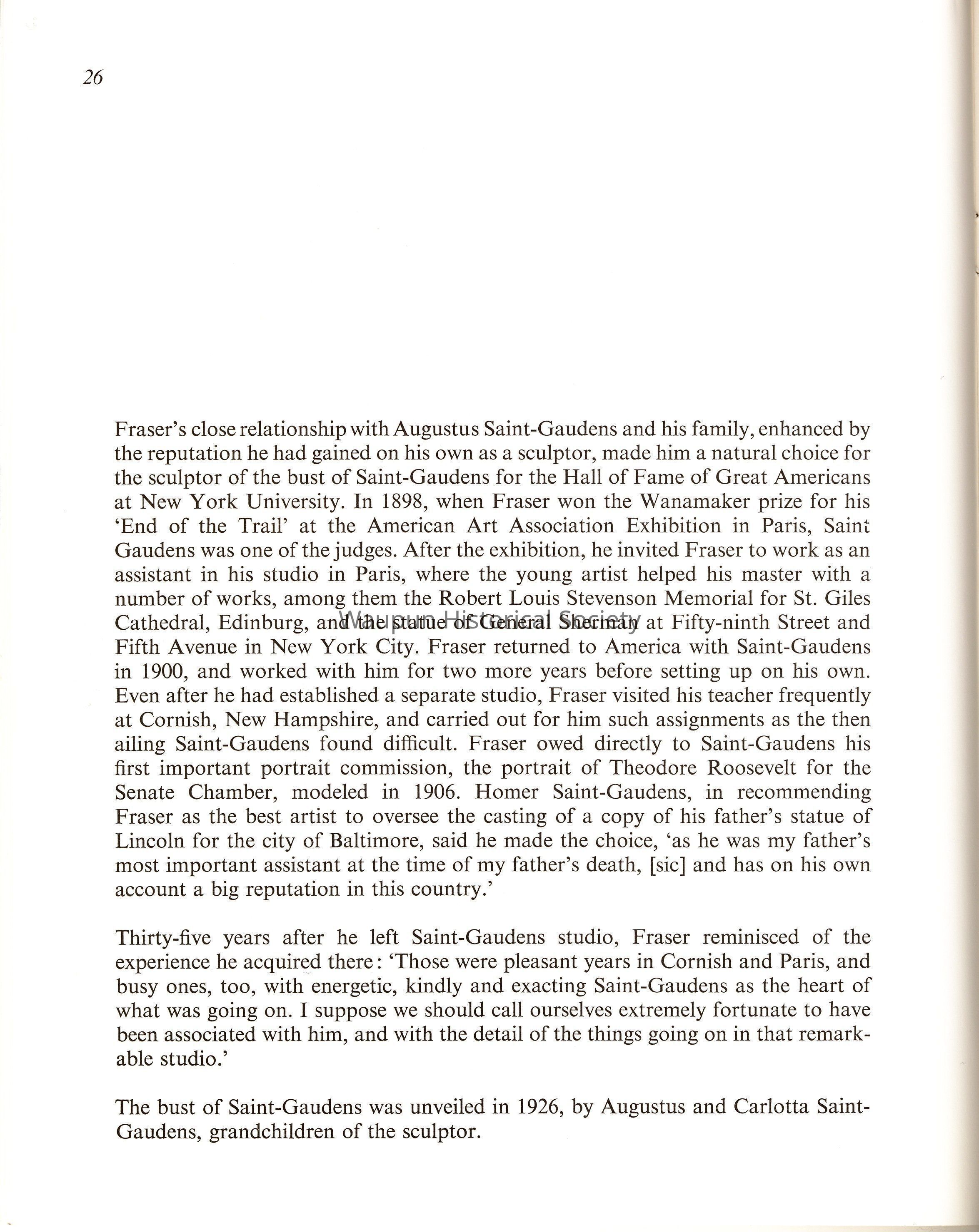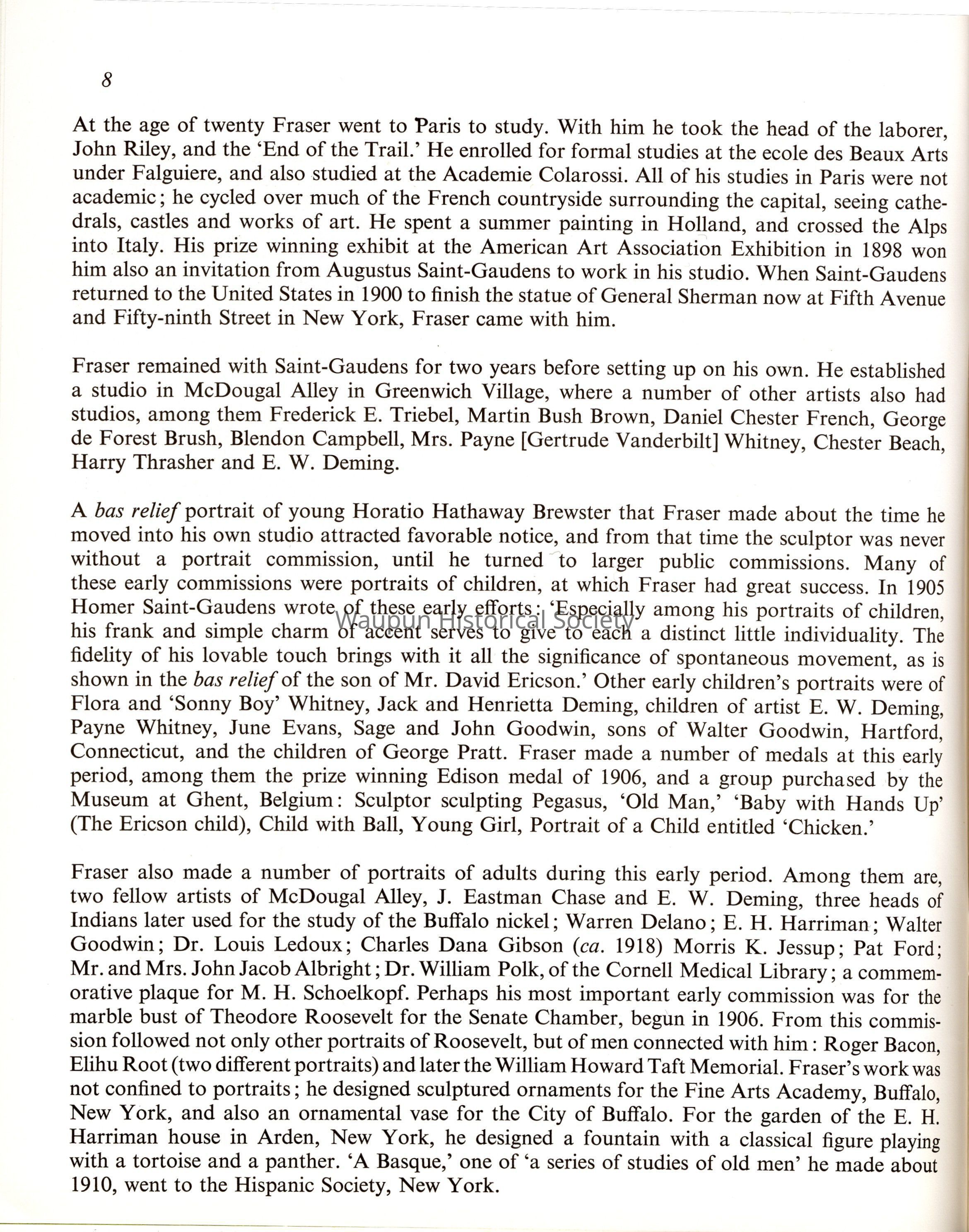 Fraser remained with Saint-Gaudens for two years before setting up on his own. He established a studio in McDougal Alley in Greenwich Village, where a number of other artists also had studios, among them Frederick E. Triebel, Martin Bush Brown, Daniel Chester French, George de Forest Brush, Blendon Campbell, Mrs. Payne [Gertrude Vanderbilt] Whitney, Chester Beach, Harry Thrasher and E. W. Deming.