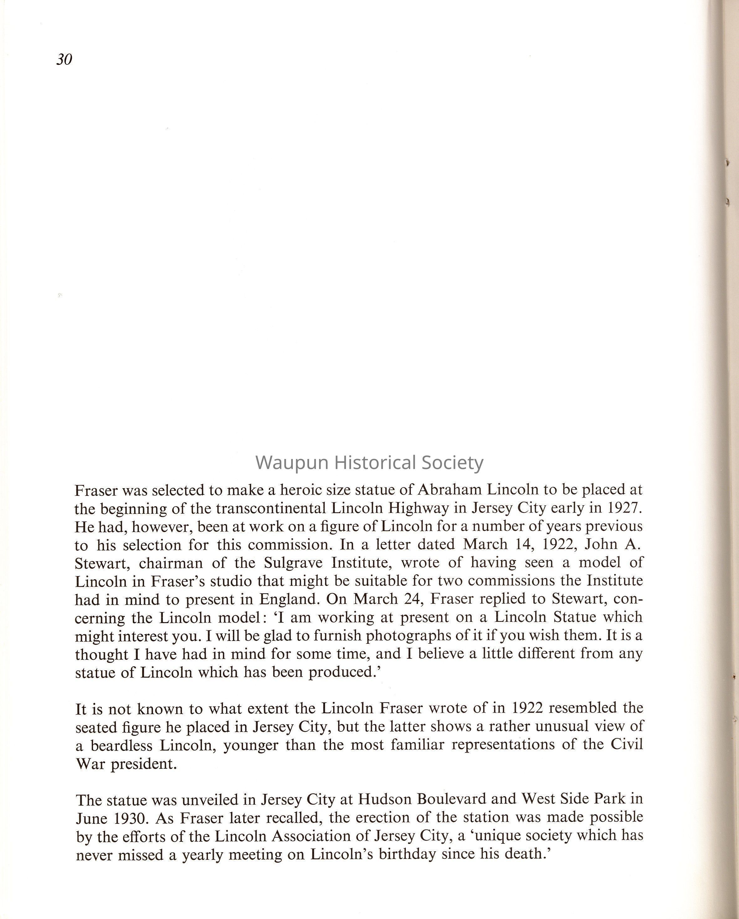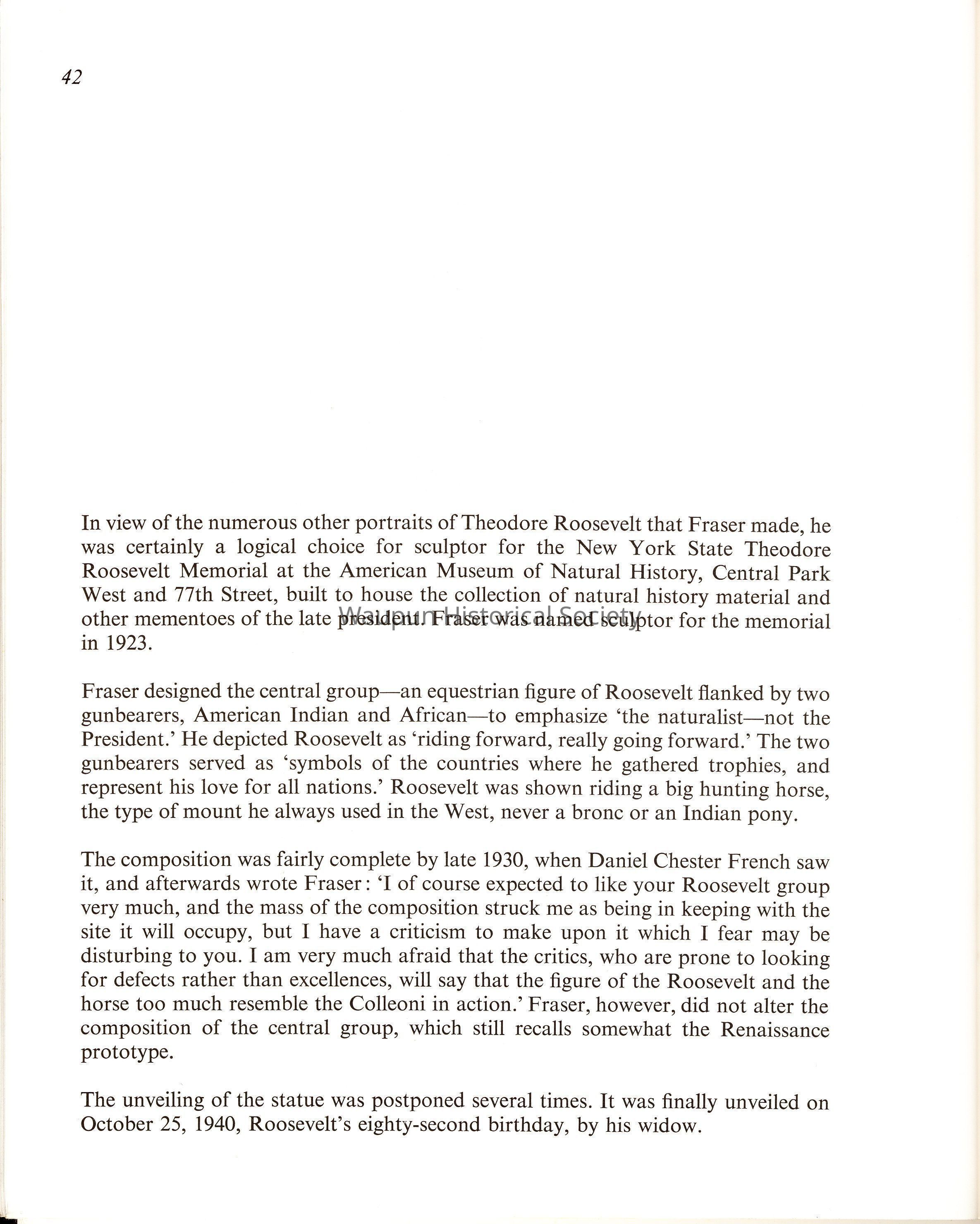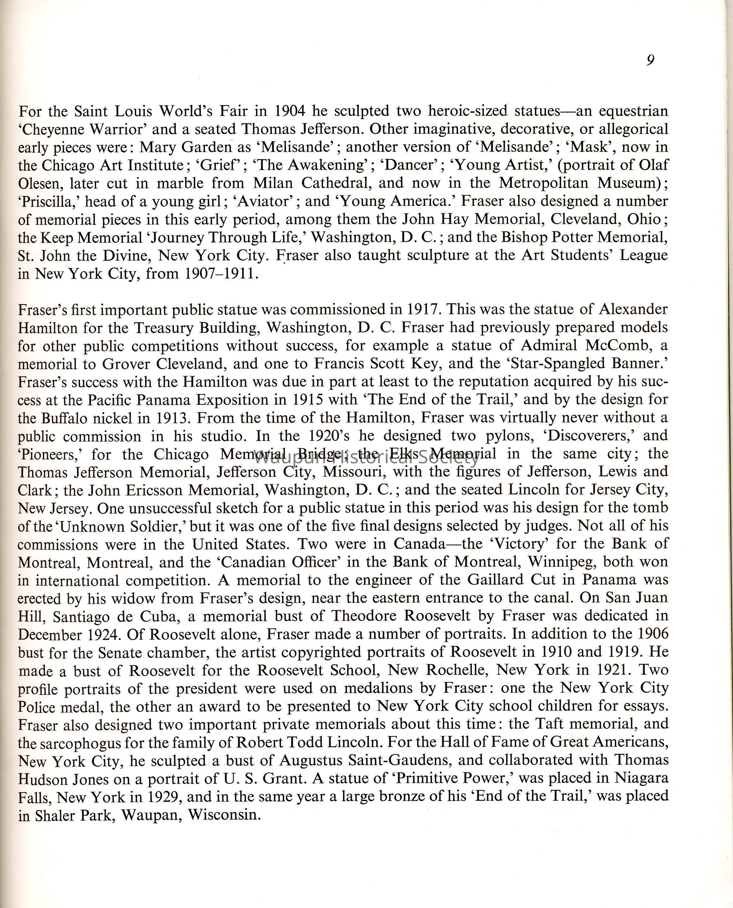 Fraser's first important public statue was commissioned in 1917. This was the statue of Alexander Hamilton for the Treasury Building, Washington, D. C. Fraser had previously prepared models for other public competitions without success, for example a statue of Admiral McComb, a memorial to Grover Cleveland, and one to Francis Scott Key, and the 'Star-Spangled Banner.' Fraser's success with the Hamilton was due in part at least to the reputation acquired by his success at the Pacific Panama Exposition in 1915 with 'The End of the Trail,' and by the design for the Buffalo nickel in 1913. From the time of the Hamilton, Fraser was virtually never without a public commission in his studio. In the 1920's he designed two pylons, 'Discoverers,' and `Pioneers,' for the Chicago Memorial Bridge; the Elks Memorial in the same city; the Thomas Jefferson Memorial, Jefferson City, Missouri, with the figures of Jefferson, Lewis and Clark; the John Ericsson Memorial, Washington, D. C.; and the seated Lincoln for Jersey City, New Jersey. One unsuccessful sketch for a public statue in this period was his design for the tomb of the 'Unknown Soldier,' but it was one of the five final designs selected by judges. Not all of his commissions were in the United States. Two were in Canada - the 'Victory' for the Bank of Montreal, Montreal, and the 'Canadian Officer' in the Bank of Montreal, Winnipeg, both won in international competition. A memorial to the engineer of the Gaillard Cut in Panama was erected by his widow from Fraser's design, near the eastern entrance to the canal. On San Juan Hill, Santiago de Cuba, a memorial bust of Theodore Roosevelt by Fraser was dedicated in December 1924. Of Roosevelt alone, Fraser made a number of portraits. In addition to the 1906 bust for the Senate chamber, the artist copyrighted portraits of Roosevelt in 1910 and 1919. He made a bust of Roosevelt for the Roosevelt School, New Rochelle, New York in 1921. Two profile portraits of the president were used on medalions by Fraser: one the New York City Police medal, the other an award to be presented to New York City school children for essays. Fraser also designed two important private memorials about this time: the Taft memorial, and the sarcophogus for the family of Robert Todd Lincoln. For the Hall of Fame of Great Americans, New York City, he sculpted a bust of Augustus Saint-Gaudens, and collaborated with Thomas Hudson Jones on a portrait of U. S. Grant. A statue of 'Primitive Power,' was placed in Niagara Falls, New York in 1929, and in the same year a large bronze of his 'End of the Trail,' was placed in Shaler Park, Waupan, (Waupun) Wisconsin.