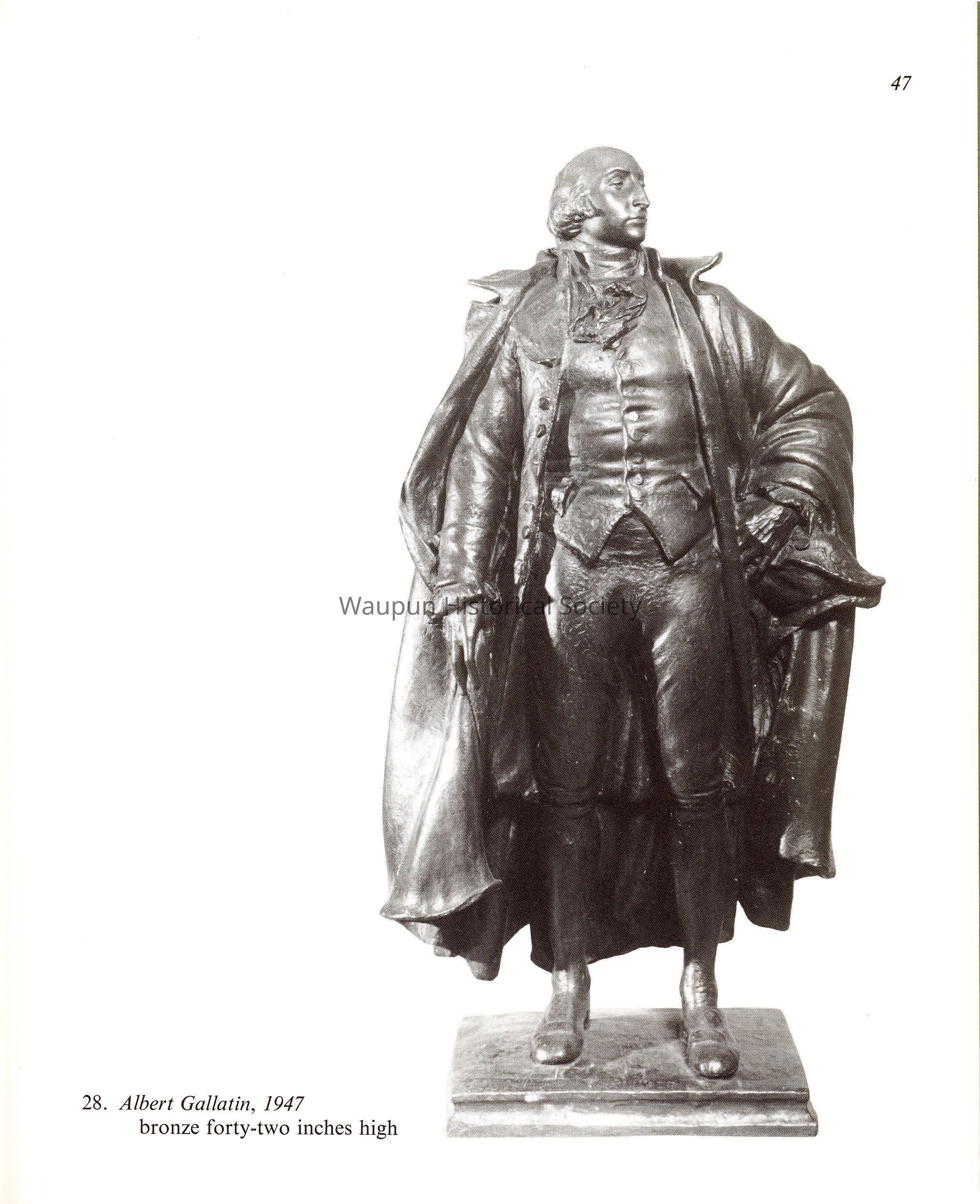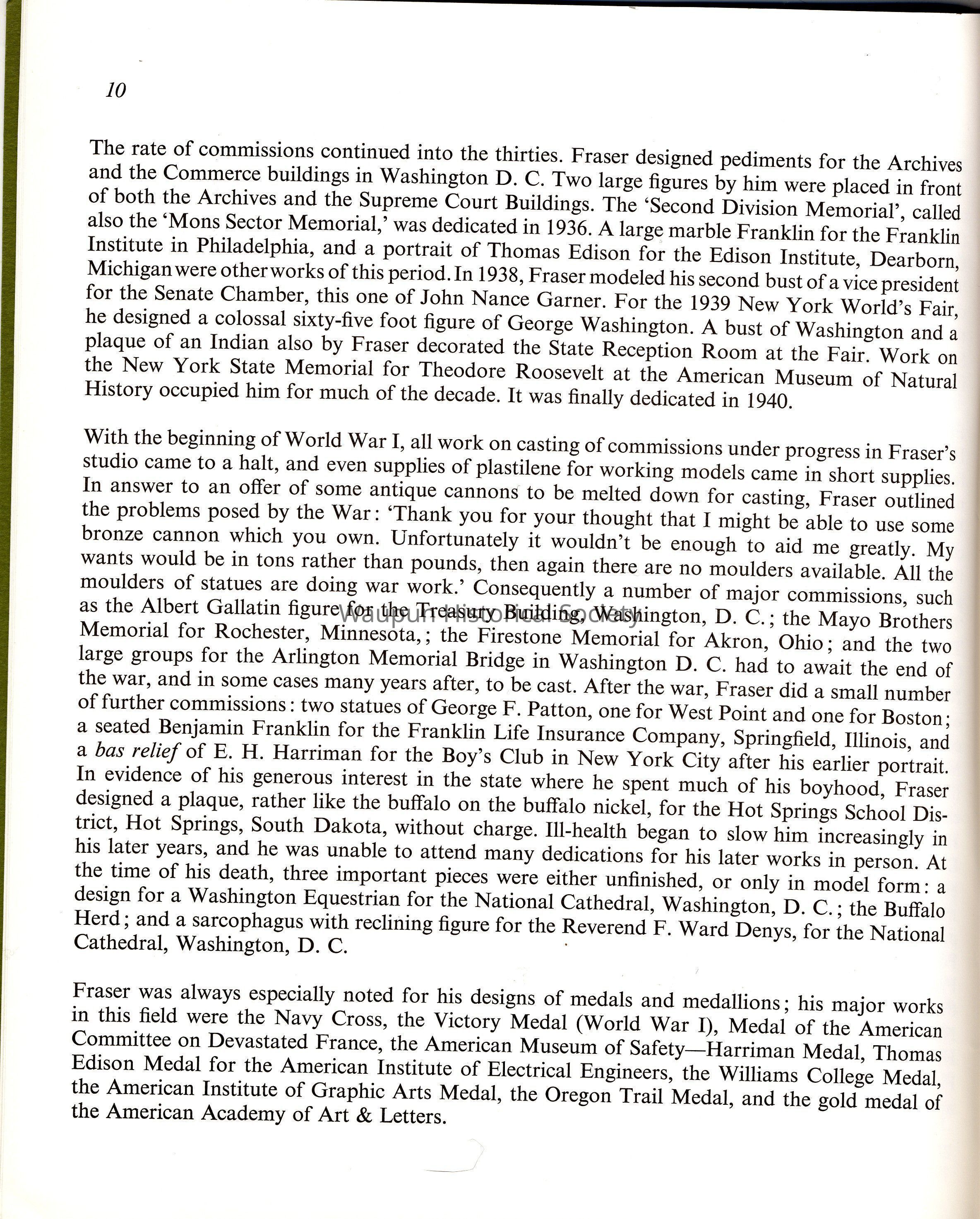 With the beginning of World War I, all work on casting of commissions under progress in Fraser's studio came to a halt, and even supplies of plastilene for working models came in short supplies. In answer to an offer of some antique cannons to be melted down for casting, Fraser outlined the problems posed by the War : 'Thank you for your thought that I might be able to use some bronze cannon which you own. Unfortunately it wouldn't be enough to aid me greatly. My wants would be in tons rather than pounds, then again there are no moulders available. All the moulders of statues are doing war work.' Consequently a number of major commissions, such as the Albert Gallatin figure for the Treasury Building, Washington, D. C.; the Mayo Brothers Memorial for Rochester, Minnesota,; the Firestone Memorial for Akron, Ohio; and the two large groups for the Arlington Memorial Bridge in Washington D. C. had to await the end of the war, and in some cases many years after, to be cast. After the war, Fraser did a small number of further commissions: two statues of George F. Patton, one for West Point and one for Boston; a seated Benjamin Franklin for the Franklin Life Insurance Company, Springfield, Illinois, and a bas relief of E. H. Harriman for the Boy's Club in New York City after his earlier portrait. In evidence of his generous interest in the state where he spent much of his boyhood, Fraser designed a plaque, rather like the buffalo on the buffalo nickel, for the Hot Springs School District, Hot Springs, South Dakota, without charge. Ill-health began to slow him increasingly in his later years, and he was unable to attend many dedications for his later works in person. At the time of his death, three important pieces were either unfinished, or only in model form: a design for a Washington Equestrian for the National Cathedral, Washington, D. C.; the Buffalo Herd; and a sarcophagus with reclining figure for the Reverend F. Ward Denys, for the National Cathedral, Washington, D. C.