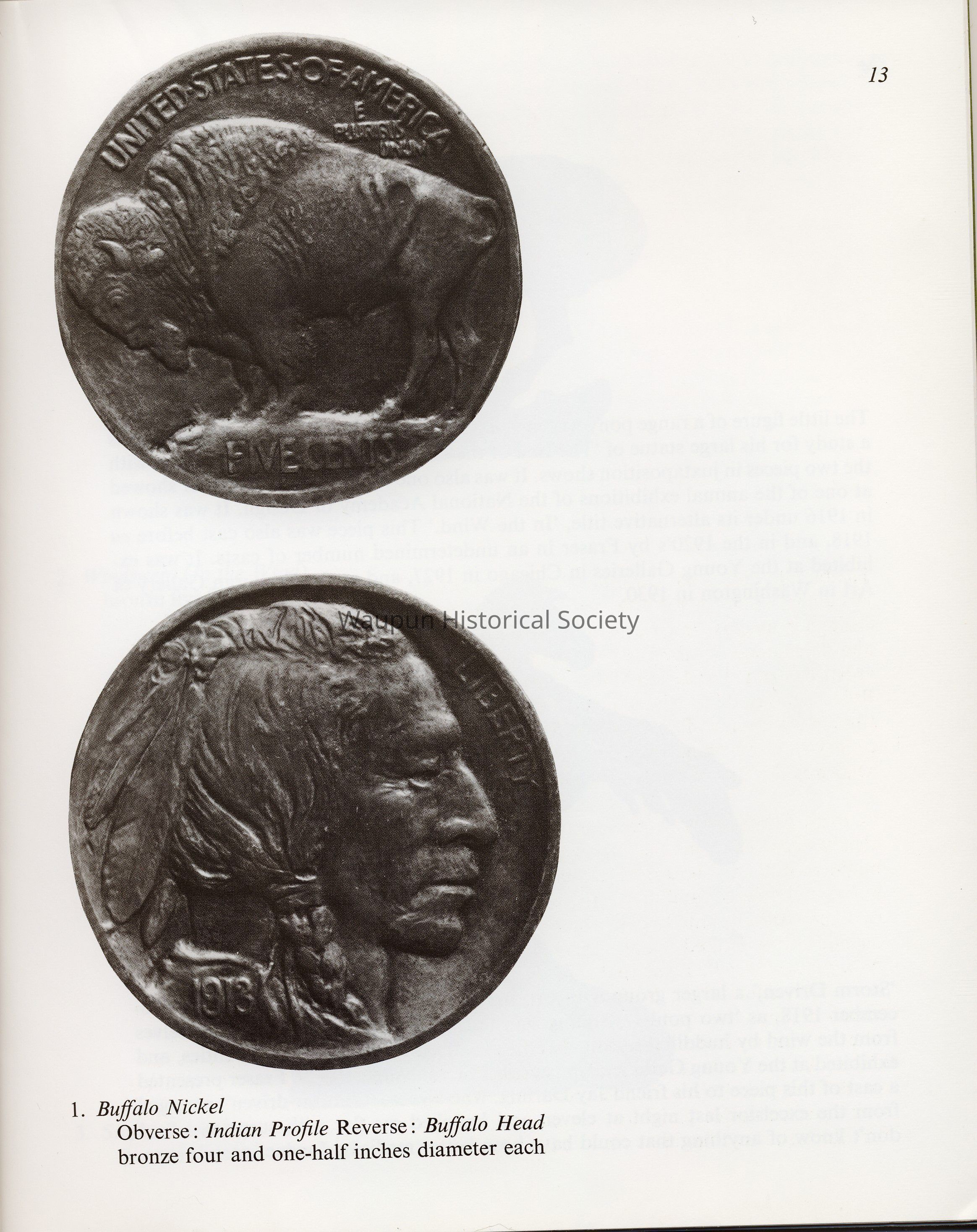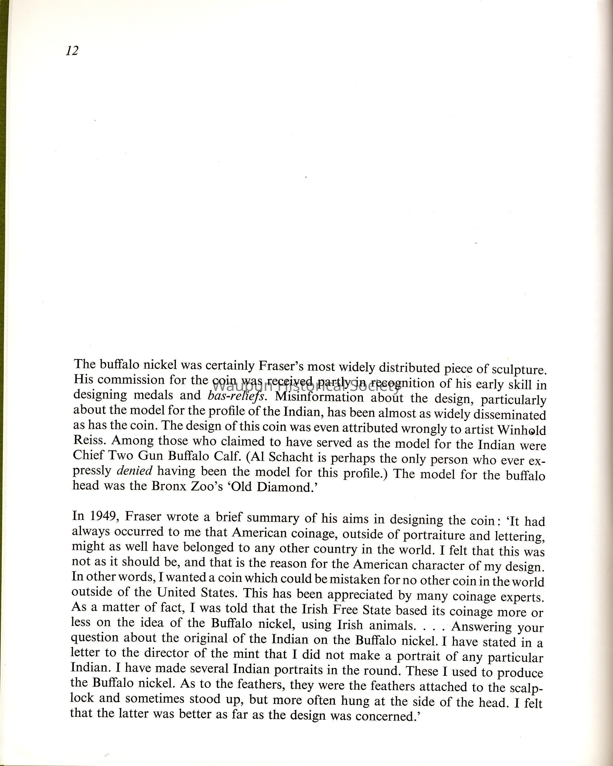 In 1949, Fraser wrote a brief summary of his aims in designing the coin: 'It had always occurred to me that American coinage, outside of portraiture and lettering, might as well have belonged to any other country in the world. I felt that this was not as it should be, and that is the reason for the American character of my design. In other words, I wanted a coin which could be mistaken for no other coin in the world outside of the United States. This has been appreciated by many coinage experts. As a matter of fact, I was told that the Irish Free State based its coinage more or less on the idea of the Buffalo nickel, using Irish animals. . . . Answering your question about the original of the Indian on the Buffalo nickel. I have stated in a letter to the director of the mint that I did not make a portrait of any particular Indian. I have made several Indian portraits in the round. These I used to produce the Buffalo nickel. As to the feathers, they were the feathers attached to the scalp-lock and sometimes stood up, but more often hung at the side of the head. I felt that the latter was better as far as the design was concerned.'