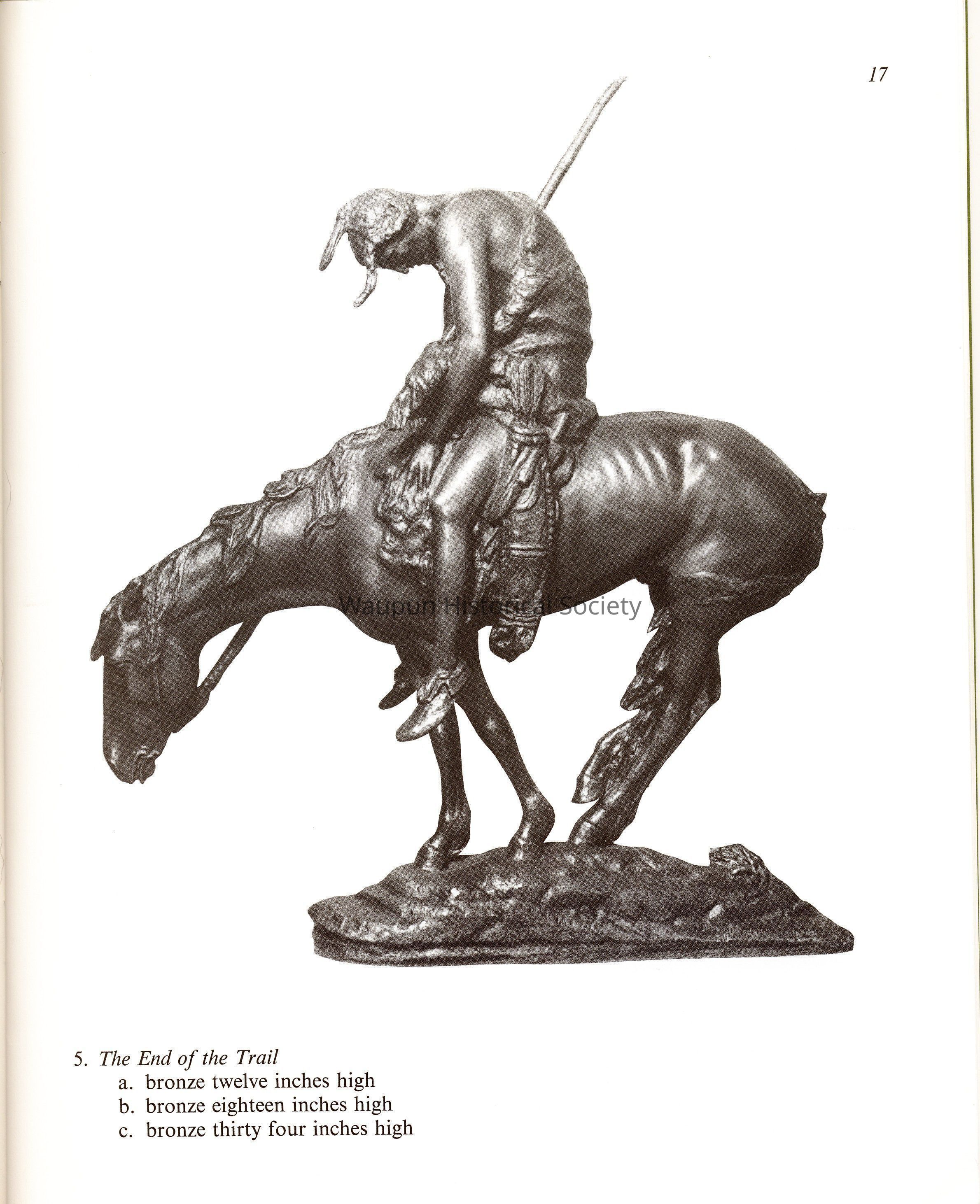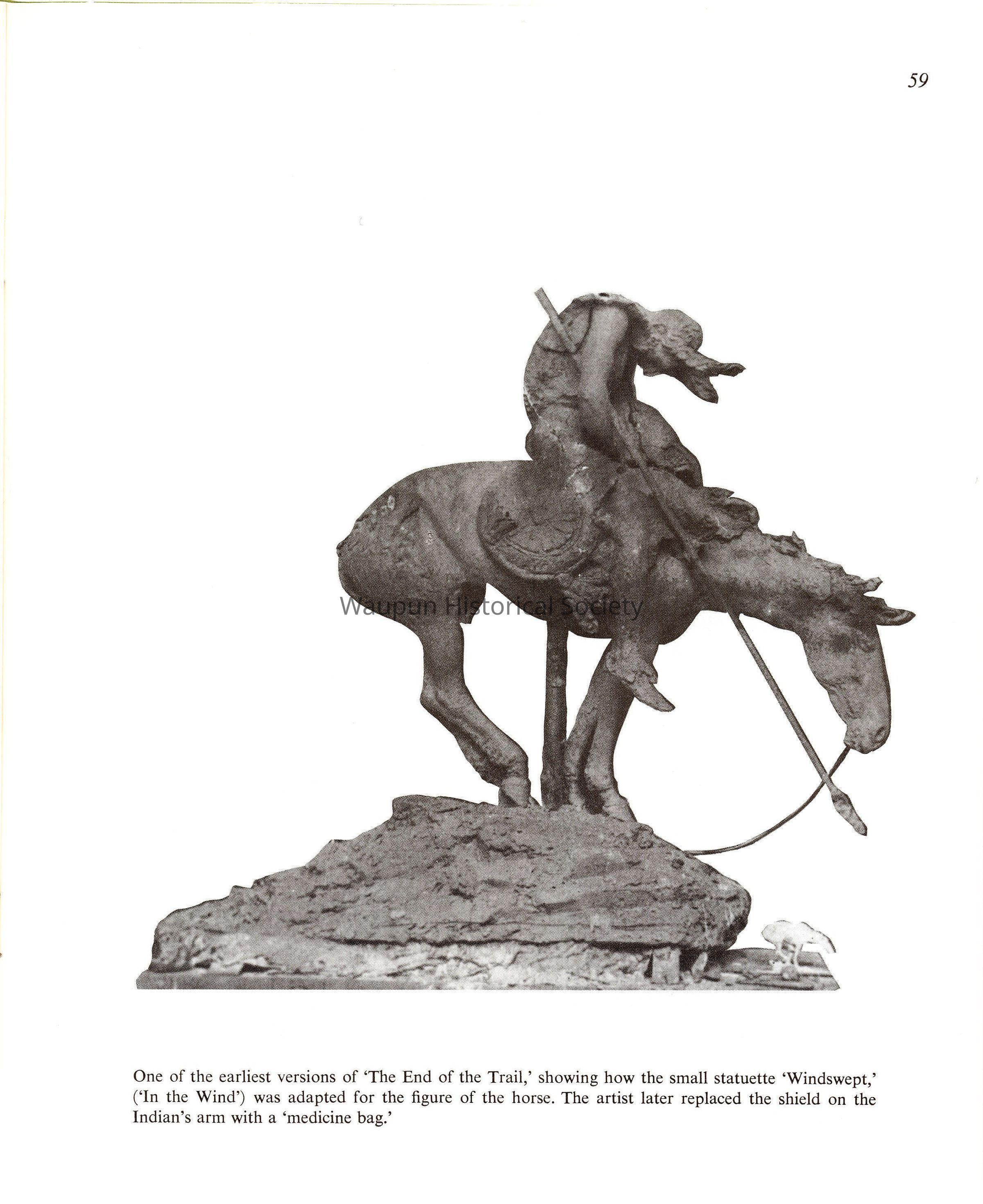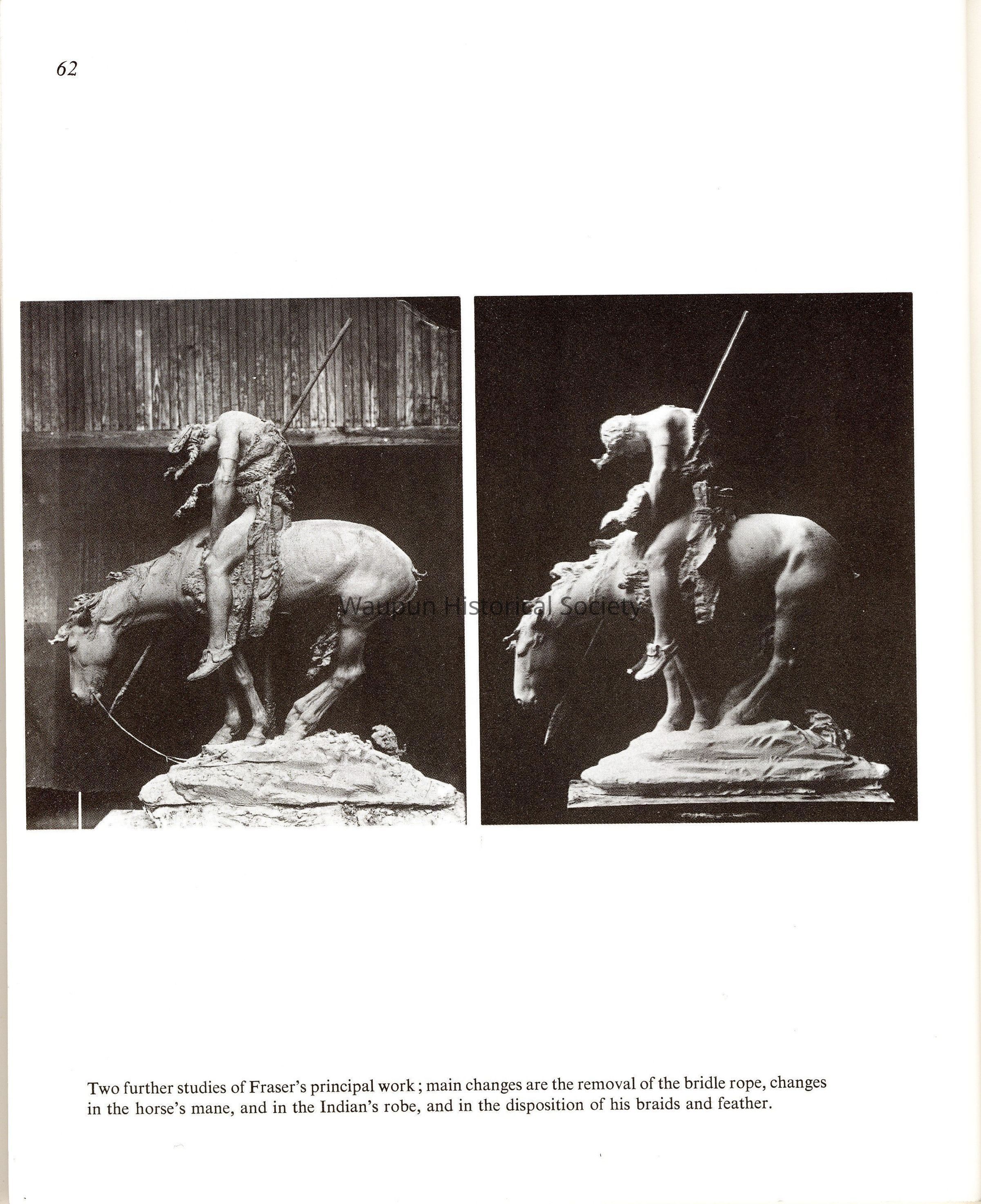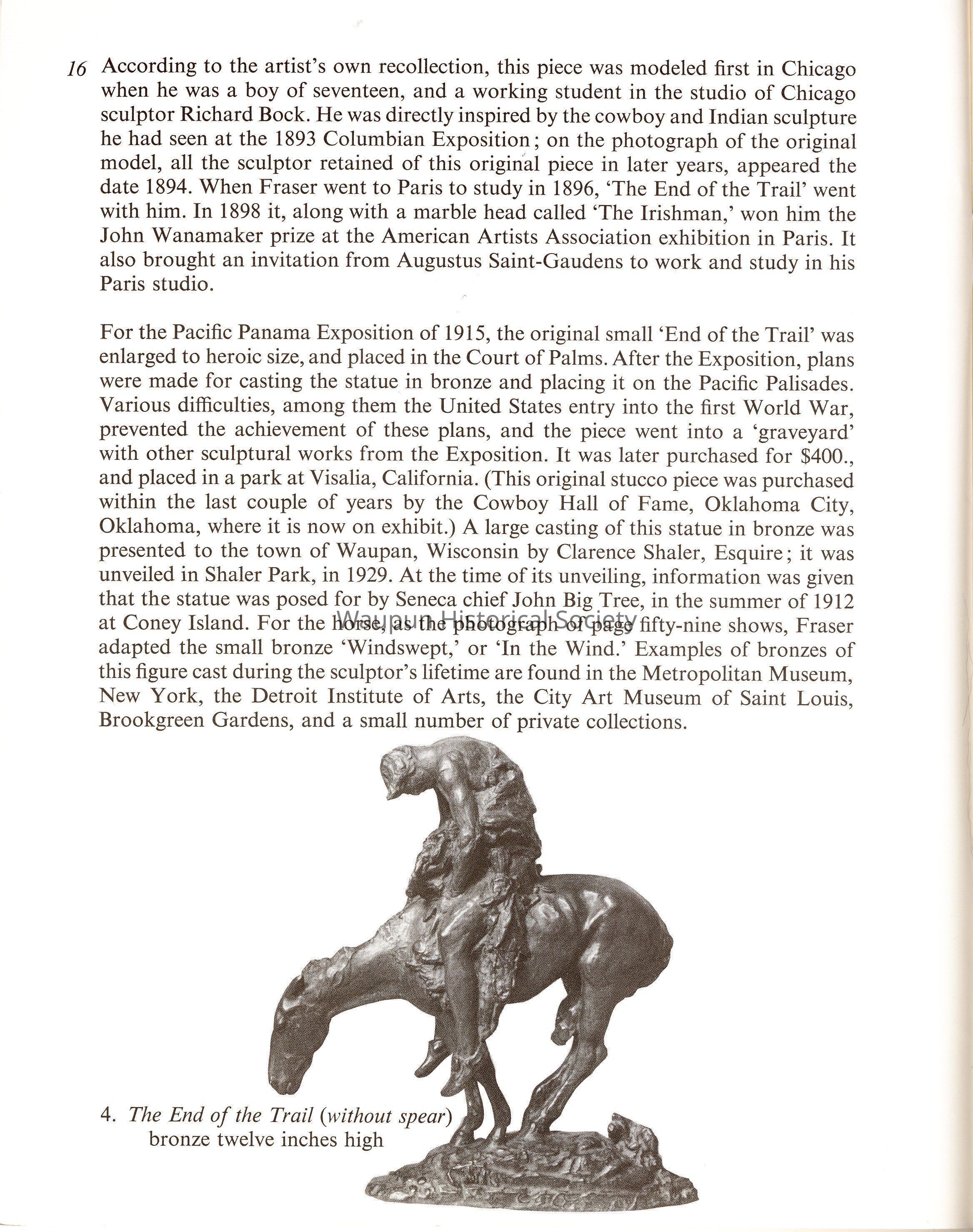 For the Pacific Panama Exposition of 1915, the original small 'End of the Trail' was enlarged to heroic size, and placed in the Court of Palms. After the Exposition, plans were made for casting the statue in bronze and placing it on the Pacific Palisades. Various difficulties, among them the United States entry into the first World War, prevented the achievement of these plans, and the piece went into a 'graveyard' with other sculptural works from the Exposition. It was later purchased for $400., and placed in a park at Visalia, California. (This original stucco piece was purchased within the last couple of years by the Cowboy Hall of Fame, Oklahoma City, Oklahoma, where it is now on exhibit.) A large casting of this statue in bronze was presented to the town of Waupan, (Waupun) Wisconsin by Clarence Shaler, Esquire; it was unveiled in Shaler Park, in 1929. At the time of its unveiling, information was given that the statue was posed for by Seneca chief John Big Tree, in the summer of 1912 at Coney Island. For the horse, as the photograph of page fifty-nine shows, Fraser adapted the small bronze 'Windswept,' or 'In the Wind.' Examples of bronzes of this figure cast during the sculptor's lifetime are found in the Metropolitan Museum, New York, the Detroit Institute of Arts, the City Art Museum of Saint Louis, Brookgreen Gardens, and a small number of private collections.
