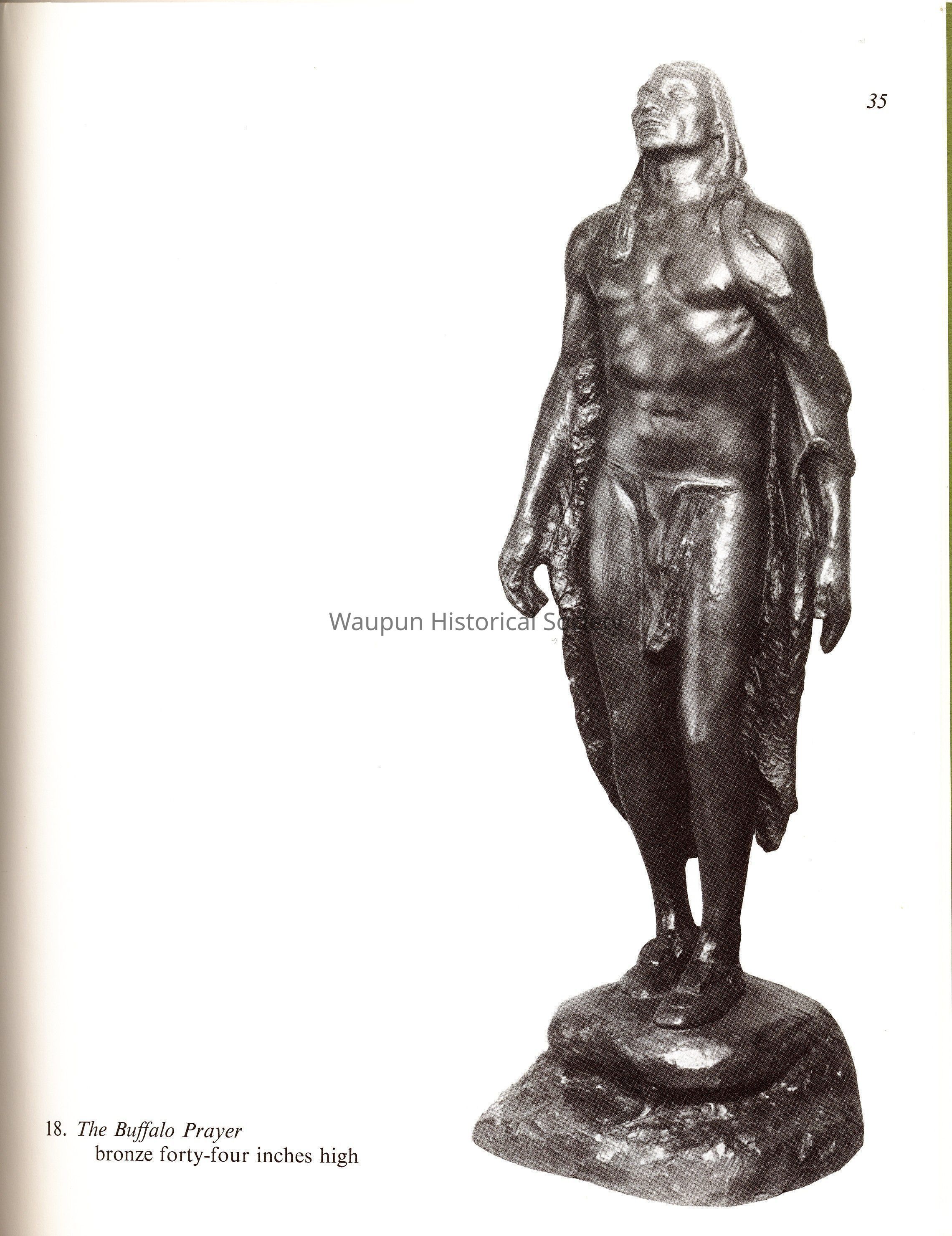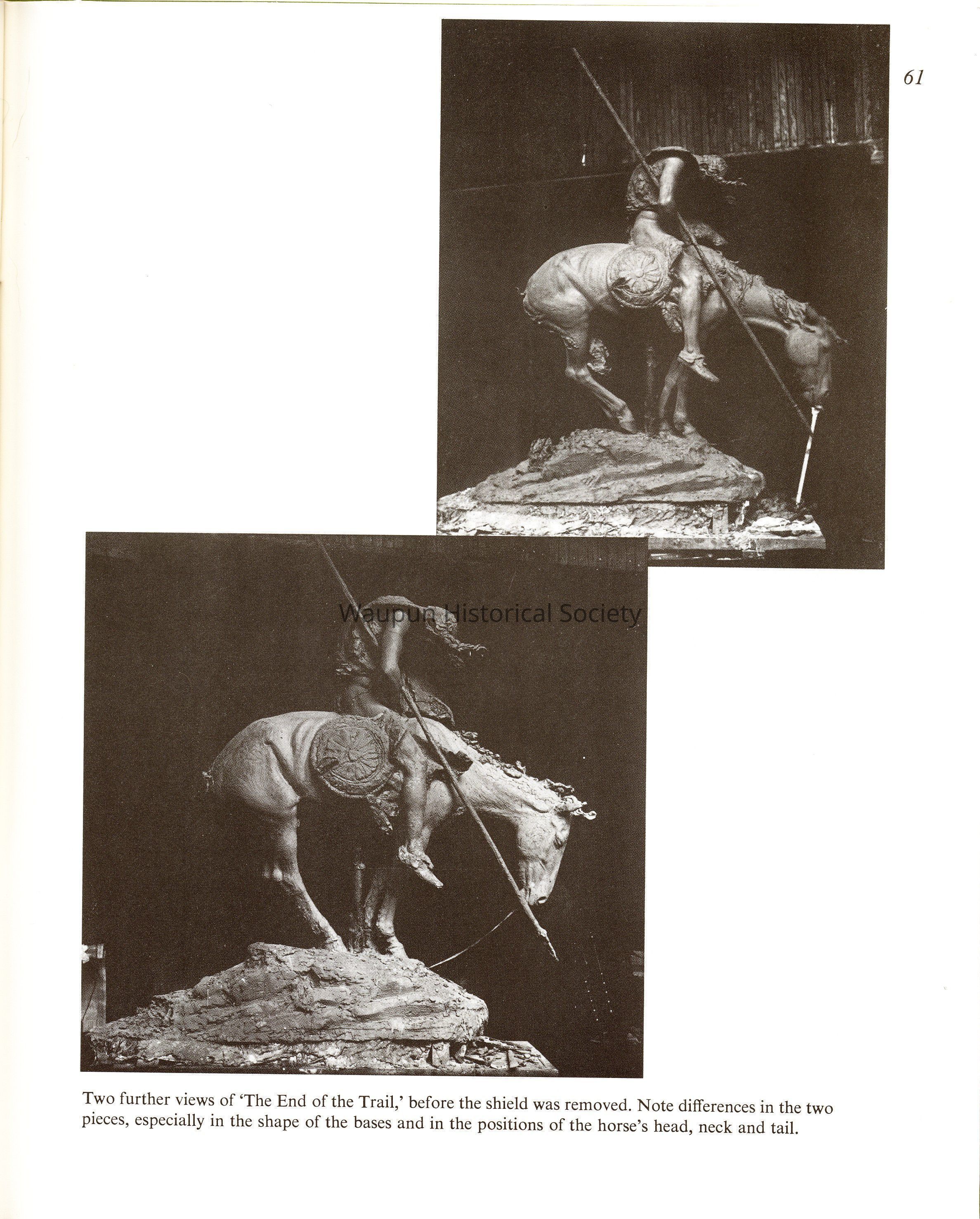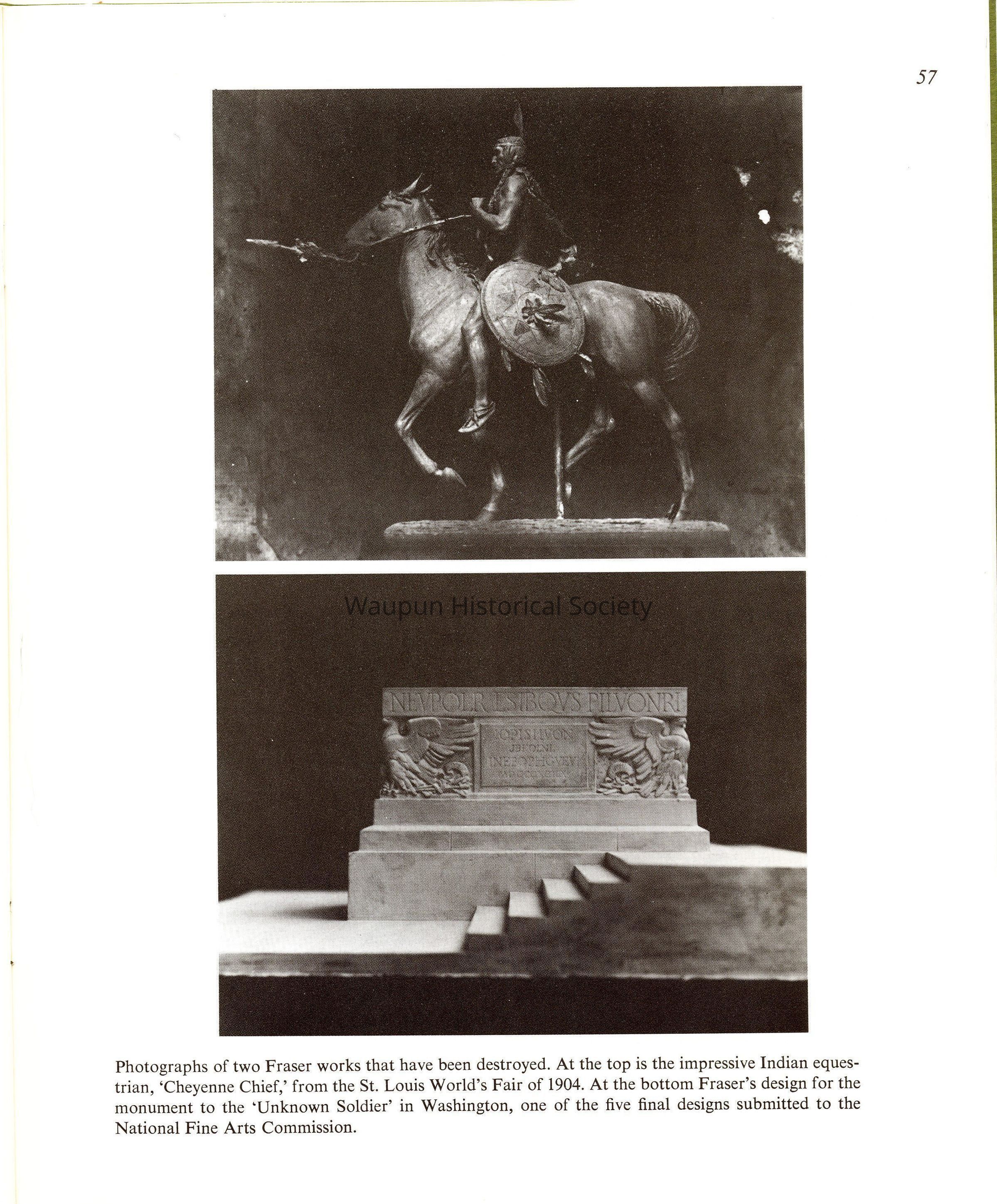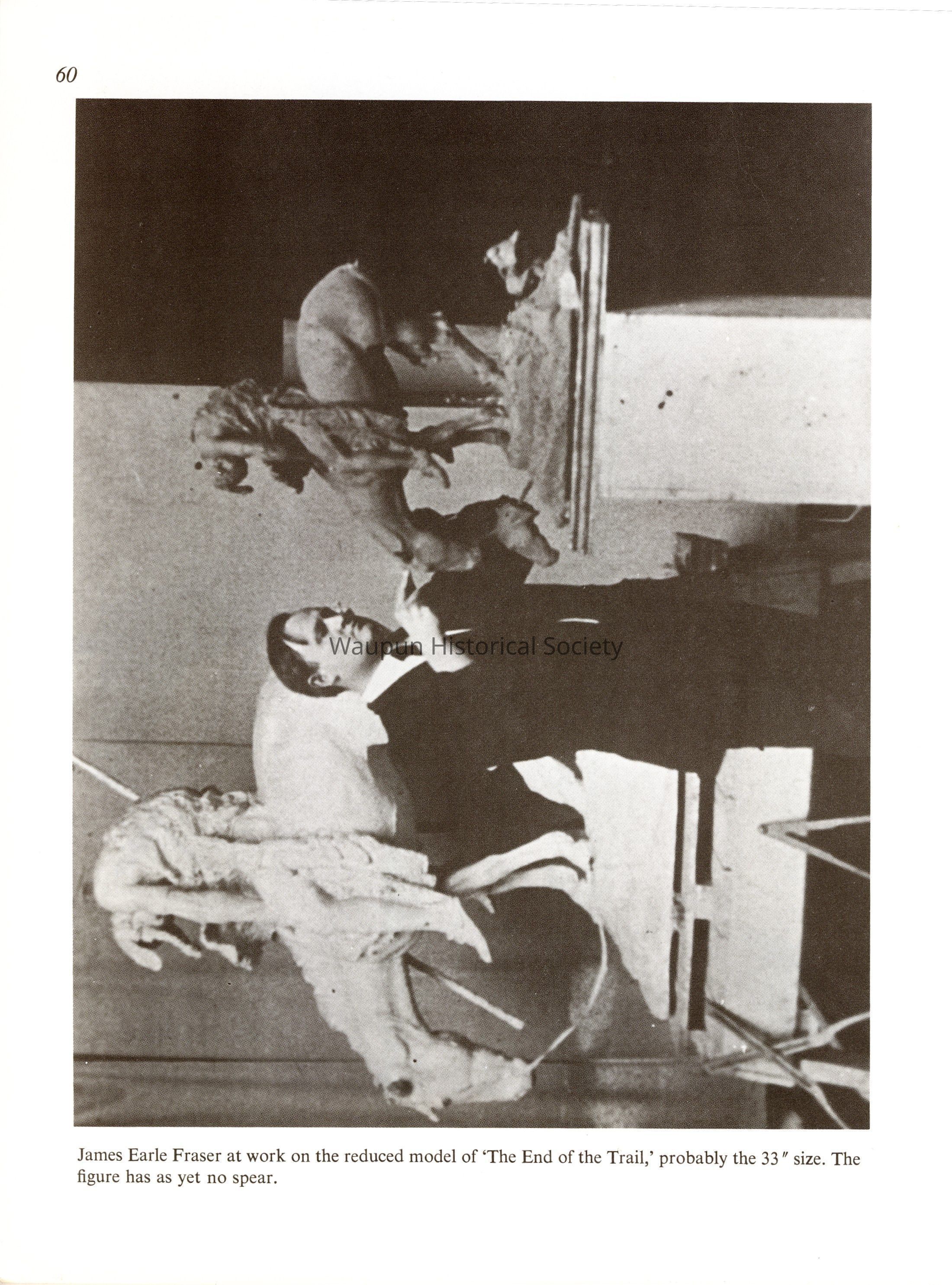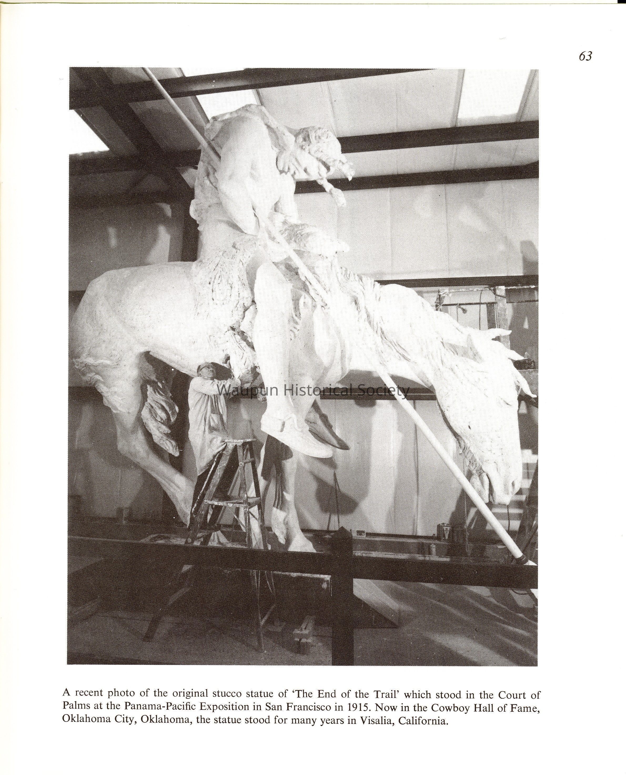 For the Pacific Panama Exposition of 1915, the original small 'End of the Trail' was enlarged to heroic size, and placed in the Court of Palms. After the Exposition, plans were made for casting the statue in bronze and placing it on the Pacific Palisades. Various difficulties, among them the United States entry into the first World War, prevented the achievement of these plans, and the piece went into a 'graveyard' with other sculptural works from the Exposition. It was later purchased for $400., and placed in a park at Visalia, California. (This original stucco piece was purchased within the last couple of years by the Cowboy Hall of Fame, Oklahoma City, Oklahoma, where it is now on exhibit.) A large casting of this statue in bronze was presented to the town of Waupan, (Waupun) Wisconsin by Clarence Shaler, Esquire; it was unveiled in Shaler Park, in 1929. At the time of its unveiling, information was given that the statue was posed for by Seneca chief John Big Tree, in the summer of 1912 at Coney Island. For the horse, as the photograph of page fifty-nine shows, Fraser adapted the small bronze 'Windswept,' or 'In the Wind.' Examples of bronzes of this figure cast during the sculptor's lifetime are found in the Metropolitan Museum, New York, the Detroit Institute of Arts, the City Art Museum of Saint Louis, Brookgreen Gardens, and a small number of private collections.
