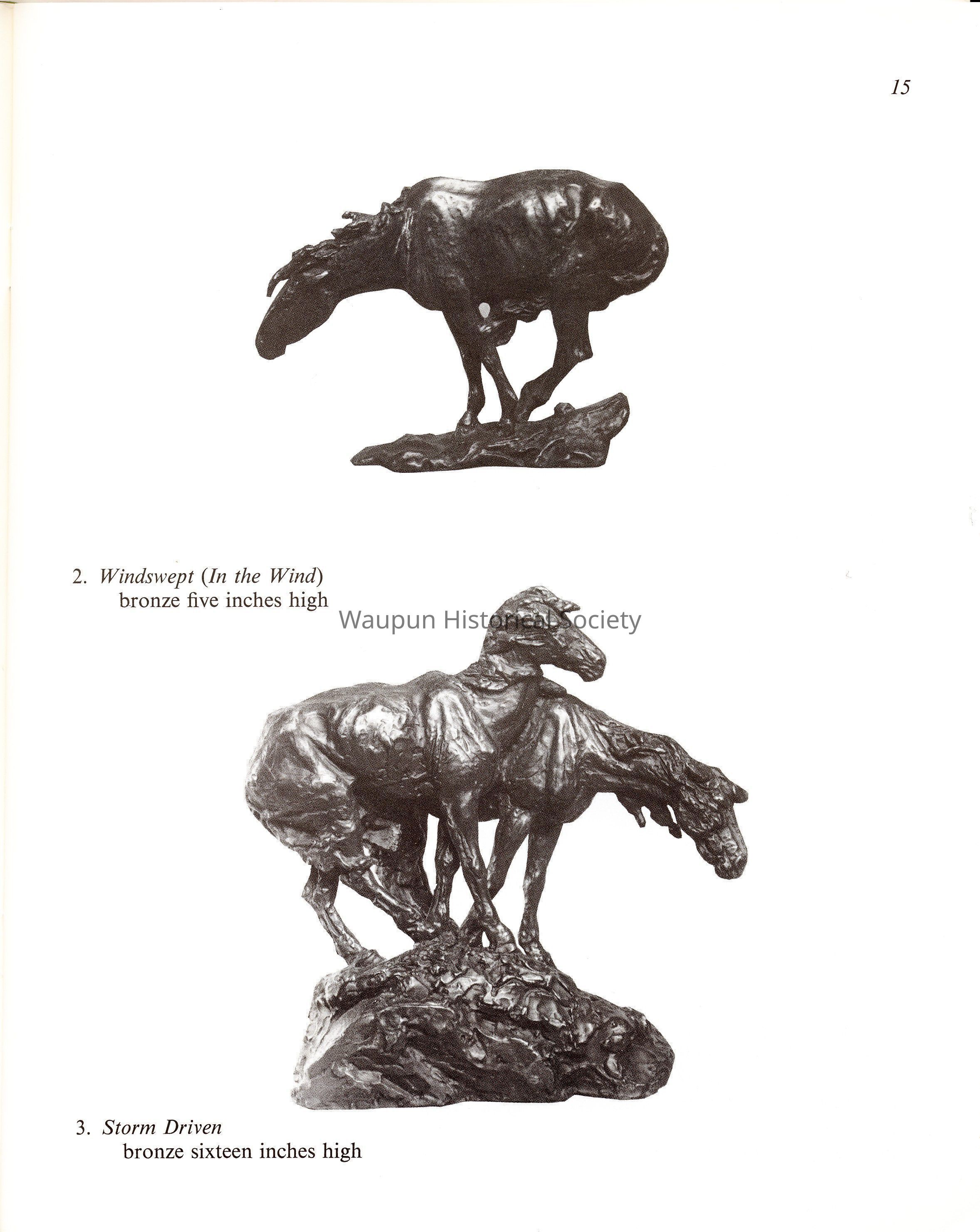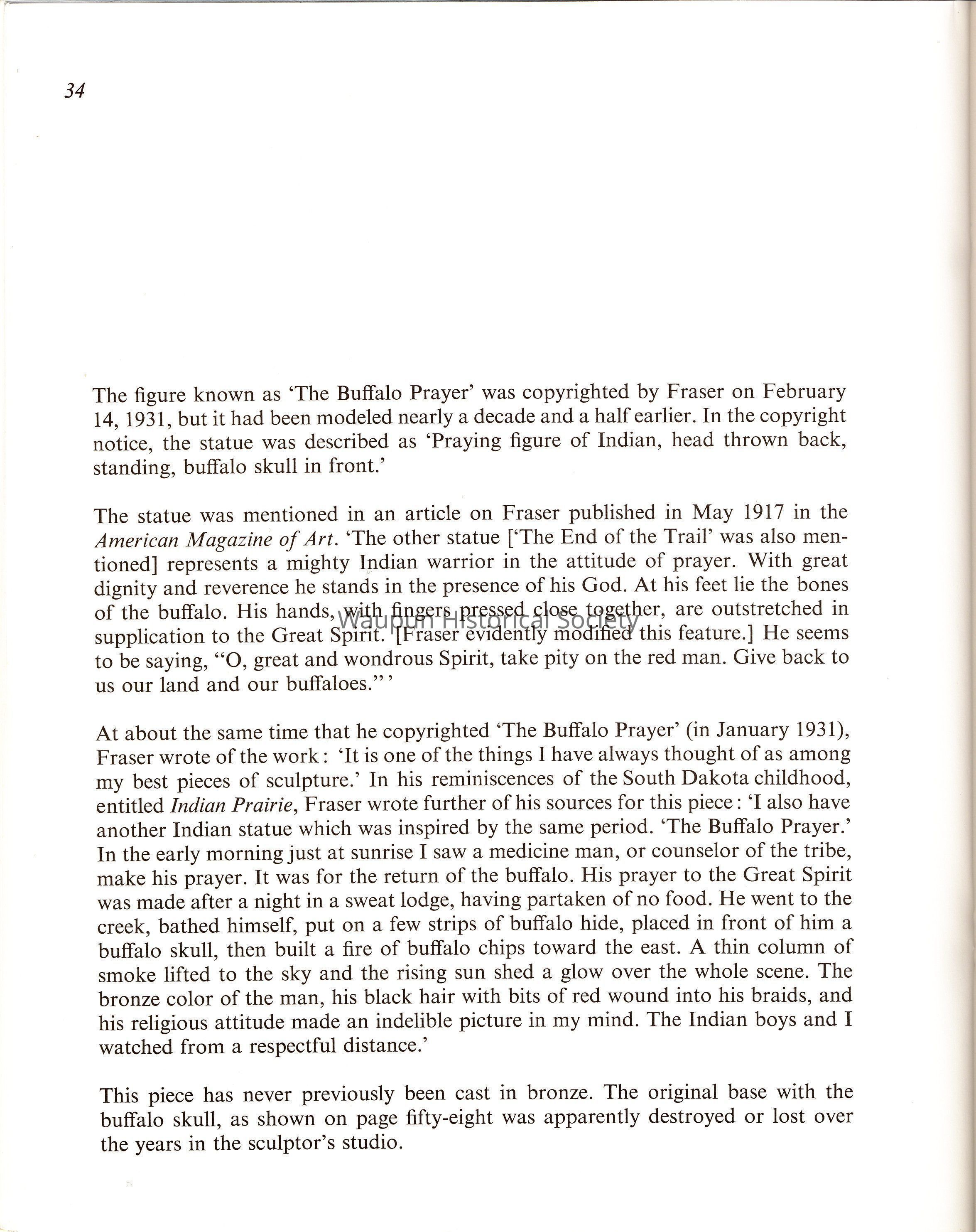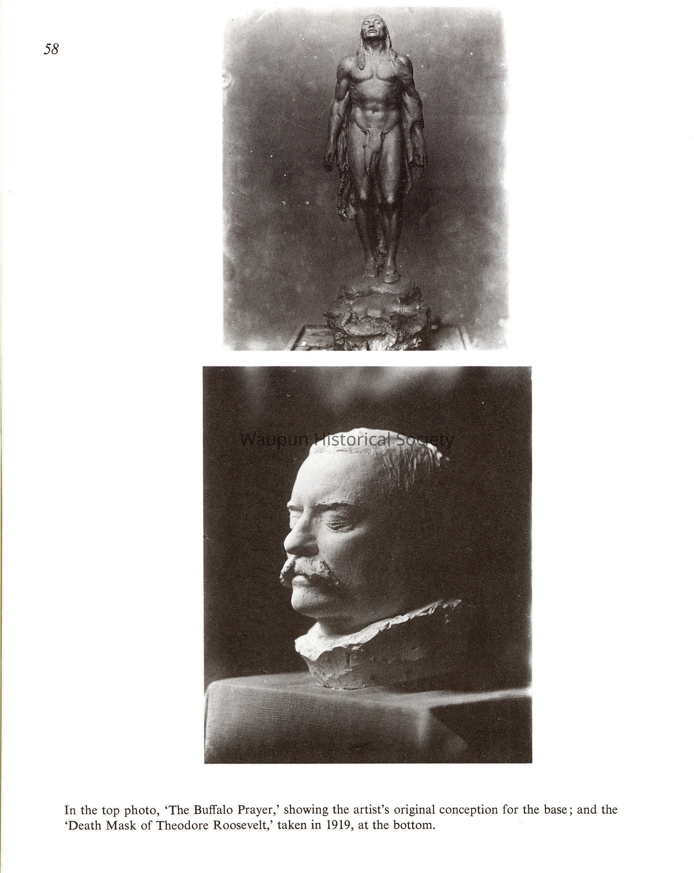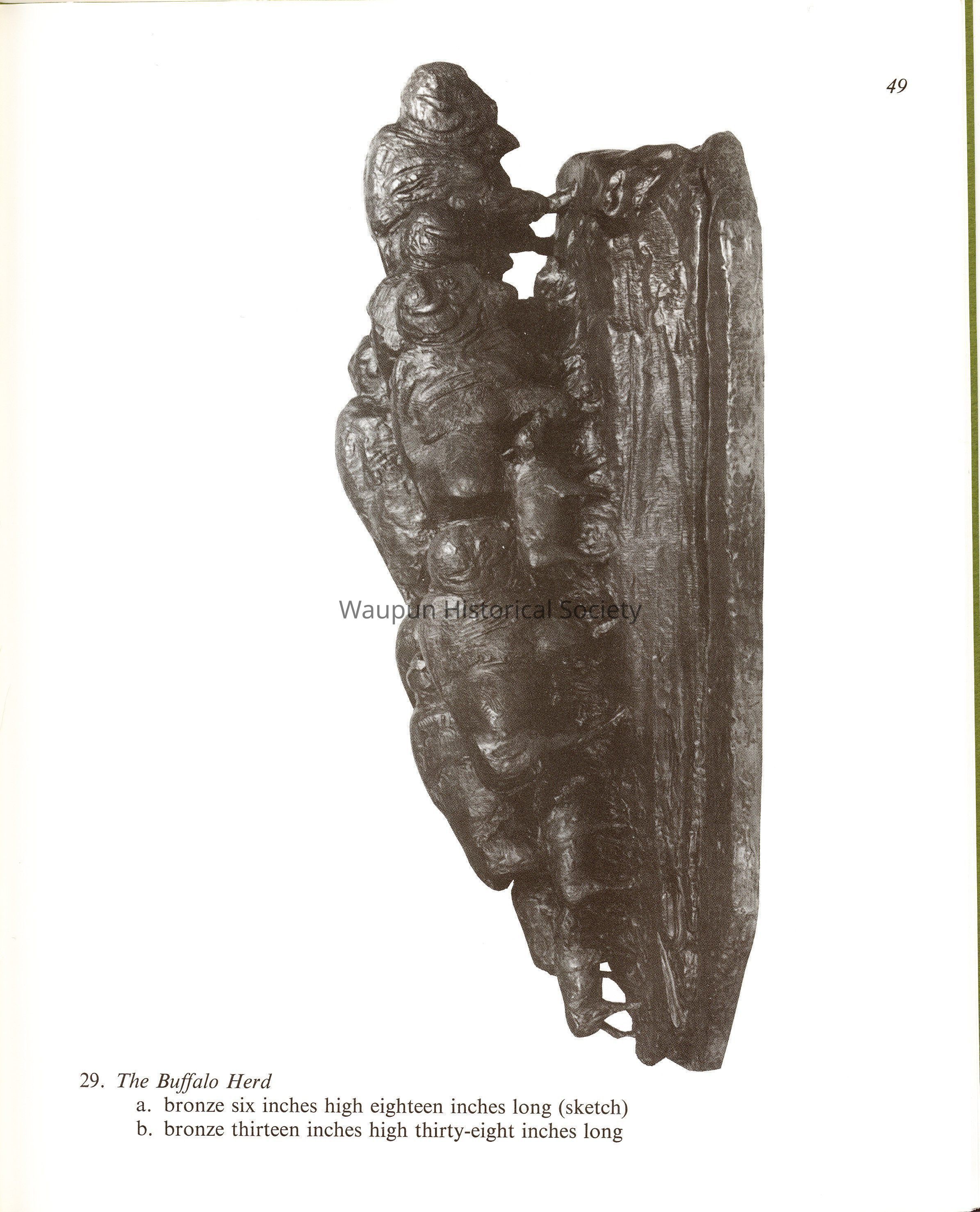 For the Pacific Panama Exposition of 1915, the original small 'End of the Trail' was enlarged to heroic size, and placed in the Court of Palms. After the Exposition, plans were made for casting the statue in bronze and placing it on the Pacific Palisades. Various difficulties, among them the United States entry into the first World War, prevented the achievement of these plans, and the piece went into a 'graveyard' with other sculptural works from the Exposition. It was later purchased for $400., and placed in a park at Visalia, California. (This original stucco piece was purchased within the last couple of years by the Cowboy Hall of Fame, Oklahoma City, Oklahoma, where it is now on exhibit.) A large casting of this statue in bronze was presented to the town of Waupan, (Waupun) Wisconsin by Clarence Shaler, Esquire; it was unveiled in Shaler Park, in 1929. At the time of its unveiling, information was given that the statue was posed for by Seneca chief John Big Tree, in the summer of 1912 at Coney Island. For the horse, as the photograph of page fifty-nine shows, Fraser adapted the small bronze 'Windswept,' or 'In the Wind.' Examples of bronzes of this figure cast during the sculptor's lifetime are found in the Metropolitan Museum, New York, the Detroit Institute of Arts, the City Art Museum of Saint Louis, Brookgreen Gardens, and a small number of private collections.