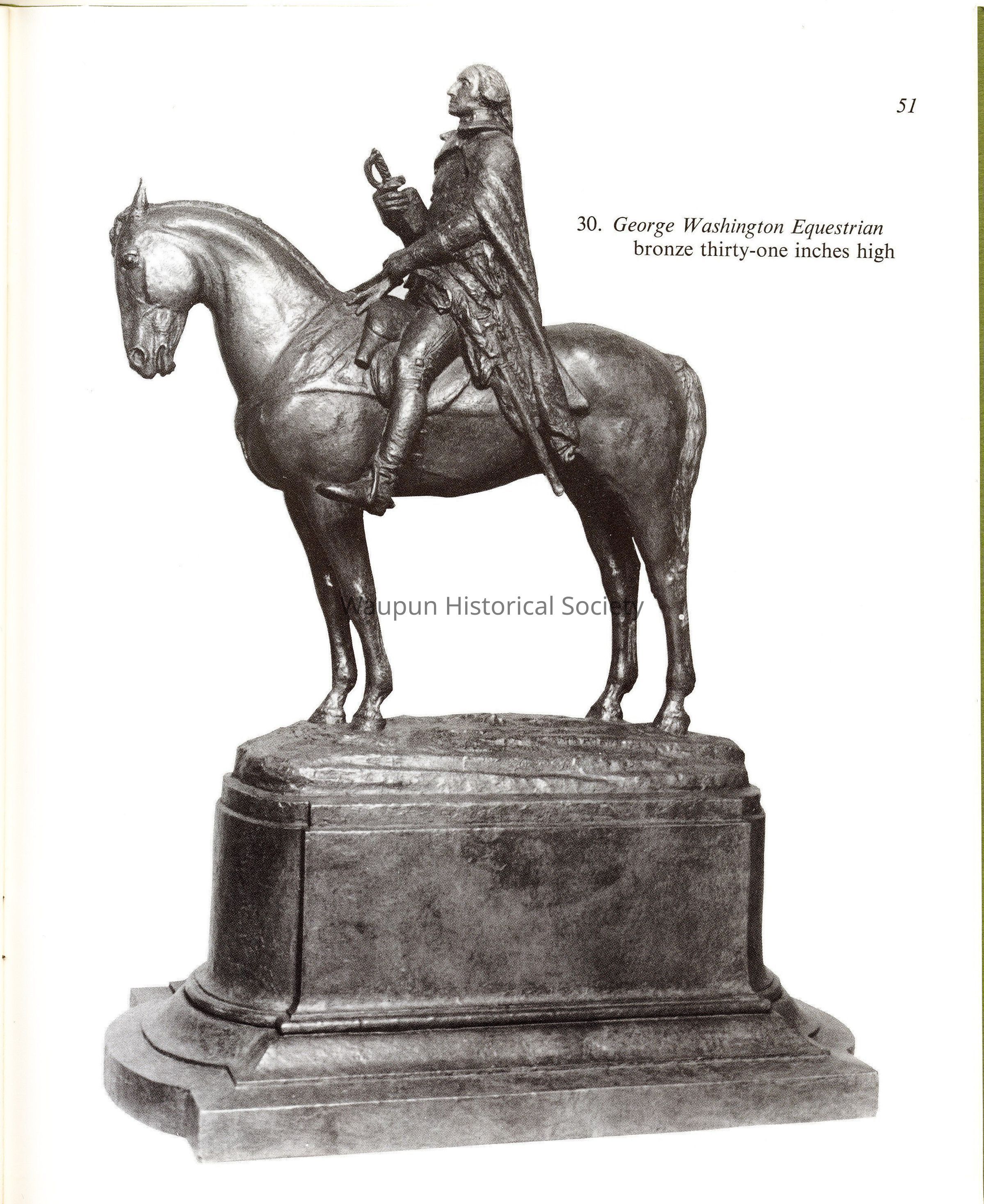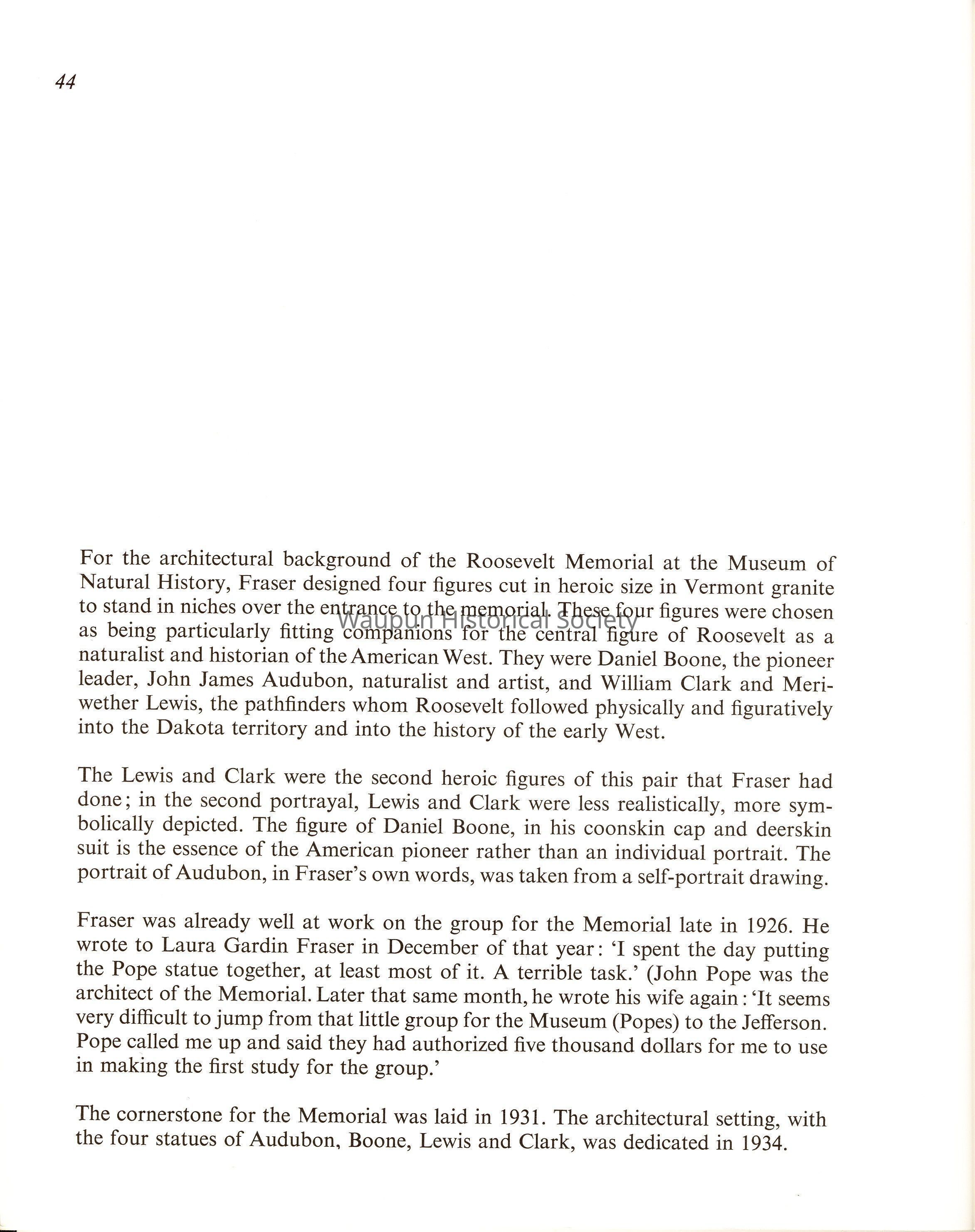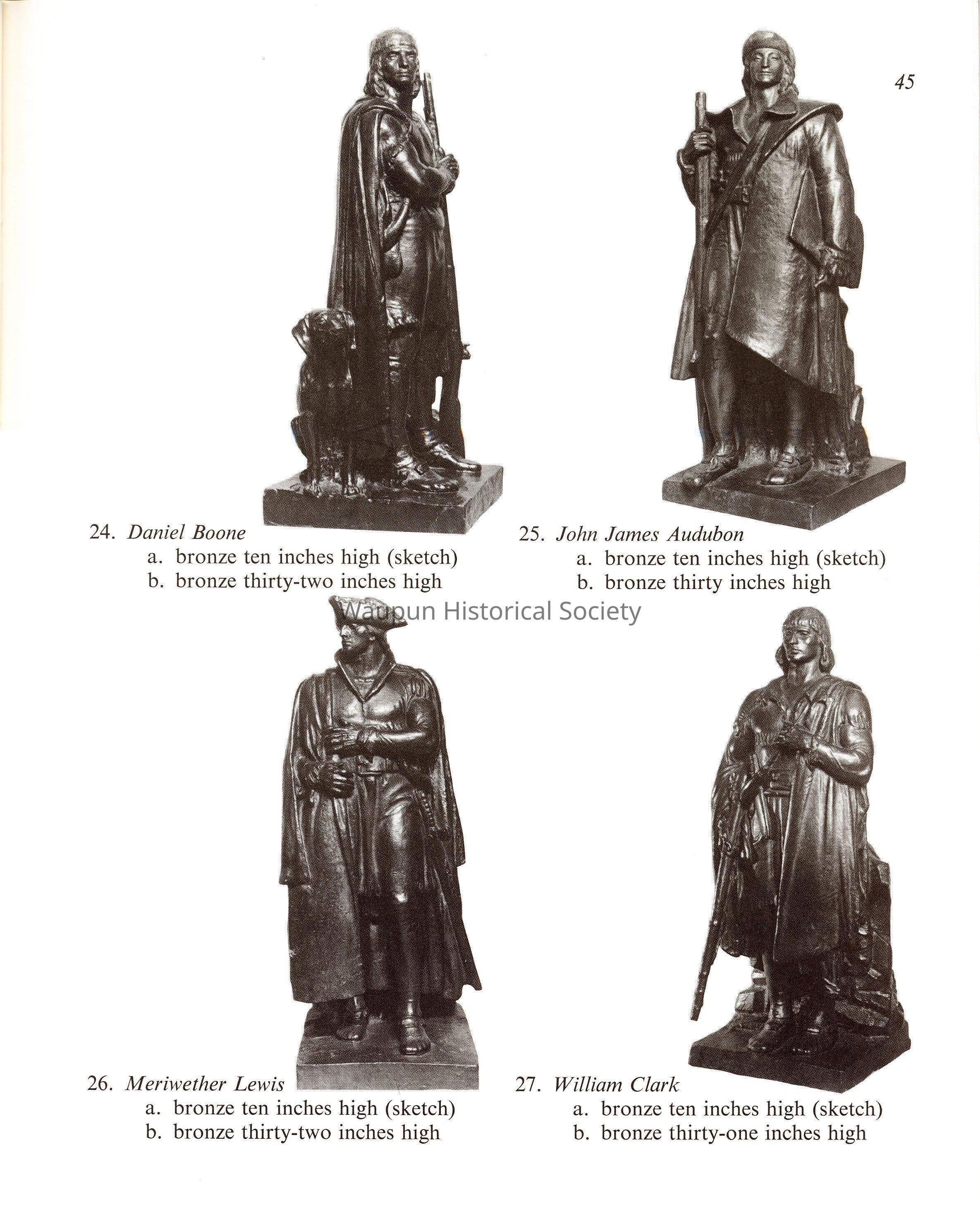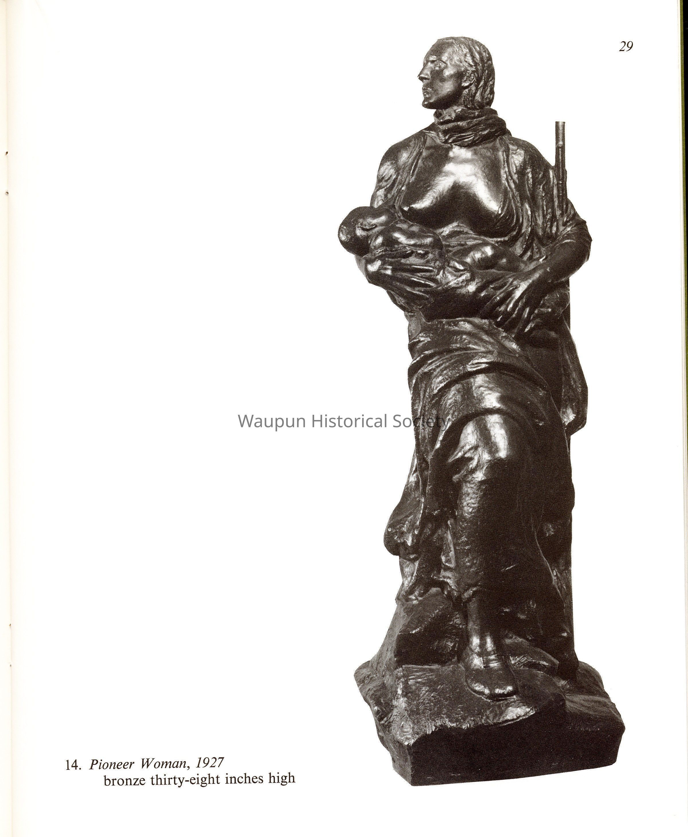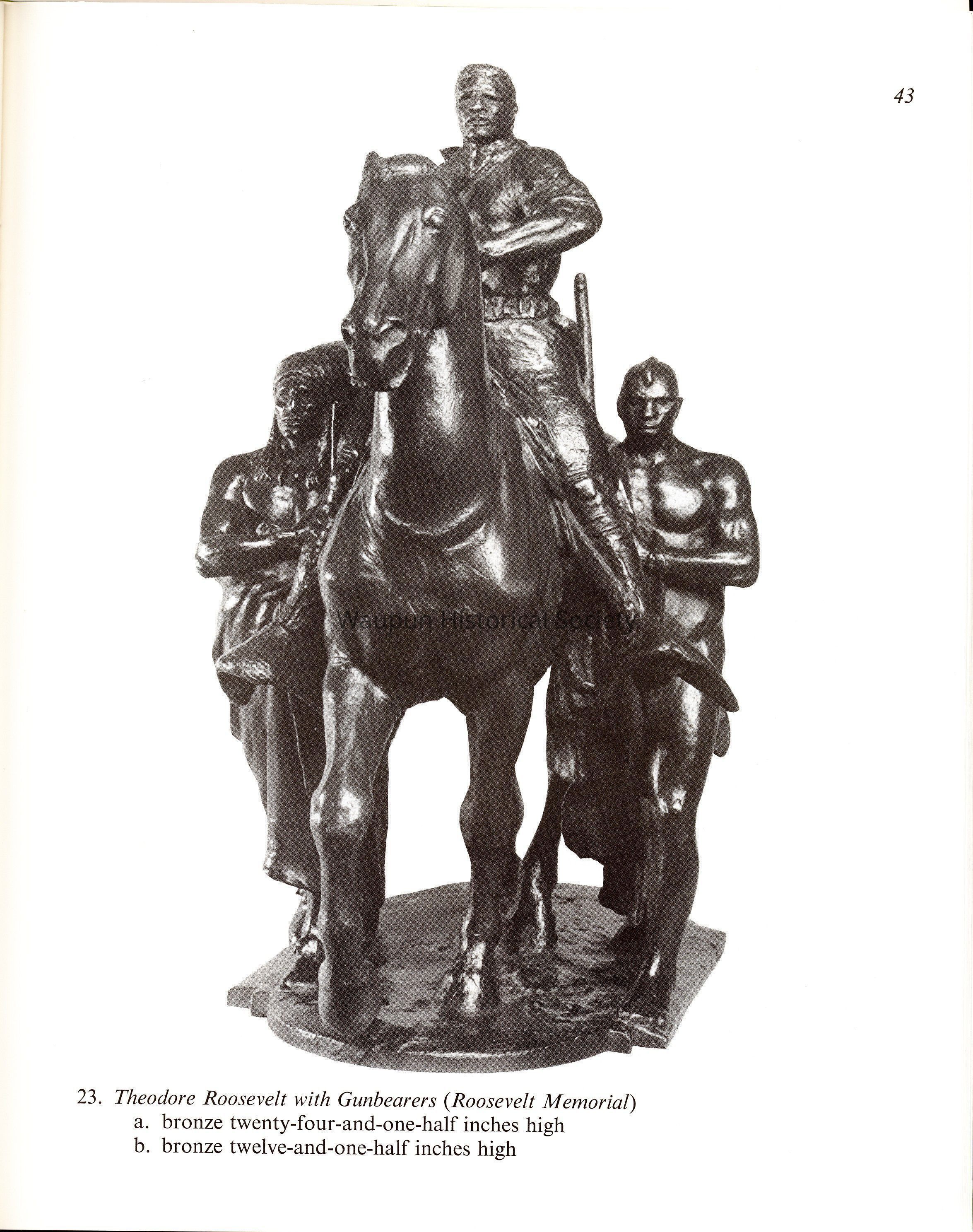 For the Pacific Panama Exposition of 1915, the original small 'End of the Trail' was enlarged to heroic size, and placed in the Court of Palms. After the Exposition, plans were made for casting the statue in bronze and placing it on the Pacific Palisades. Various difficulties, among them the United States entry into the first World War, prevented the achievement of these plans, and the piece went into a 'graveyard' with other sculptural works from the Exposition. It was later purchased for $400., and placed in a park at Visalia, California. (This original stucco piece was purchased within the last couple of years by the Cowboy Hall of Fame, Oklahoma City, Oklahoma, where it is now on exhibit.) A large casting of this statue in bronze was presented to the town of Waupan, (Waupun) Wisconsin by Clarence Shaler, Esquire; it was unveiled in Shaler Park, in 1929. At the time of its unveiling, information was given that the statue was posed for by Seneca chief John Big Tree, in the summer of 1912 at Coney Island. For the horse, as the photograph of page fifty-nine shows, Fraser adapted the small bronze 'Windswept,' or 'In the Wind.' Examples of bronzes of this figure cast during the sculptor's lifetime are found in the Metropolitan Museum, New York, the Detroit Institute of Arts, the City Art Museum of Saint Louis, Brookgreen Gardens, and a small number of private collections.