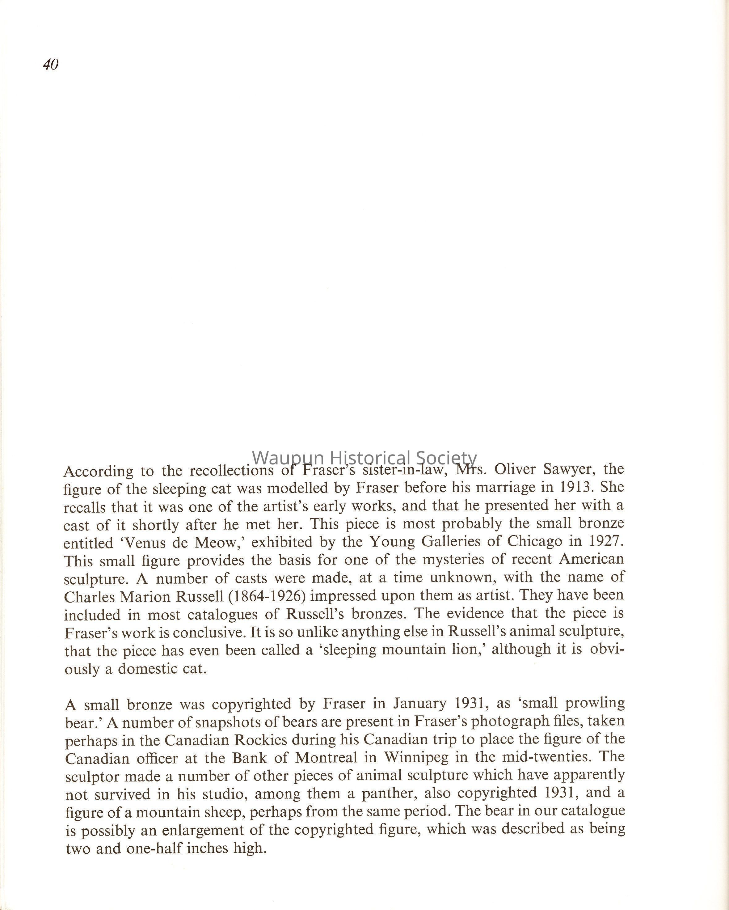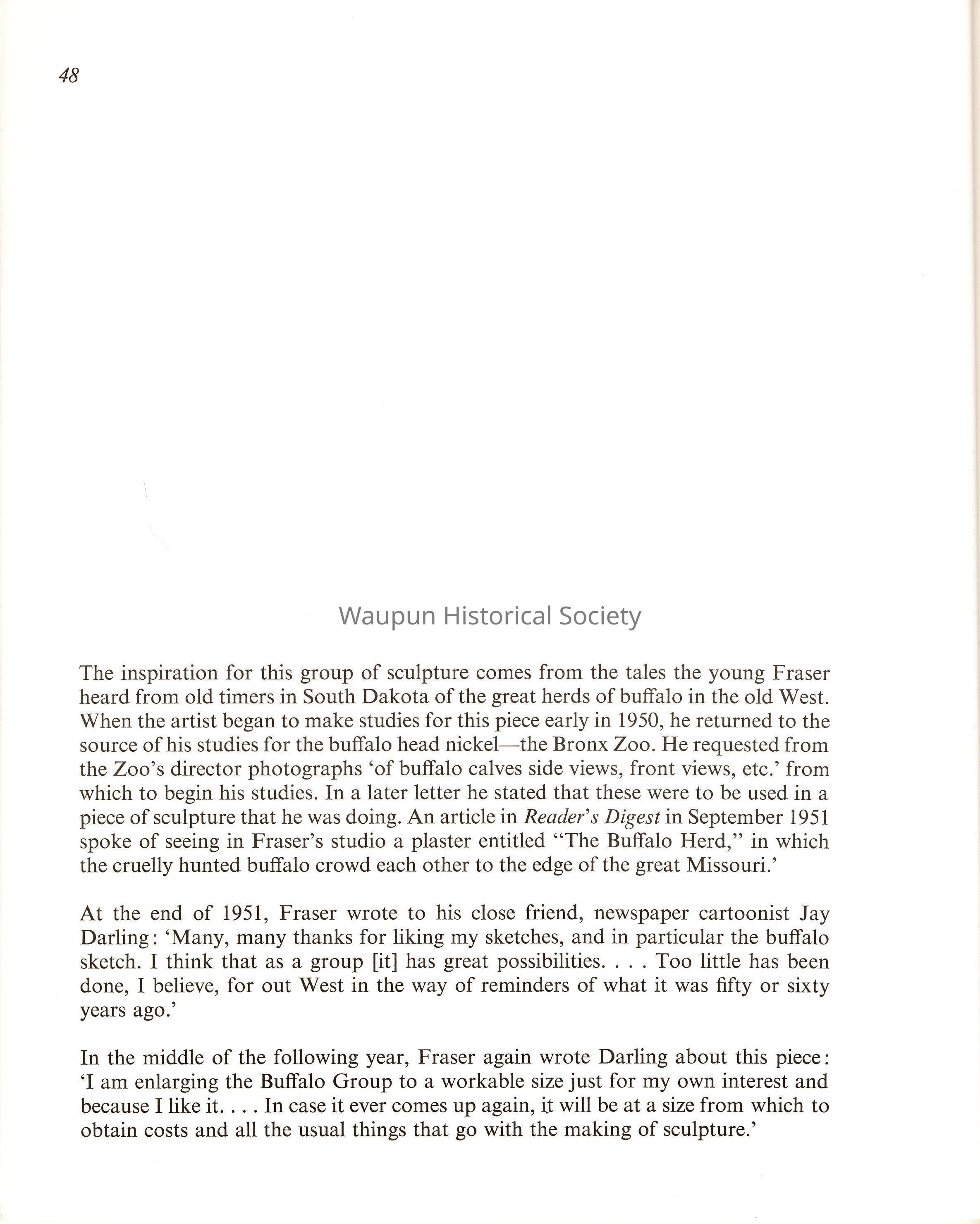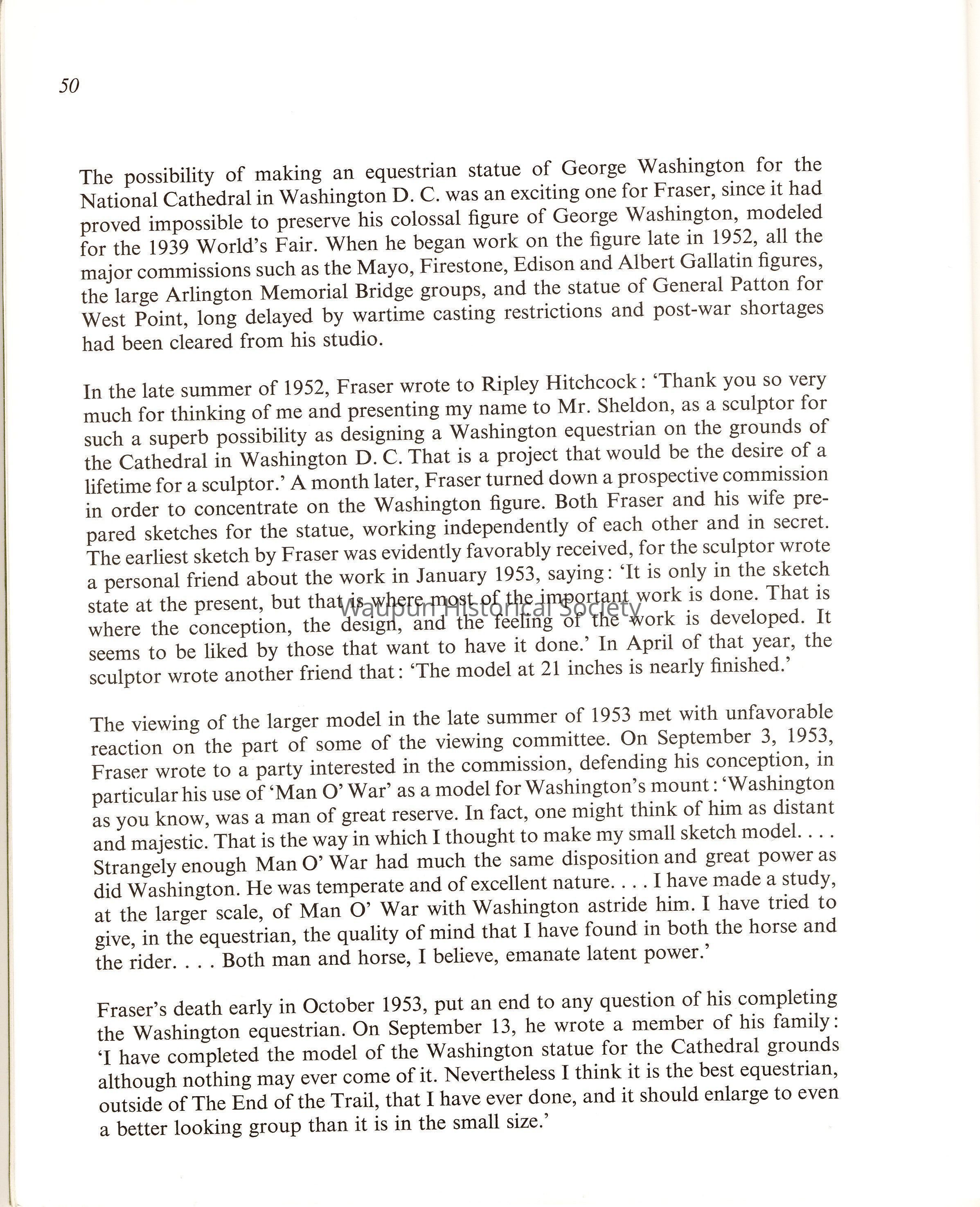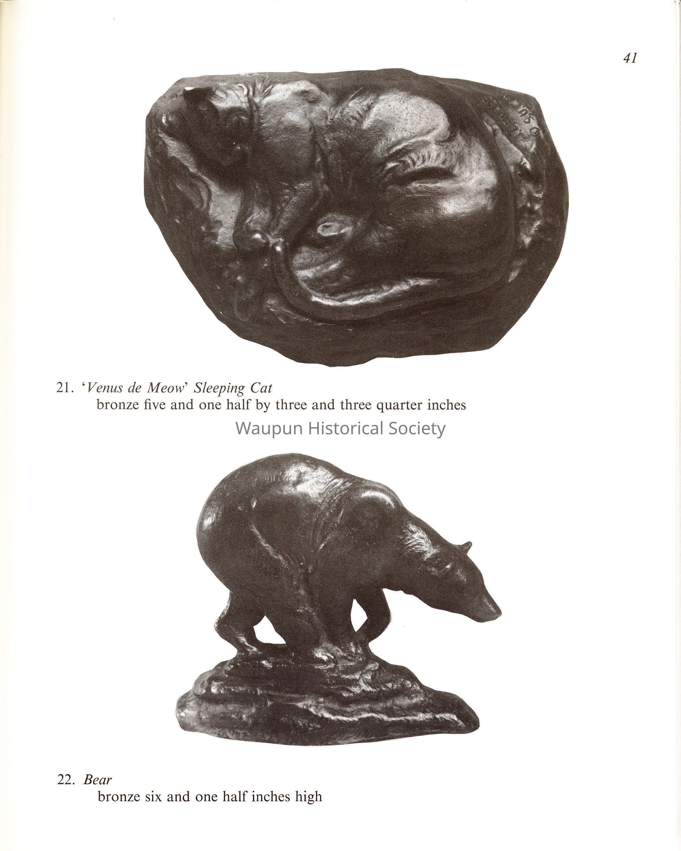 For the Pacific Panama Exposition of 1915, the original small 'End of the Trail' was enlarged to heroic size, and placed in the Court of Palms. After the Exposition, plans were made for casting the statue in bronze and placing it on the Pacific Palisades. Various difficulties, among them the United States entry into the first World War, prevented the achievement of these plans, and the piece went into a 'graveyard' with other sculptural works from the Exposition. It was later purchased for $400., and placed in a park at Visalia, California. (This original stucco piece was purchased within the last couple of years by the Cowboy Hall of Fame, Oklahoma City, Oklahoma, where it is now on exhibit.) A large casting of this statue in bronze was presented to the town of Waupan, (Waupun) Wisconsin by Clarence Shaler, Esquire; it was unveiled in Shaler Park, in 1929. At the time of its unveiling, information was given that the statue was posed for by Seneca chief John Big Tree, in the summer of 1912 at Coney Island. For the horse, as the photograph of page fifty-nine shows, Fraser adapted the small bronze 'Windswept,' or 'In the Wind.' Examples of bronzes of this figure cast during the sculptor's lifetime are found in the Metropolitan Museum, New York, the Detroit Institute of Arts, the City Art Museum of Saint Louis, Brookgreen Gardens, and a small number of private collections.