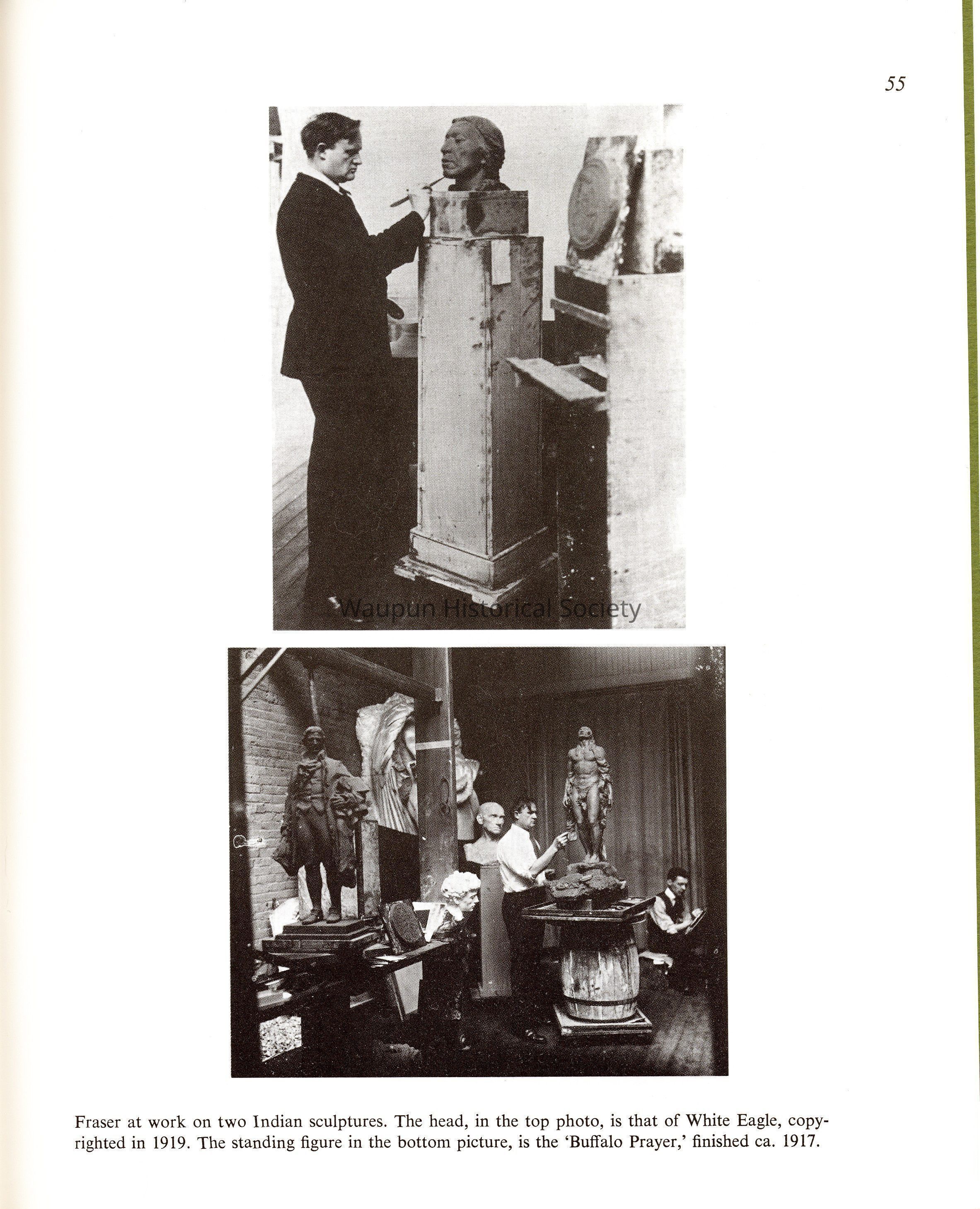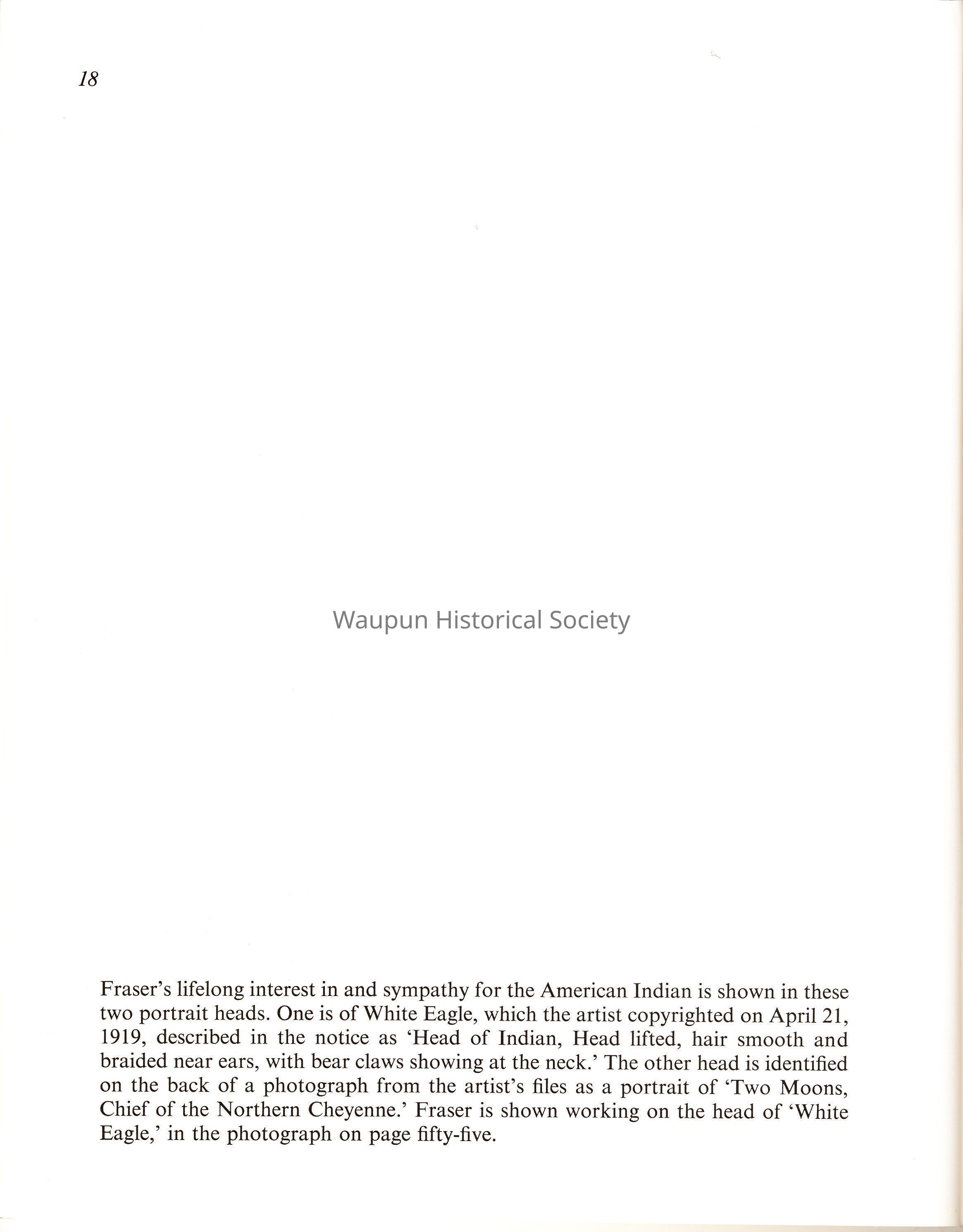 Fraser's lifelong interest in and sympathy for the American Indian is shown in these two portrait heads. One is of White Eagle, which the artist copyrighted on April 21, 1919, described in the notice as 'Head of Indian, Head lifted, hair smooth and braided near ears, with bear claws showing at the neck.' The other head is identified on the back of a photograph from the artist's files as a portrait of 'Two Moons, Chief of the Northern Cheyenne.' Fraser is shown working on the head of 'White Eagle,' in the photograph on page fifty-five.
