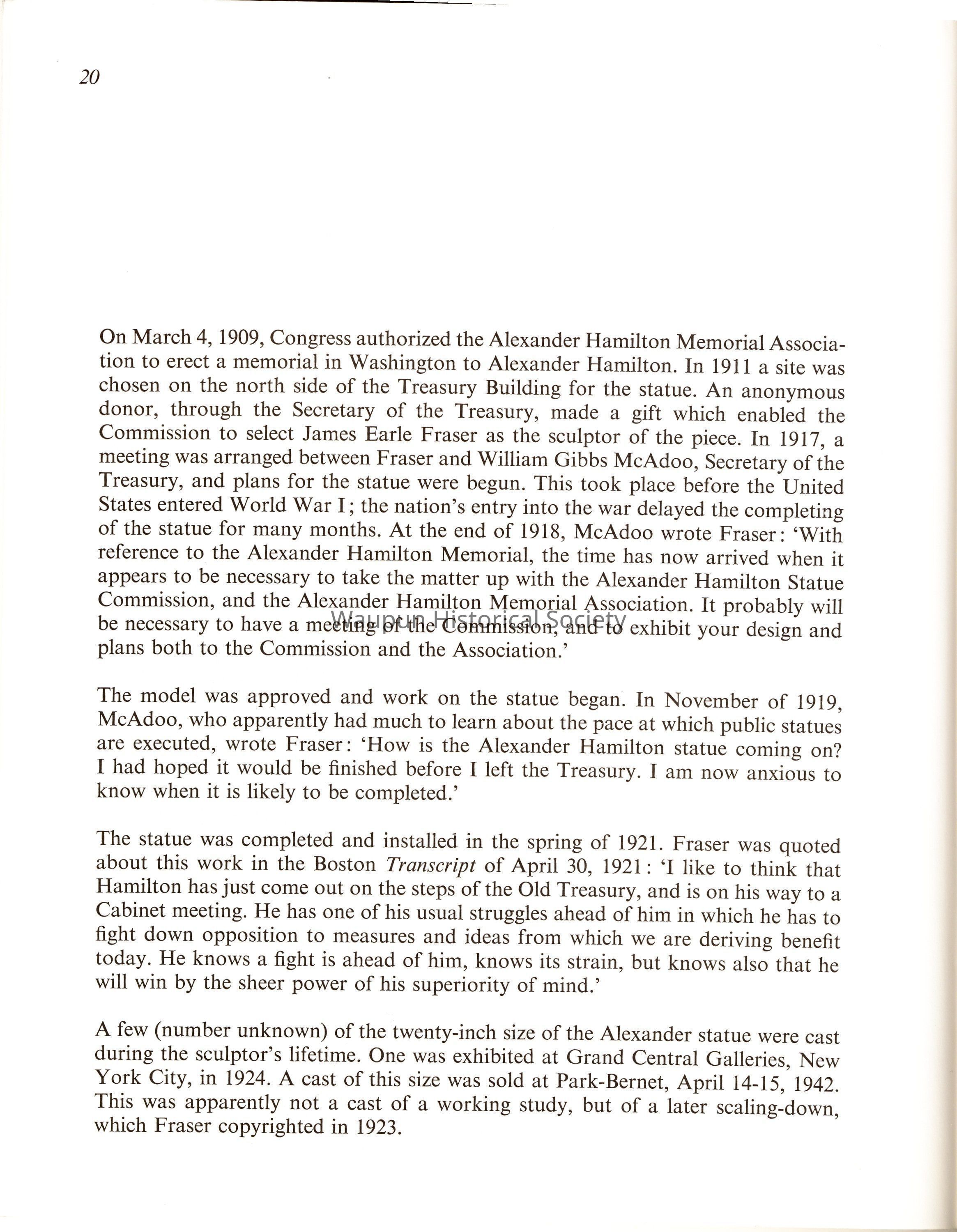 The model was approved and work on the statue began. In November of 1919, McAdoo, who apparently had much to learn about the pace at which public statues are executed, wrote Fraser: 'How is the Alexander Hamilton statue coming on? I had hoped it would be finished before I left the Treasury. I am now anxious to know when it is likely to be completed.'