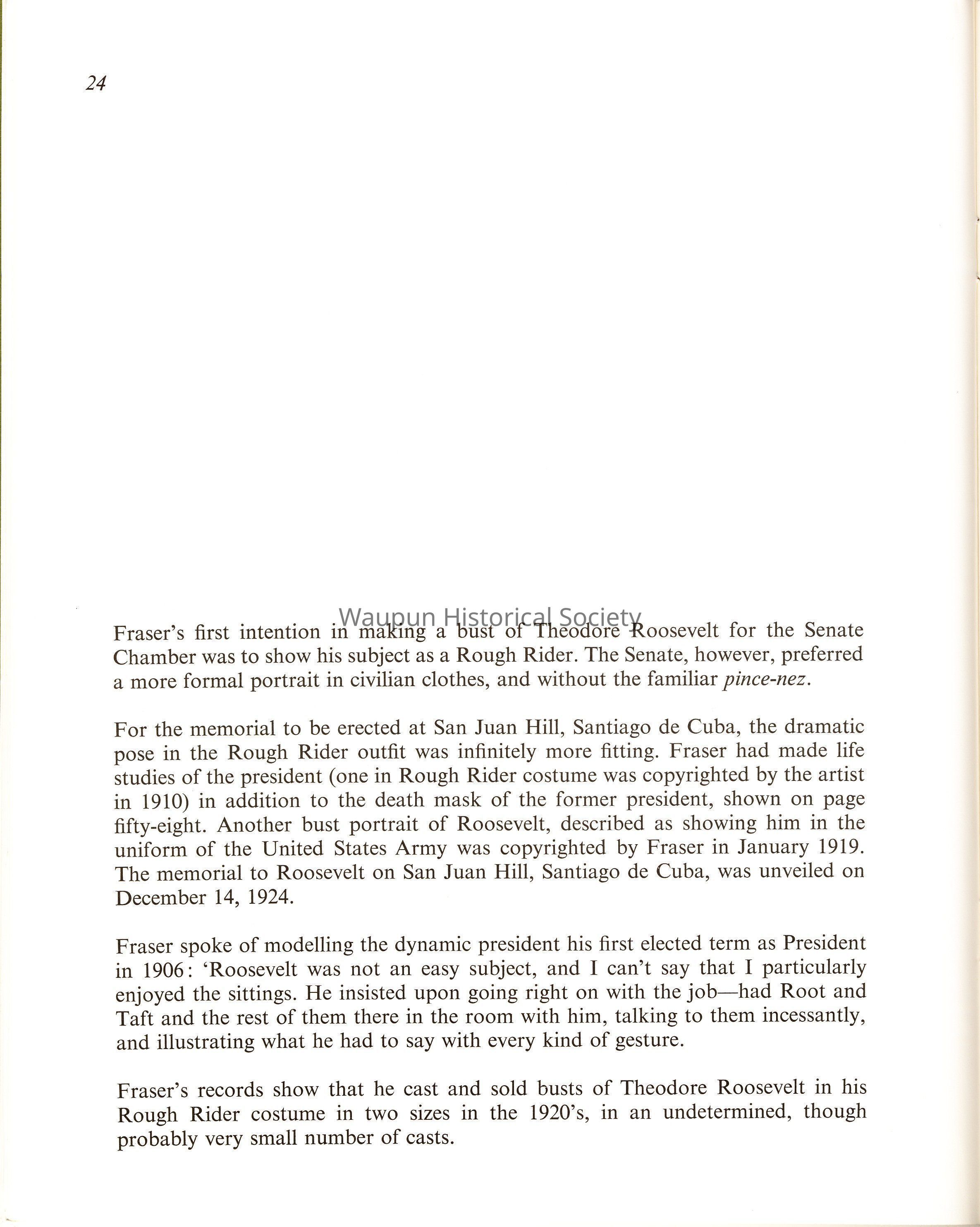Fraser also made a number of portraits of adults during this early period. Among them are, two fellow artists of McDougal Alley, J. Eastman Chase and E. W. Deming, three heads of Indians later used for the study of the Buffalo nickel; Warren Delano; E. H. Harriman; Walter Goodwin; Dr. Louis Ledoux; Charles Dana Gibson (ca. 1918) Morris K. Jessup; Pat Ford; Mr. and Mrs. John Jacob Albright; Dr. William Polk, of the Cornell Medical Library; a commemorative plaque for M. H. Schoelkopf. Perhaps his most important early commission was for the marble bust of Theodore Roosevelt for the Senate Chamber, begun in 1906. From this commission followed not only other portraits of Roosevelt, but of men connected with him: Roger Bacon, Elihu Root (two different portraits) and later the William Howard Taft Memorial. Fraser's work was not confined to portraits; he designed sculptured ornaments for the Fine Arts Academy, Buffalo, New York, and also an ornamental vase for the City of Buffalo. For the garden of the E. H. Harriman house in Arden, New York, he designed a fountain with a classical figure playing with a tortoise and a panther. 'A Basque,' one of 'a series of studies of old men' he made about 1910, went to the Hispanic Society, New York.