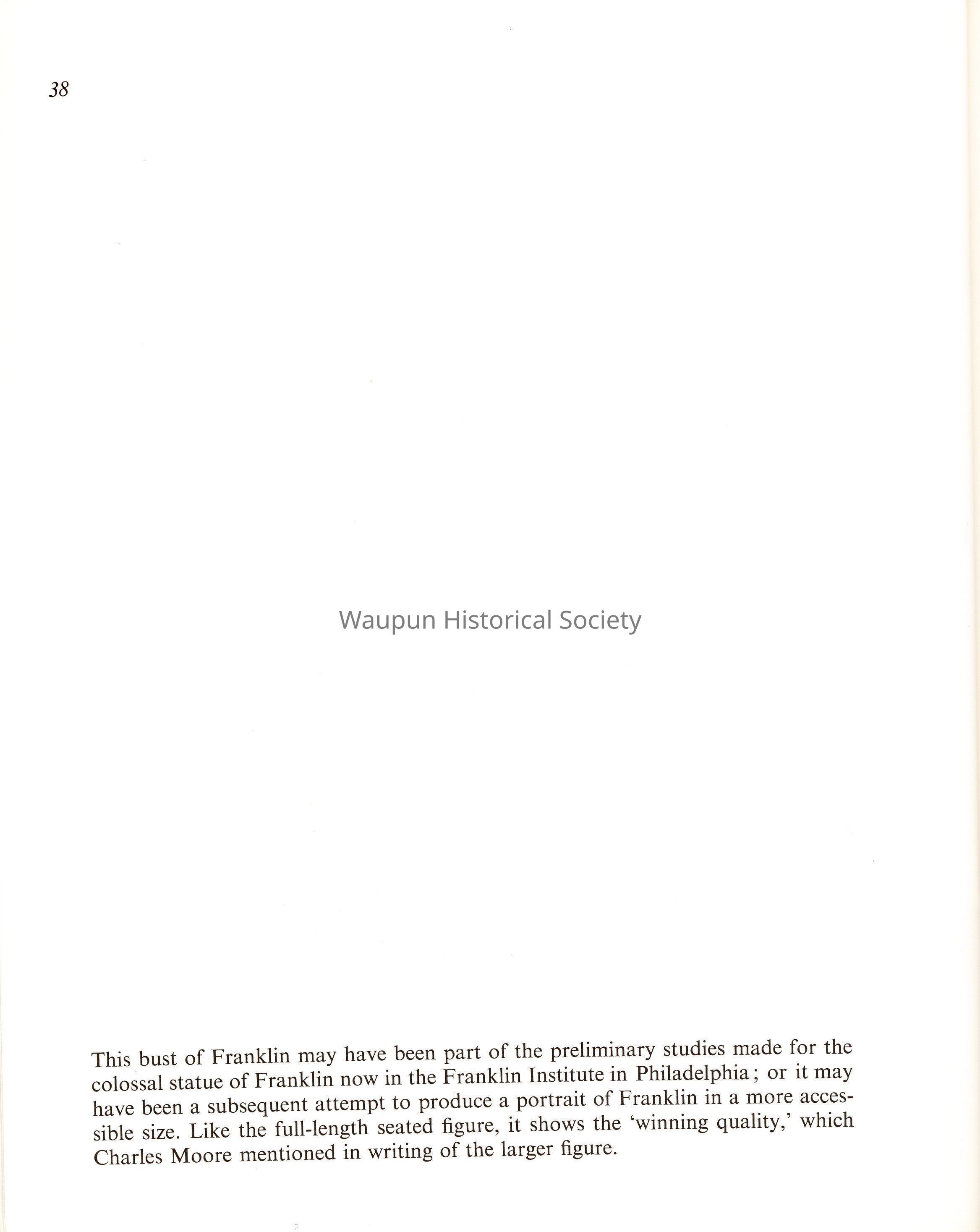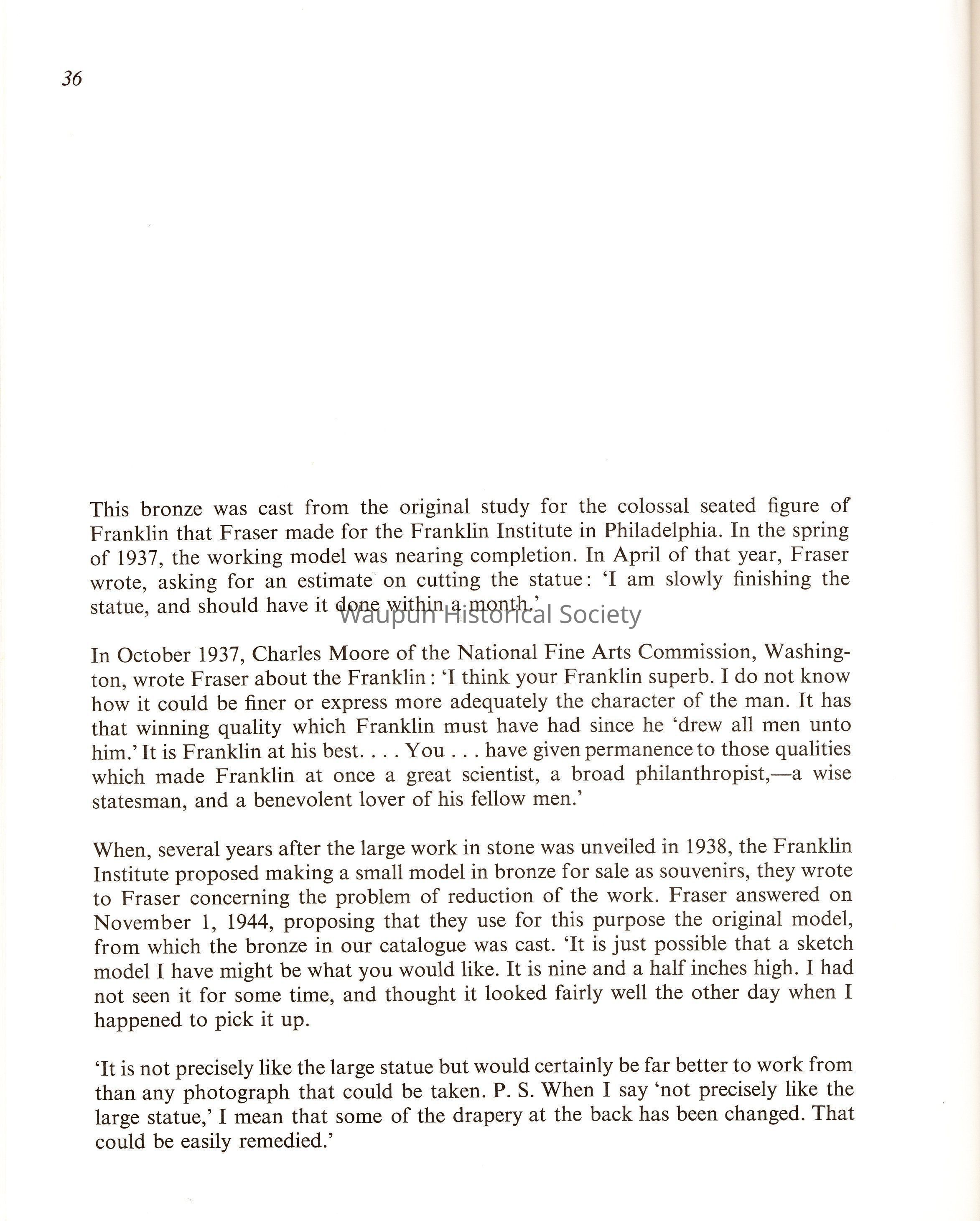 The rate of commissions continued into the thirties. Fraser designed pediments for the Archives and the Commerce buildings in Washington D. C. Two large figures by him were placed in front of both the Archives and the Supreme Court Buildings. The 'Second Division Memorial', called also the 'Mons Sector Memorial,' was dedicated in 1936. A large marble Franklin for the Franklin Institute in Philadelphia, and a portrait of Thomas Edison for the Edison Institute, Dearborn, Michigan were other works of this period. In 1938, Fraser modeled his second bust of a vice president for the Senate Chamber, this one of John Nance Garner. For the 1939 New York World's Fair, he designed a colossal sixty-five foot figure of George Washington. A bust of Washington and a plaque of an Indian also by Fraser decorated the State Reception Room at the Fair. Work on the New York State Memorial for Theodore Roosevelt at the American Museum of Natural History occupied him for much of the decade. It was finally dedicated in 1940.