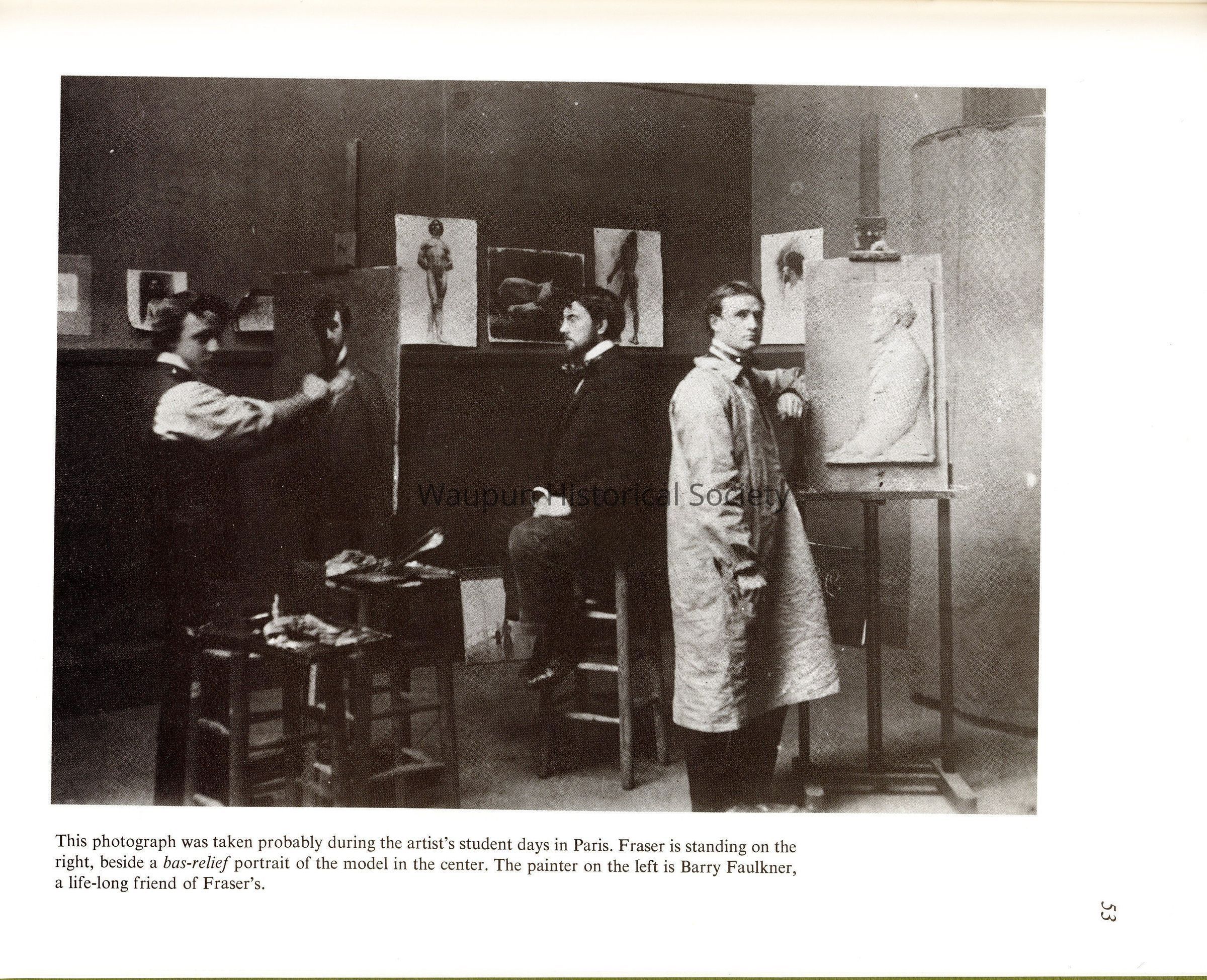 At the age of twenty Fraser went to Paris to study. With him he took the head of the laborer, John Riley, and the 'End of the Trail.' He enrolled for formal studies at the ecole des Beaux Arts under Falguiere, and also studied at the Academie Colarossi. All of his studies in Paris were not academic; he cycled over much of the French countryside surrounding the capital, seeing cathedrals, castles and works of art. He spent a summer painting in Holland, and crossed the Alps into Italy. His prize winning exhibit at the American Art Association Exhibition in 1898 won him also an invitation from Augustus Saint-Gaudens to work in his studio. When Saint-Gaudens returned to the United States in 1900 to finish the statue of General Sherman now at Fifth Avenue and Fifty-ninth Street in New York, Fraser came with him.