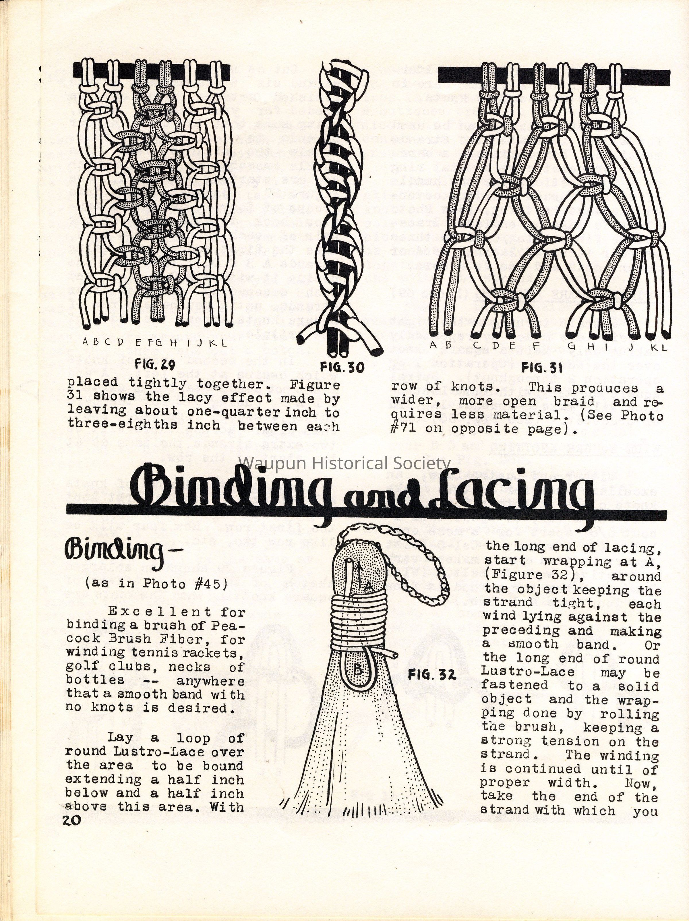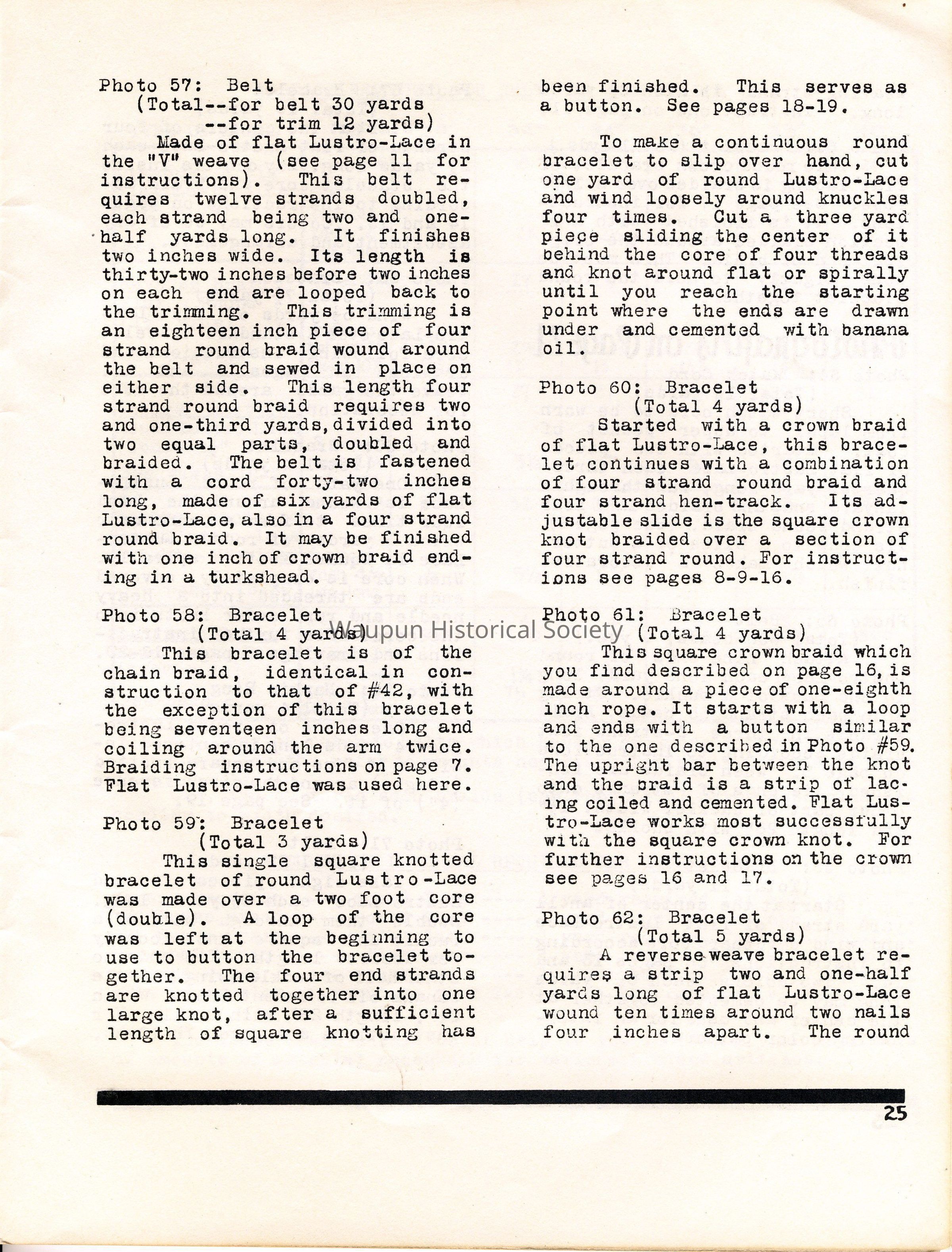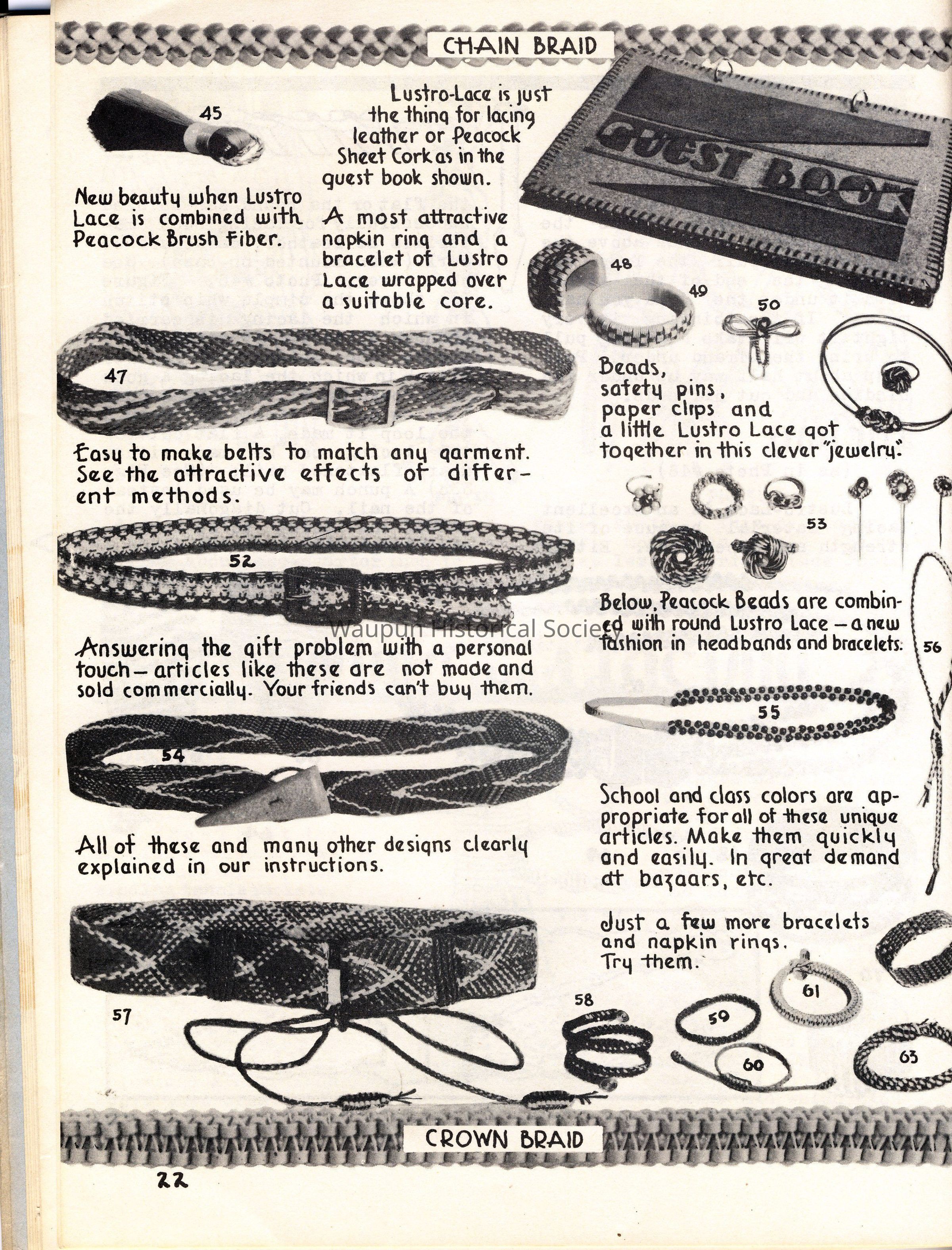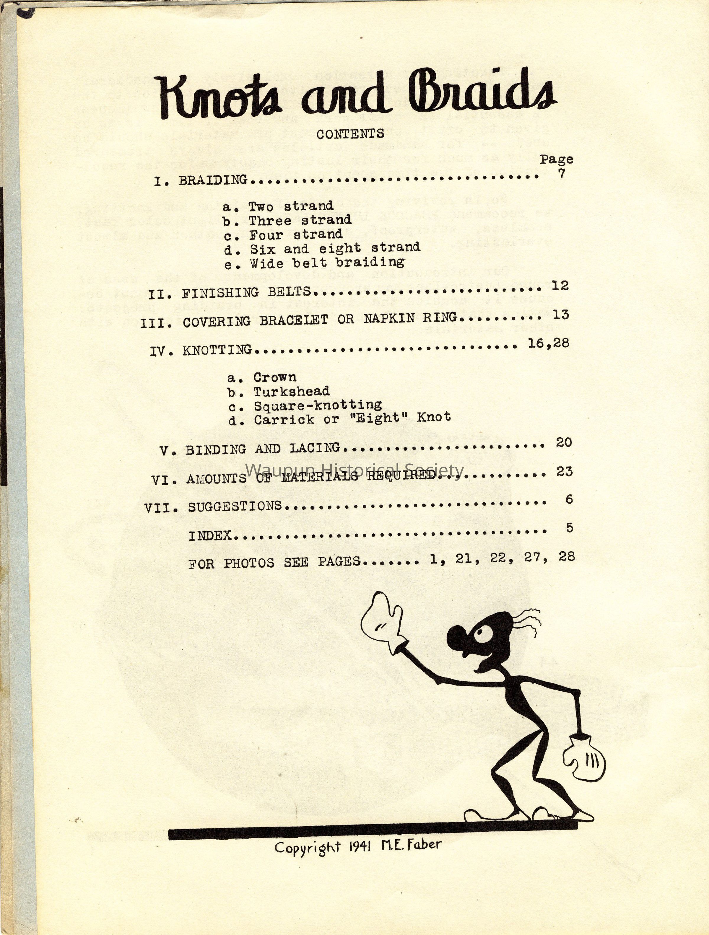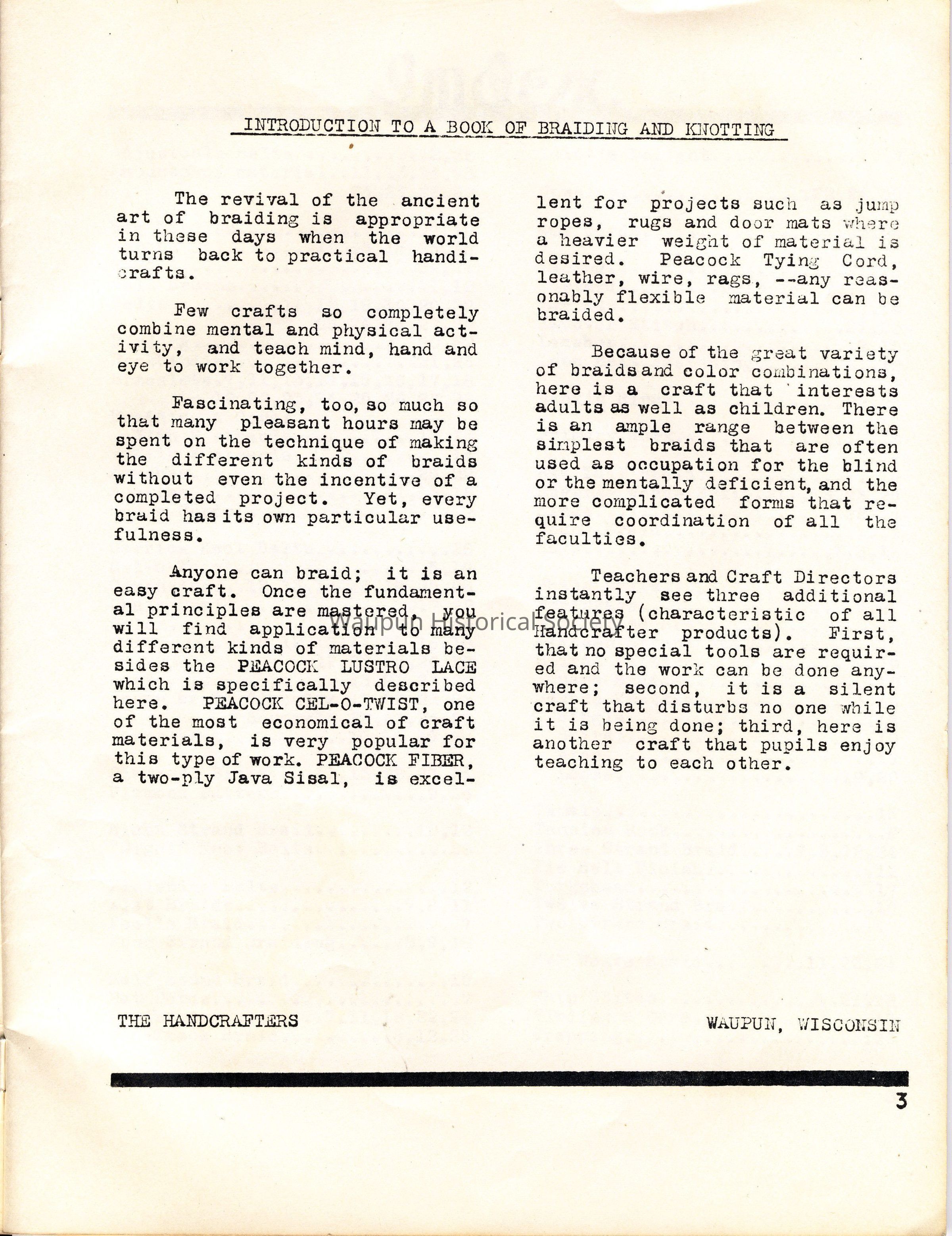 Booklet published by Handcrafters of Waupun. This is an instruction booklet for making belts and bracelets or napkin rings. It tells how to braid, knot, bind and lace. Has photos. The book has not been OCRed. When published there was a 50 cents charge.Acquisition