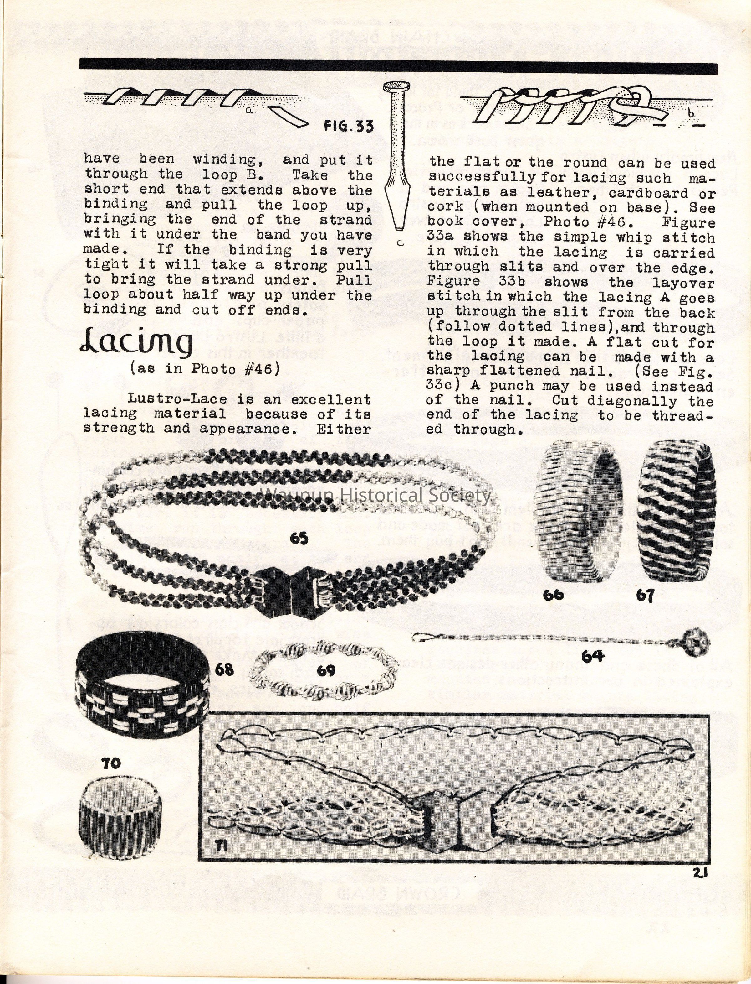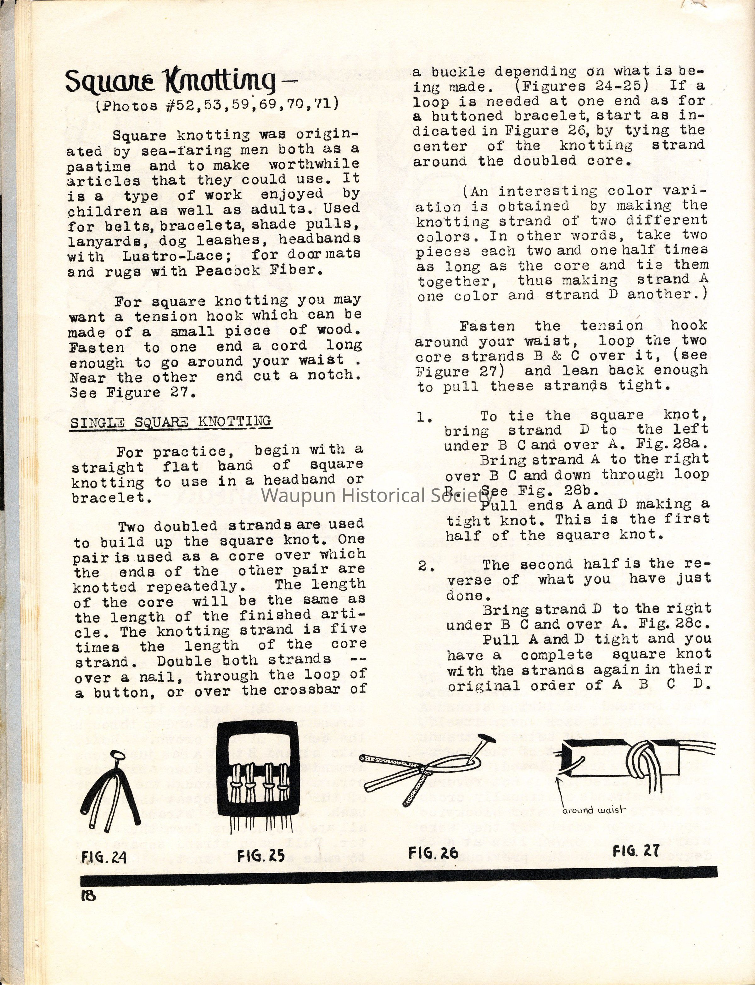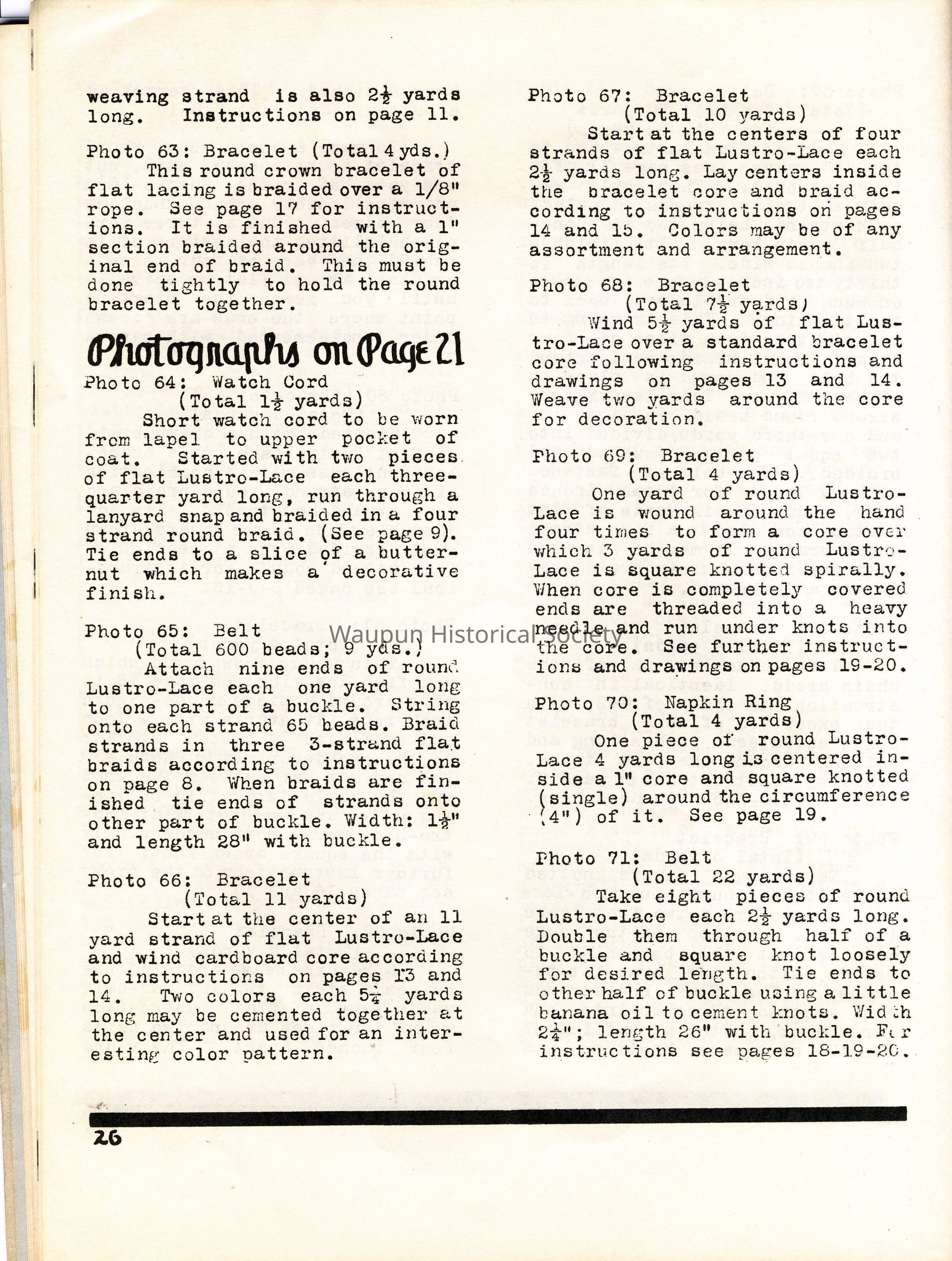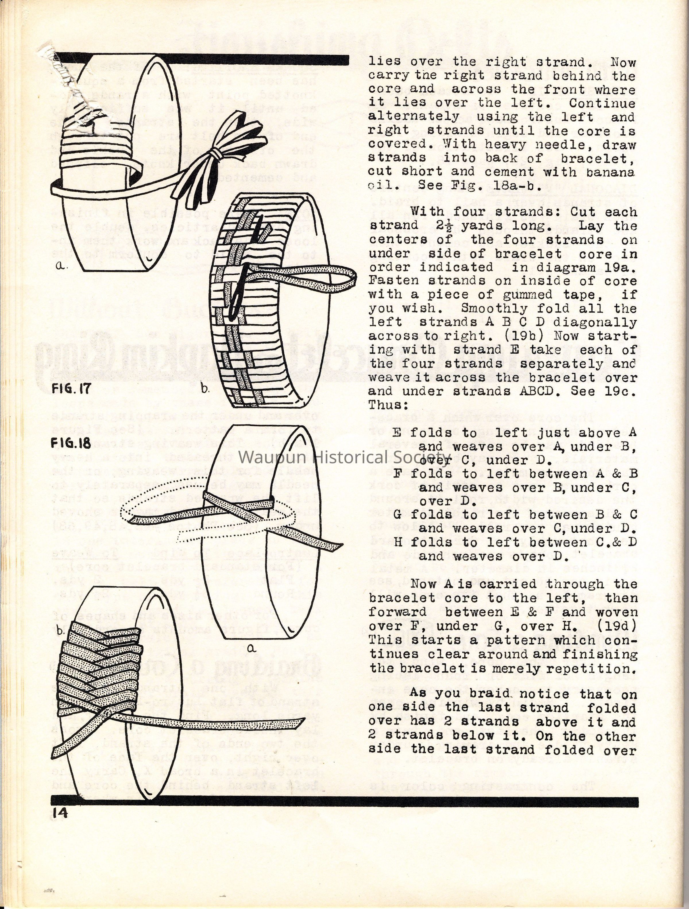 Booklet published by Handcrafters of Waupun. This is an instruction booklet for making belts and bracelets or napkin rings. It tells how to braid, knot, bind and lace. Has photos. The book has not been OCRed. When published there was a 50 cents charge.Acquisition