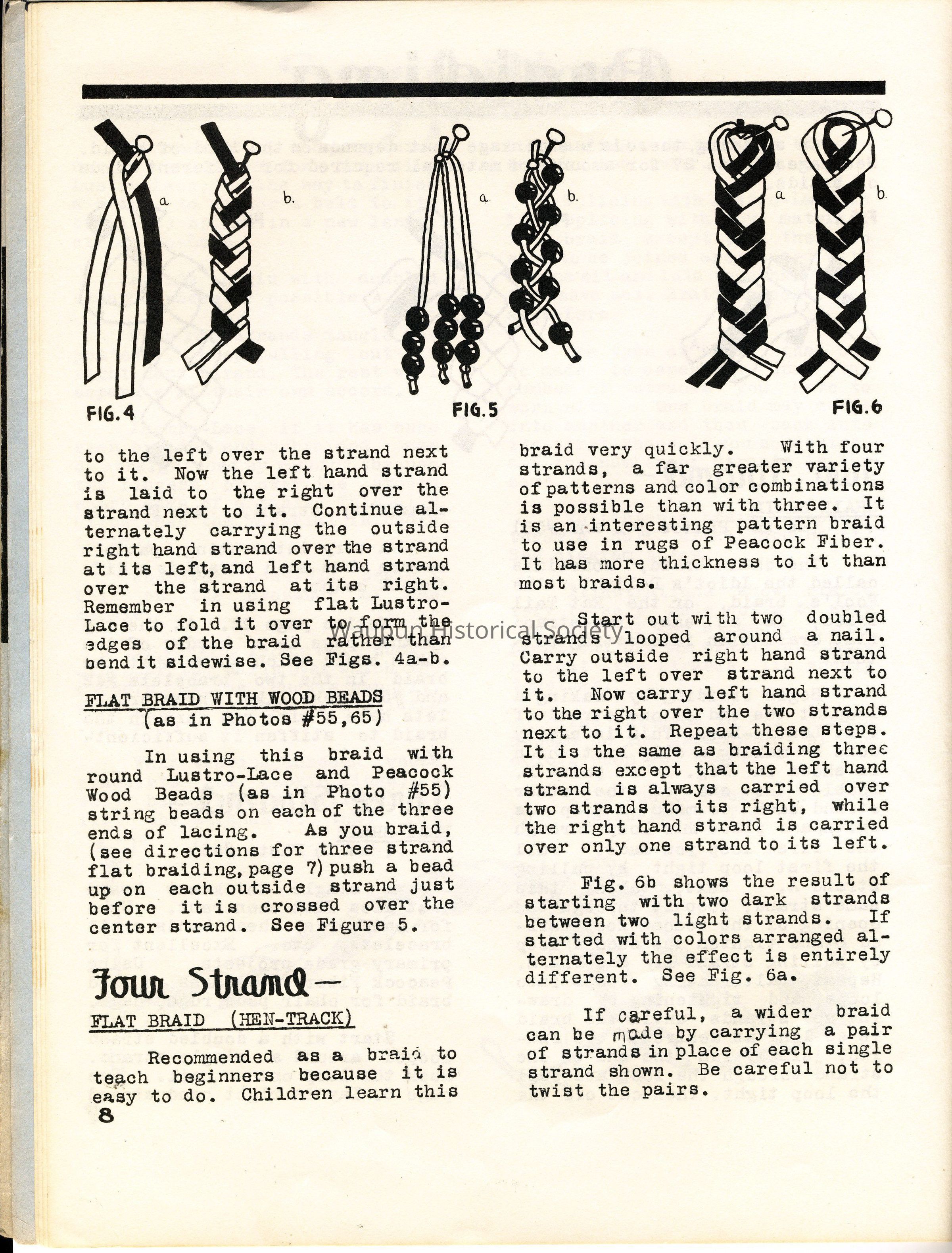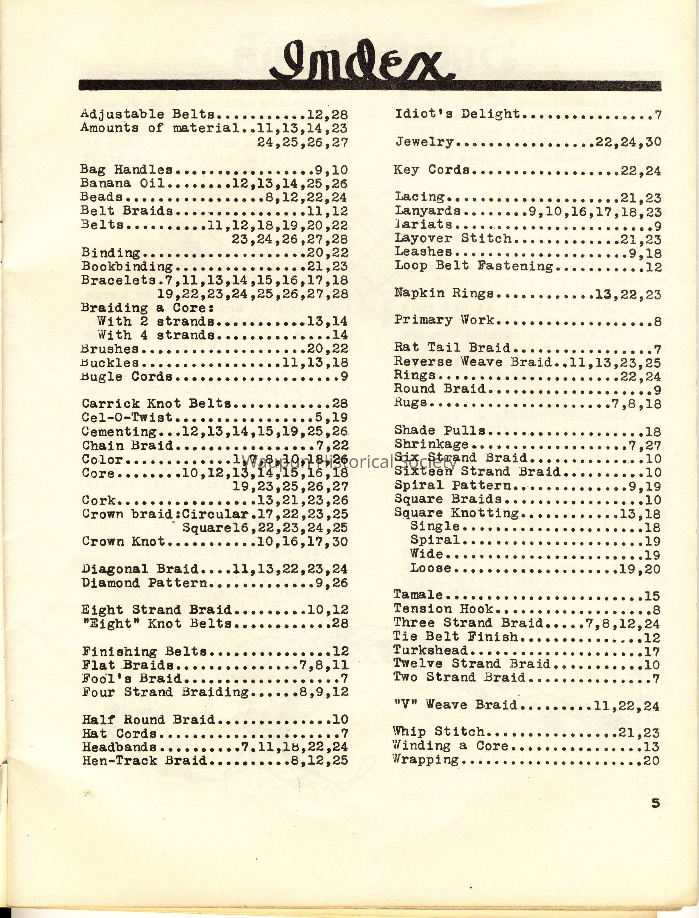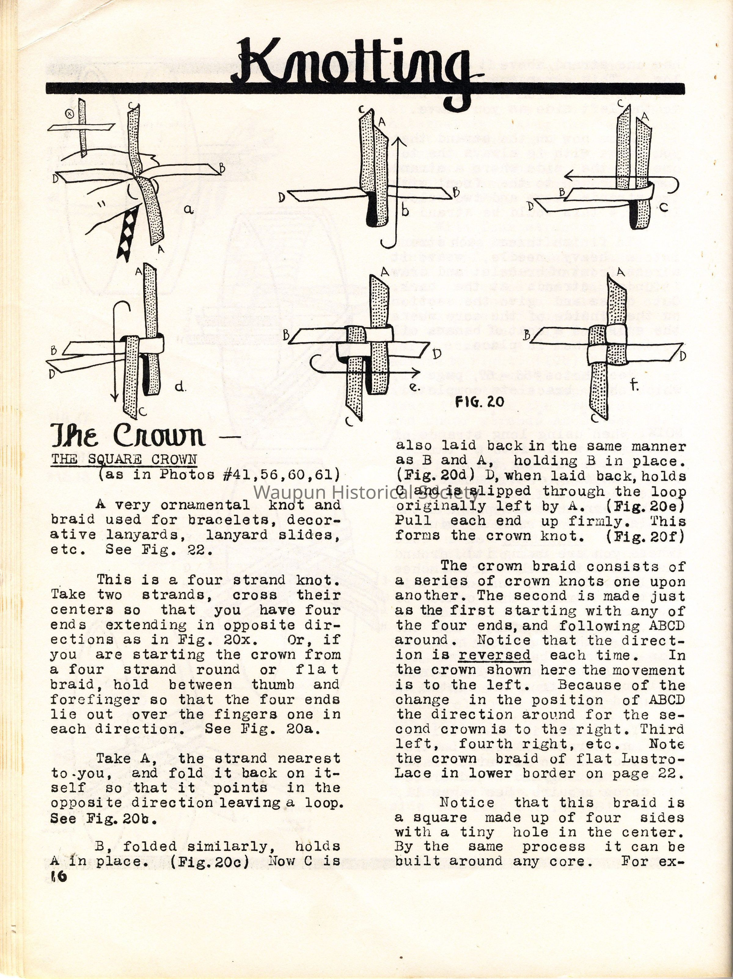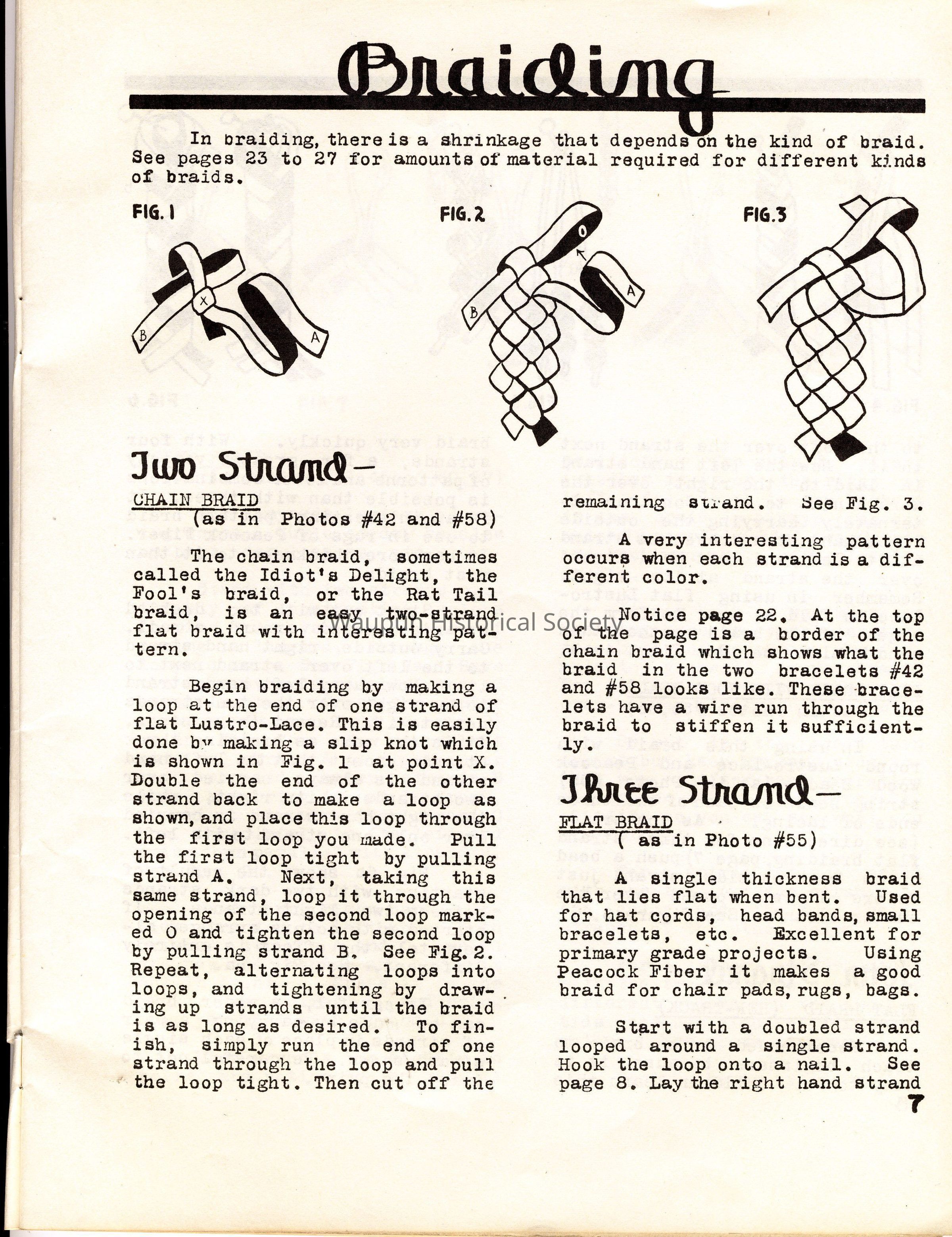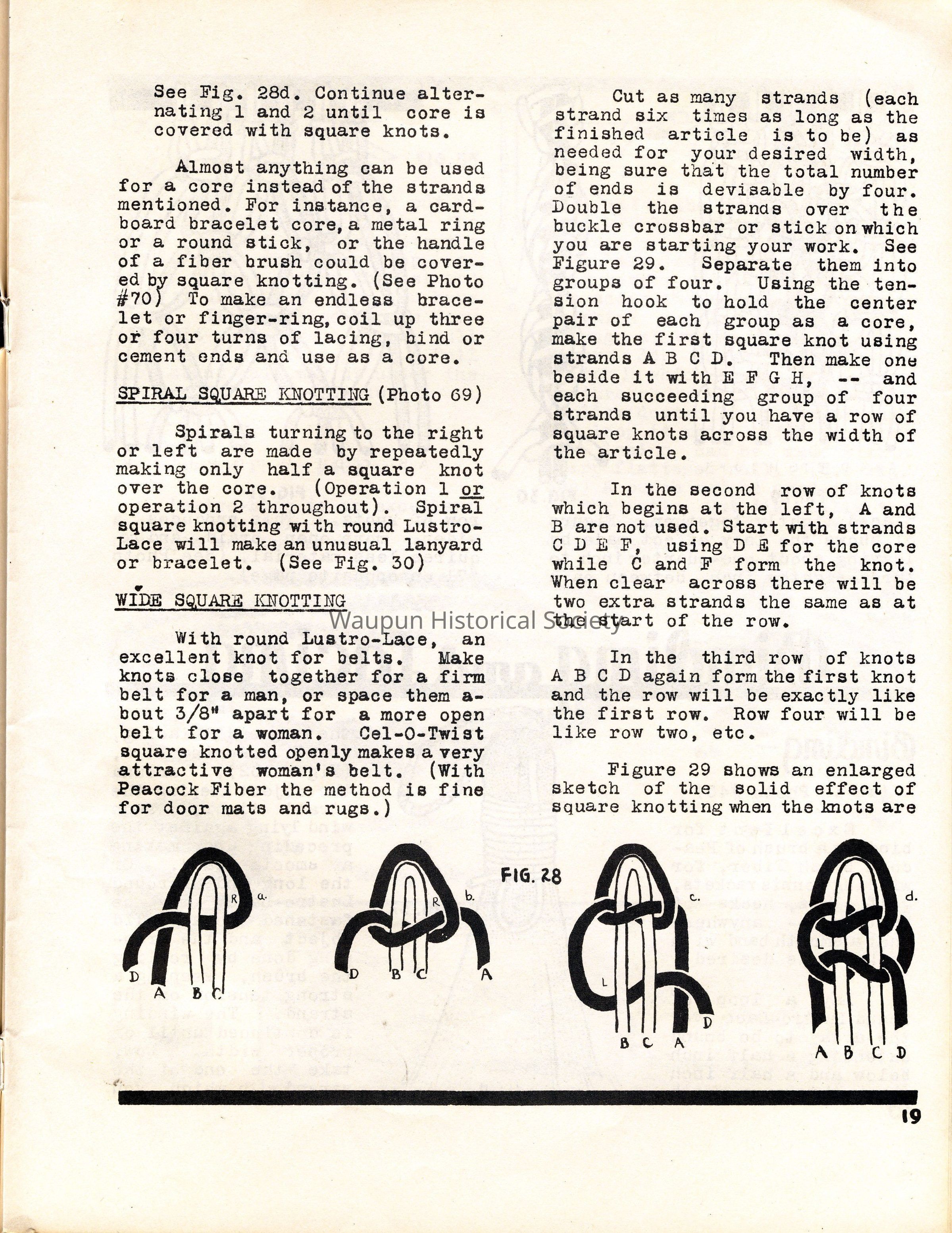 Booklet published by Handcrafters of Waupun. This is an instruction booklet for making belts and bracelets or napkin rings. It tells how to braid, knot, bind and lace. Has photos. The book has not been OCRed. When published there was a 50 cents charge.Acquisition