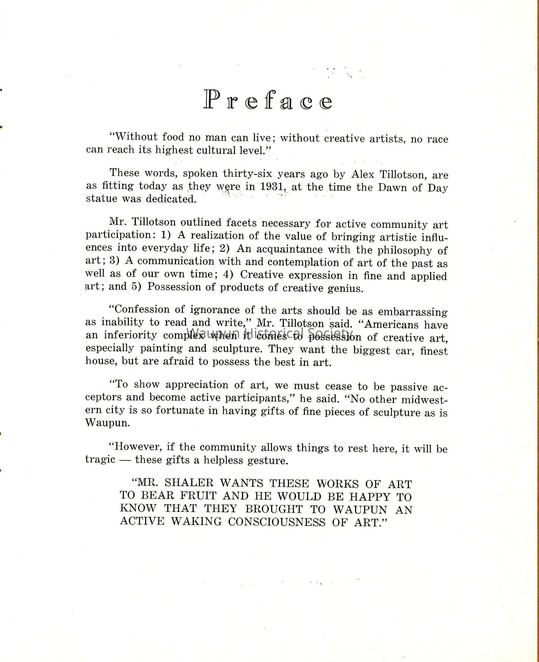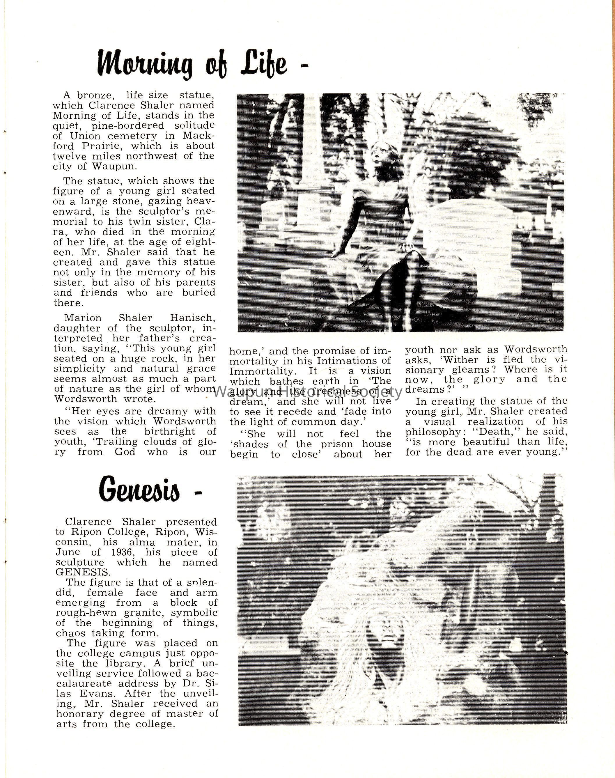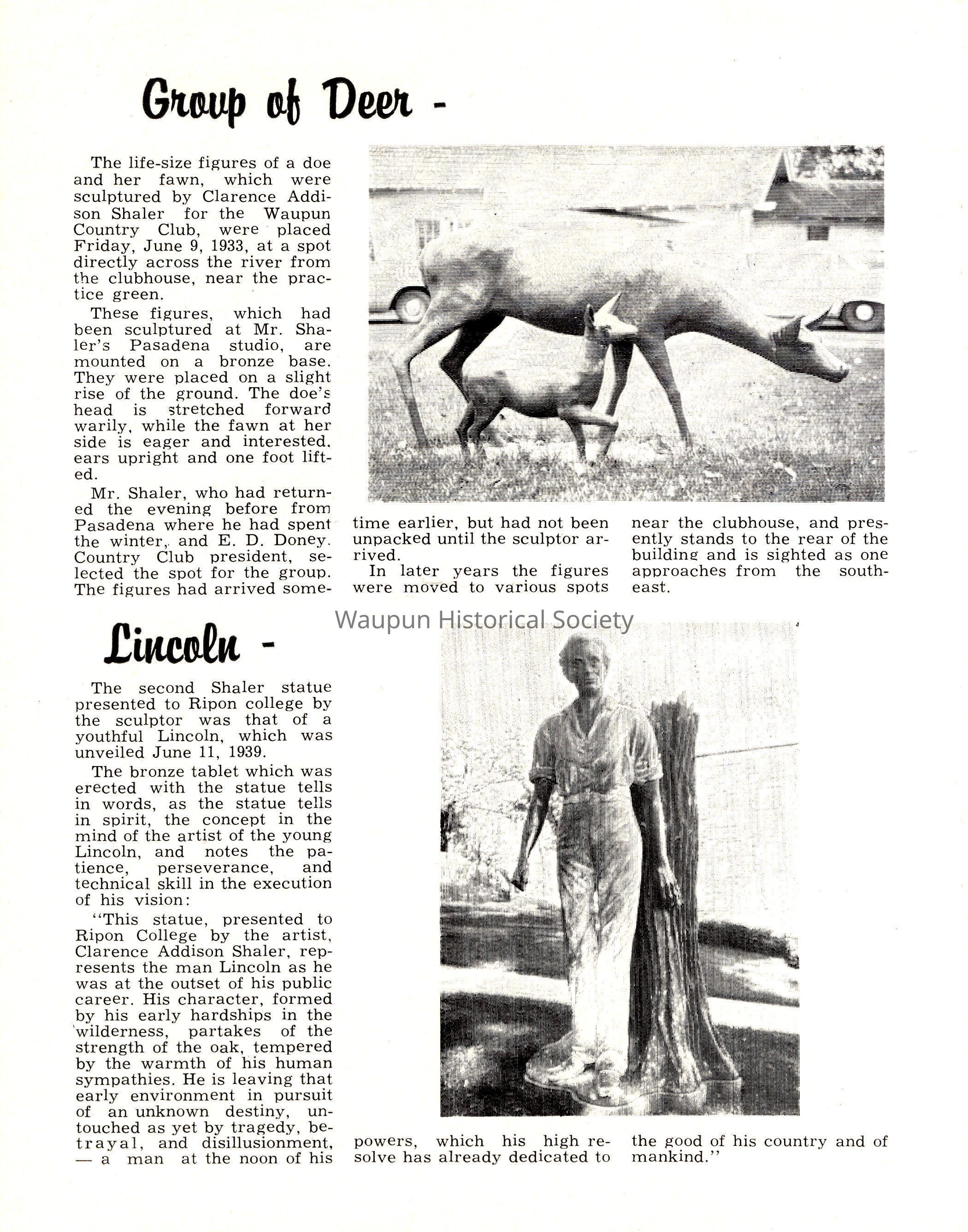 As the years passed, Mr. Shaler brought to Waupun piece after piece of sculpture, some of his own work, others the work of world-famous American sculptors, until this community could be called the sculpture Mecca of the Midwest.