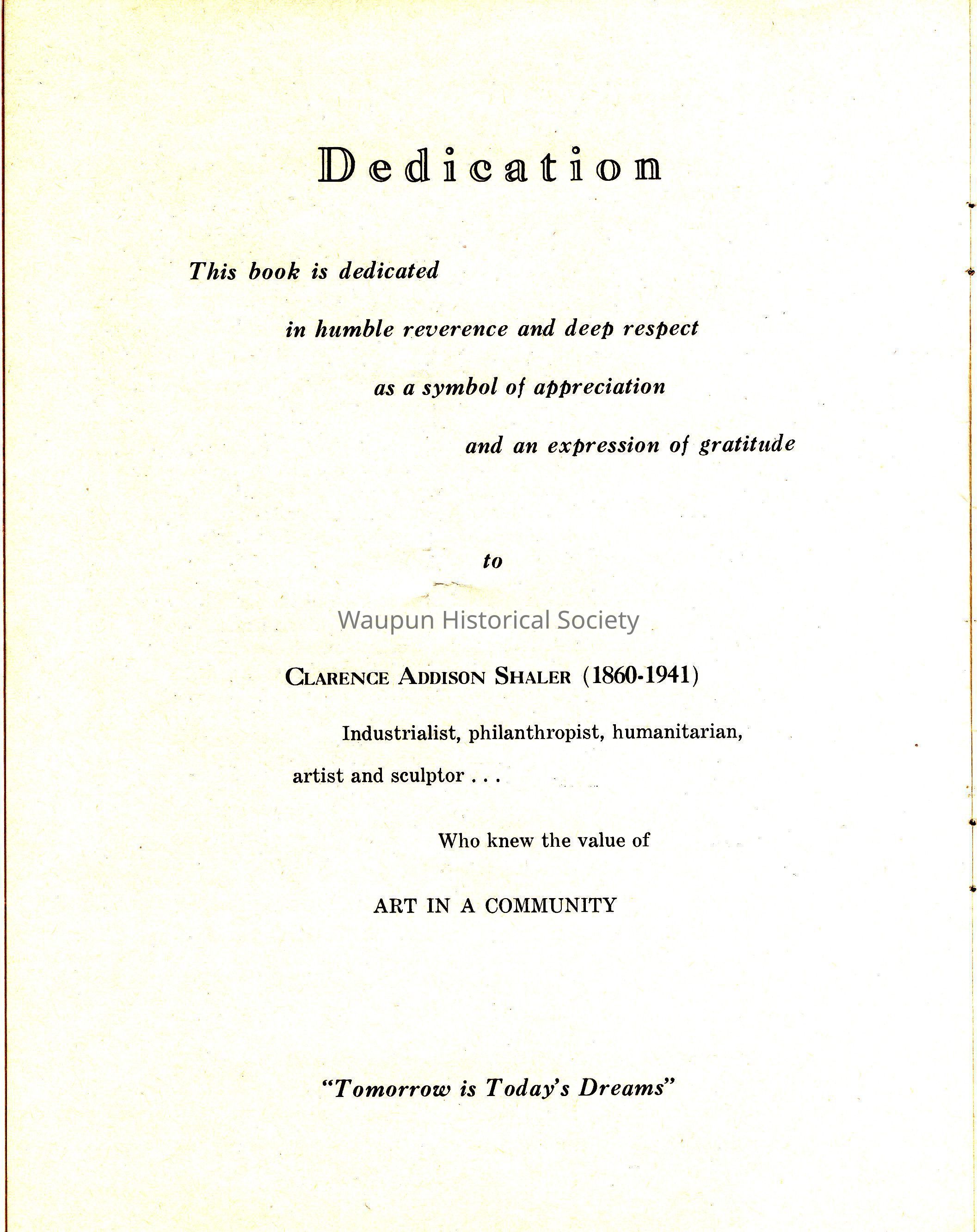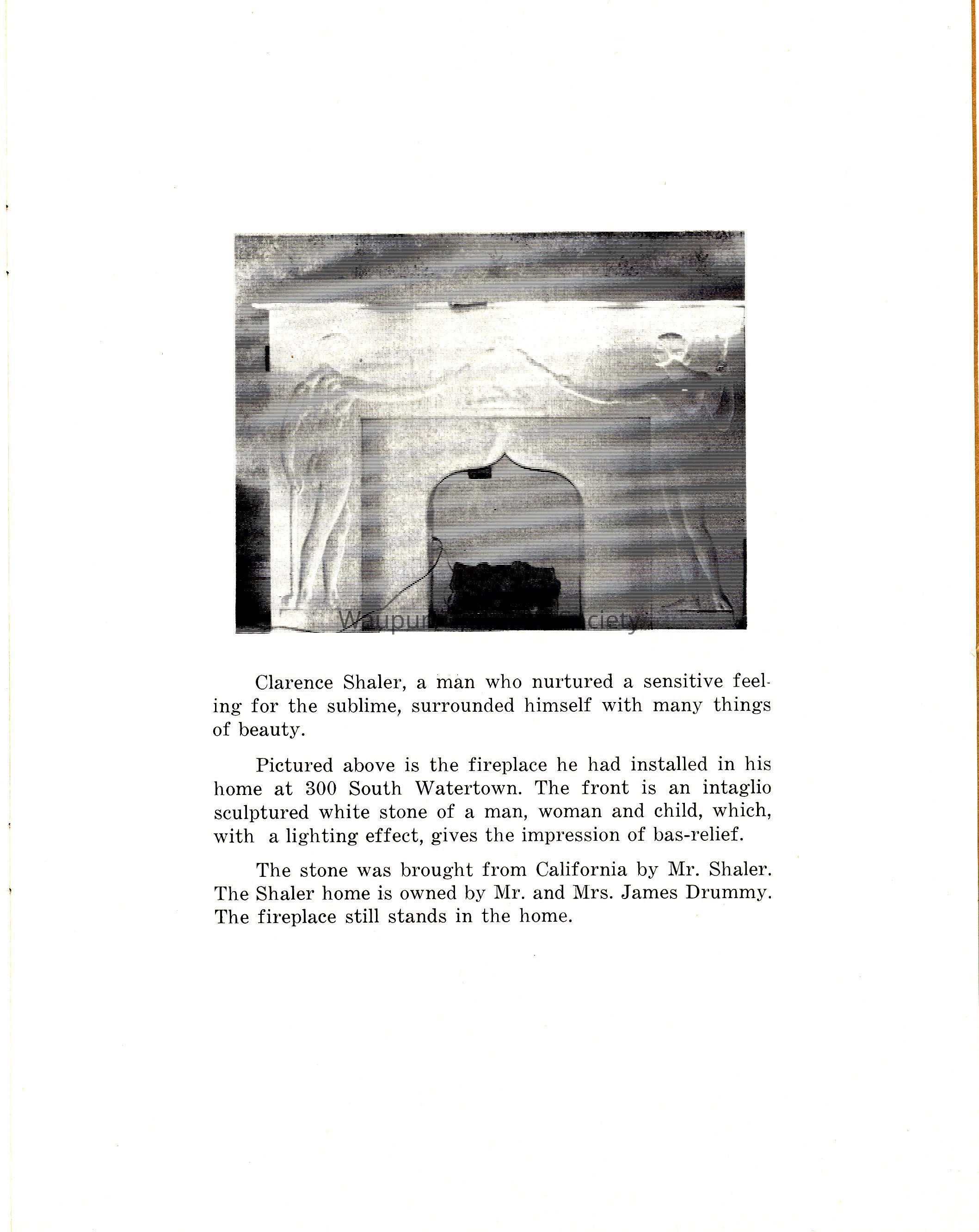 Clarence Addison Shaler, who had the courage to take up sculpturing at the age of 70, not only sculpted the day dreams of his imaginative and inventive life, but sculpted a priceless heritage for the people of Wisconsin and especially for the community of Waupun.