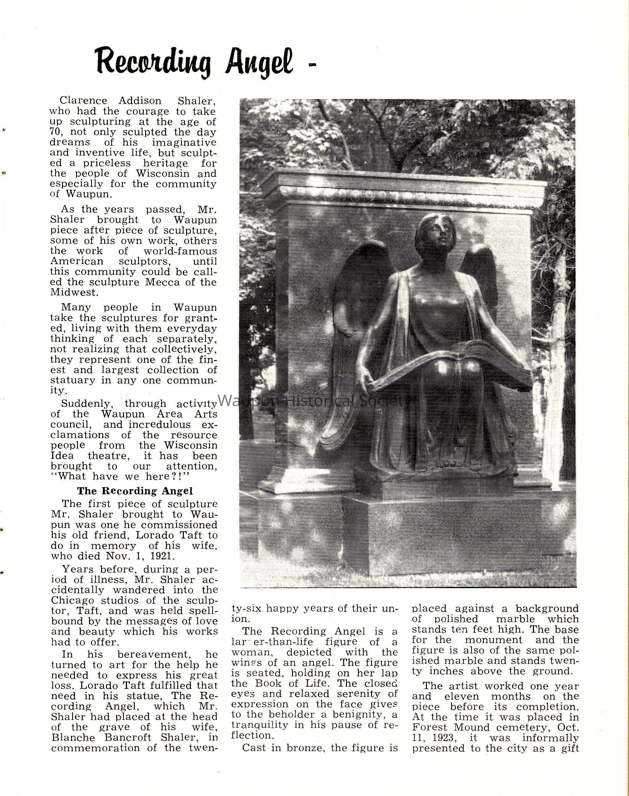The placing of The Recording Angel in Waupun, where thousands of visitors feel a benediction in the outstretched wings and the solace of renewed conviction transcend from the Eternal Book, marked the beginning of an era when Mr. Shaler was to give to its people the gifts of an art which will outlive their lifetime, that of their children, and of their children's children.